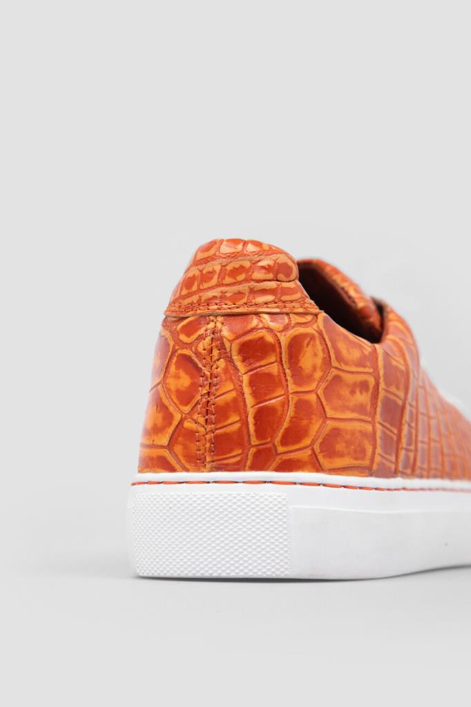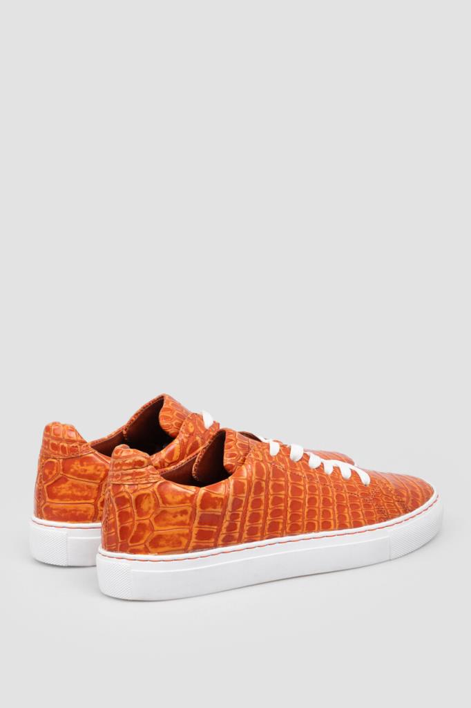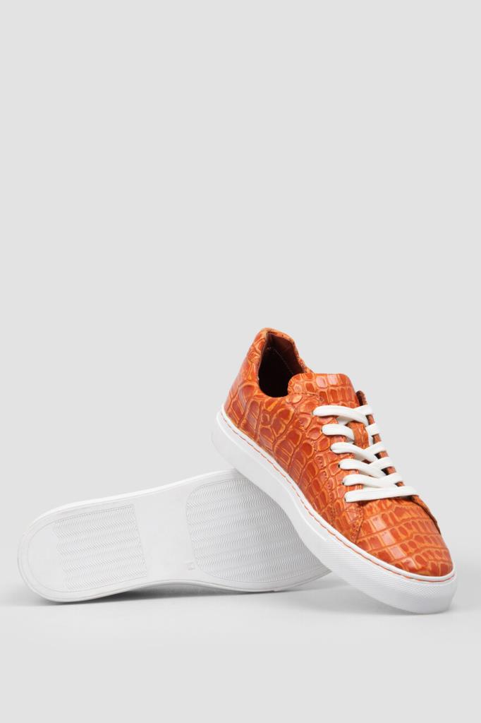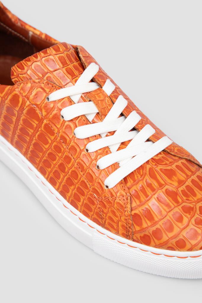 Кожаные кеды Bardini на прошитой белой подошве из полиуретана. Удобная пара выполнена в ярком оранжевом оттенке с естественным чешуйчатым рисунком на поверхности. Модель дополнена перекрёстной многорядной шнуровкой и внутренней отделкой из тонкой телячьей кожи и бархатистой замши.