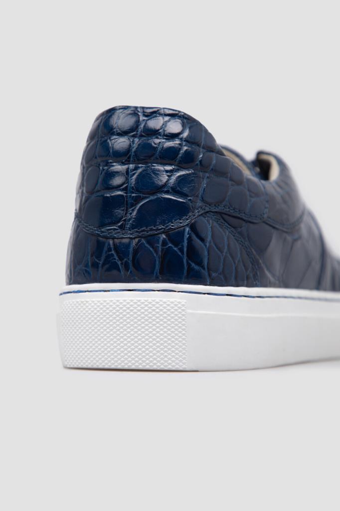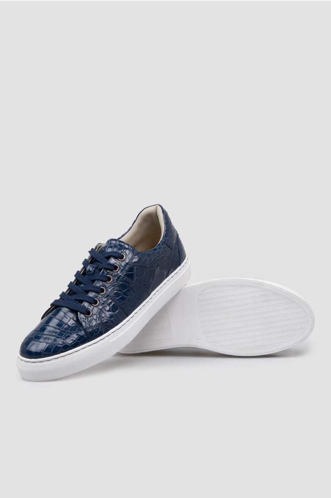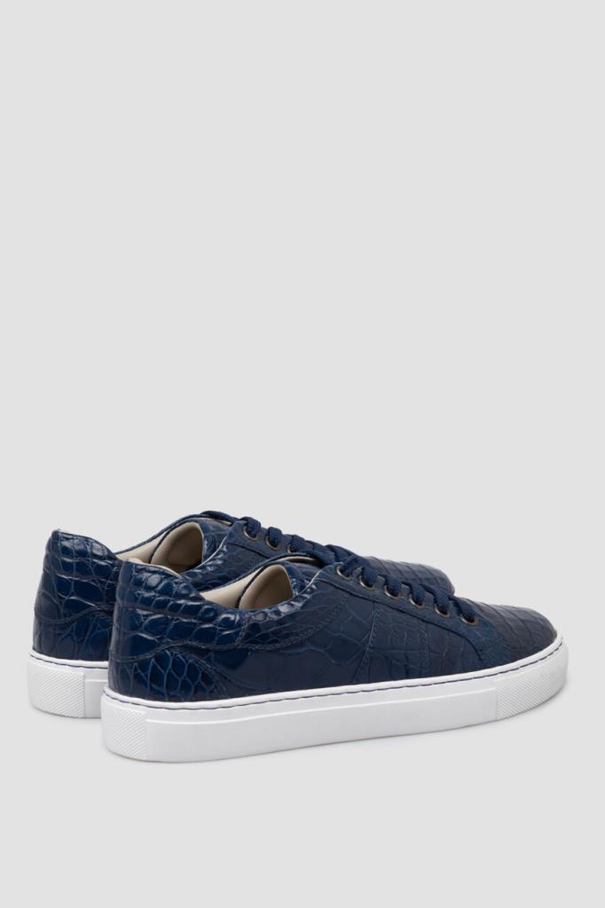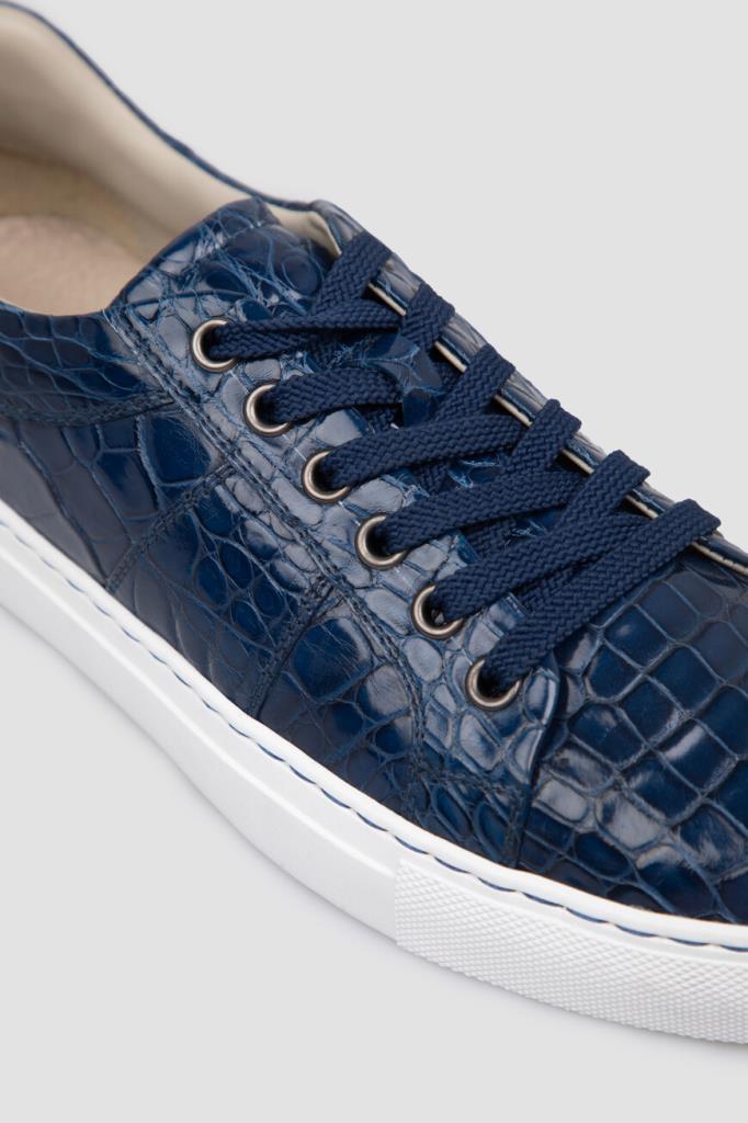 Кеды Bardini с внутренней отделкой из тонкой телячьей кожи и бархатистой замши. Для создания изделия с широкой колодкой выбрана мягкая кожа крокодила тёмно-синего оттенка с характерной чешуйчатой текстурой. Открытая перекрёстная шнуровка с люверсами из серебристого металла обеспечивает комфортную посадку пары на ноге, а рифление снизу на плоской белой подошве - надёжное сцепление с дорогой.