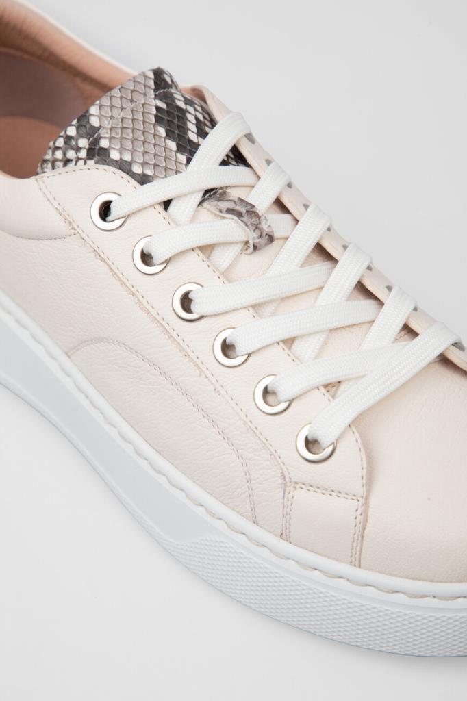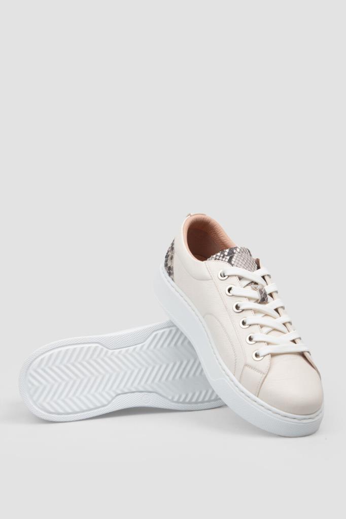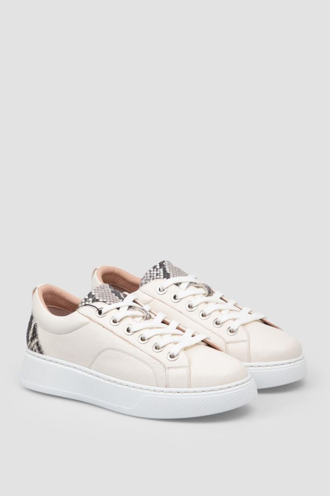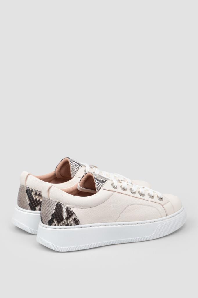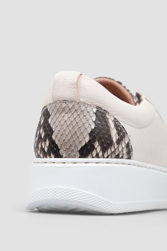 Комбинированные кеды Bardini с лентой для удобства надевания в задней части. Для создания изделия используется матовая кожа козы светло-бежевого оттенка с разноцветными вставками из кожи питона с характерным природным рисунком на язычке и заднике. Модель установлена на плоскую белую подошву из полиуретана с рифлением снизу для дополнительной устойчивости.