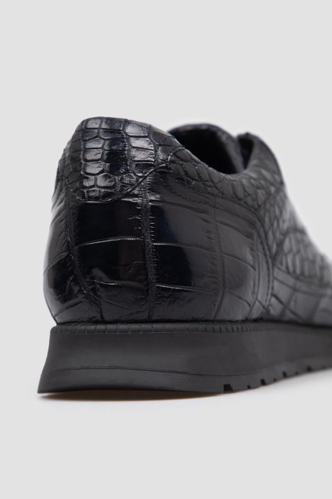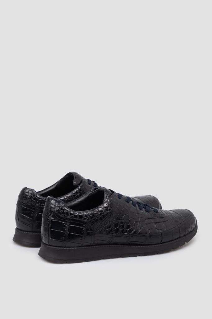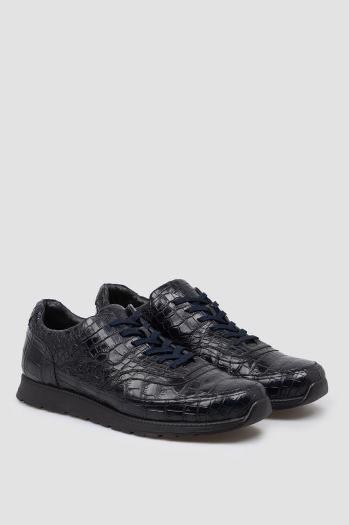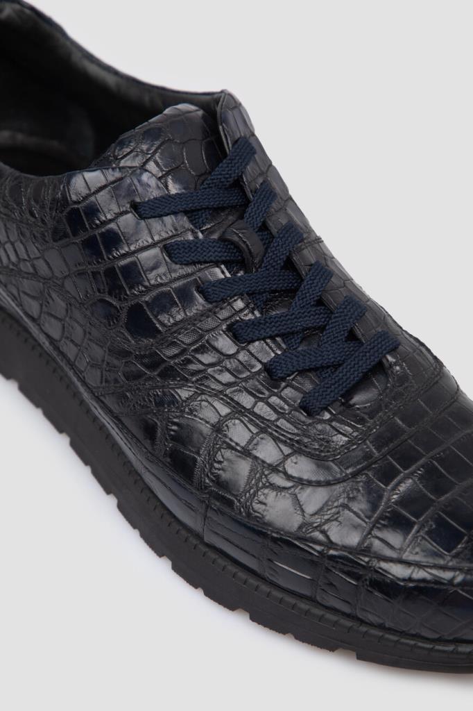 Кроссовки Bardini с закрытым типом шнуровки. Модель изготовлена из мягкой кожи нильского крокодила с характерной чешуйчатой текстурой. Изделие тёмно-синего цвета с укреплённым округлым носком комфортно ощущается на ноге и не скользит на мокрых поверхностях благодаря объёмной протекторной подошве из полиуретана.