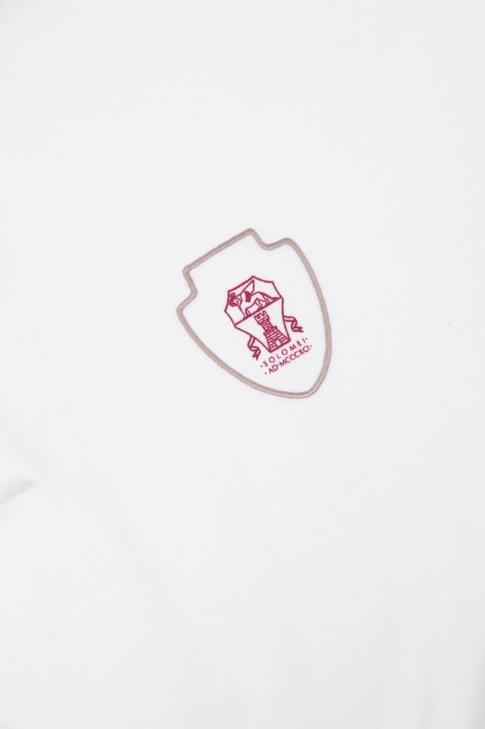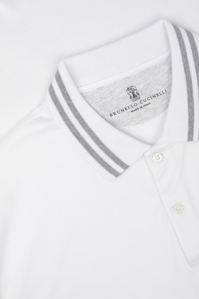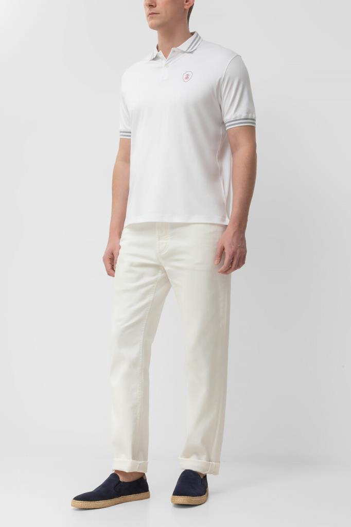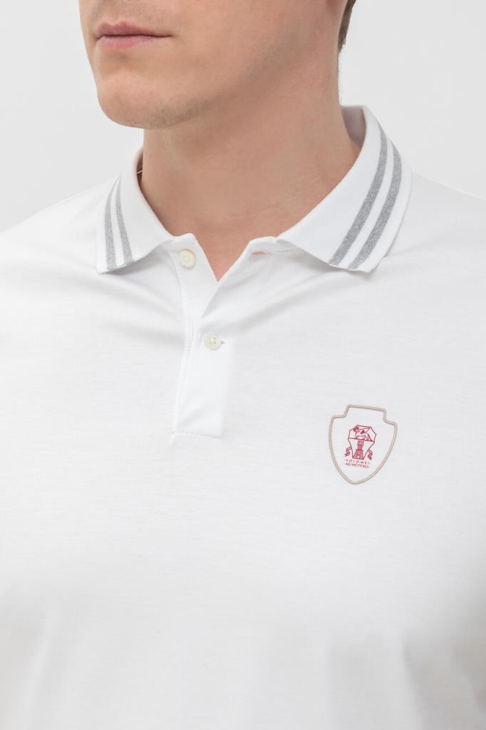 Прямое поло белого цвета от BRUNELLO CUCINELLI. Модель сшита из мягкого хлопкового трикотажа и оснащена застёжкой на две перламутровые пуговицы. Отличительными особенностями изделия с короткими рукавами являются геометрический мотив в виде серых горизонтальных полос на отложном воротнике и манжетах и неглубокие боковые разрезы. Поло смотрится выигрышно в сочетании с джинсами на брендированных металлических пуговицах, покрытых планкой, из той же коллекции.