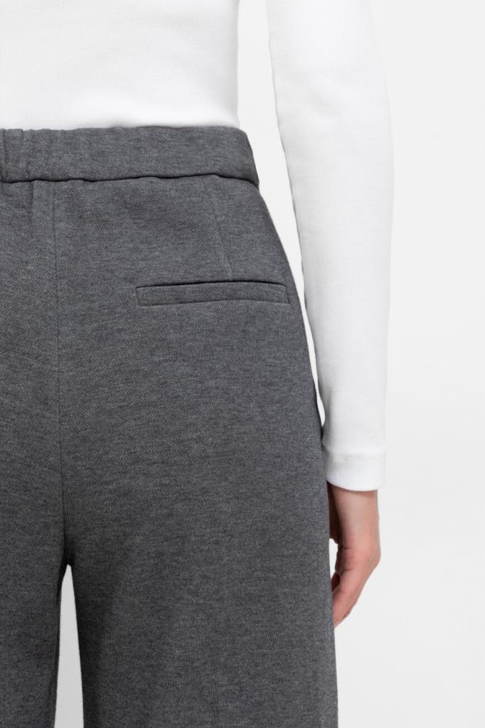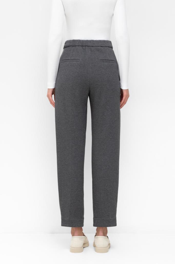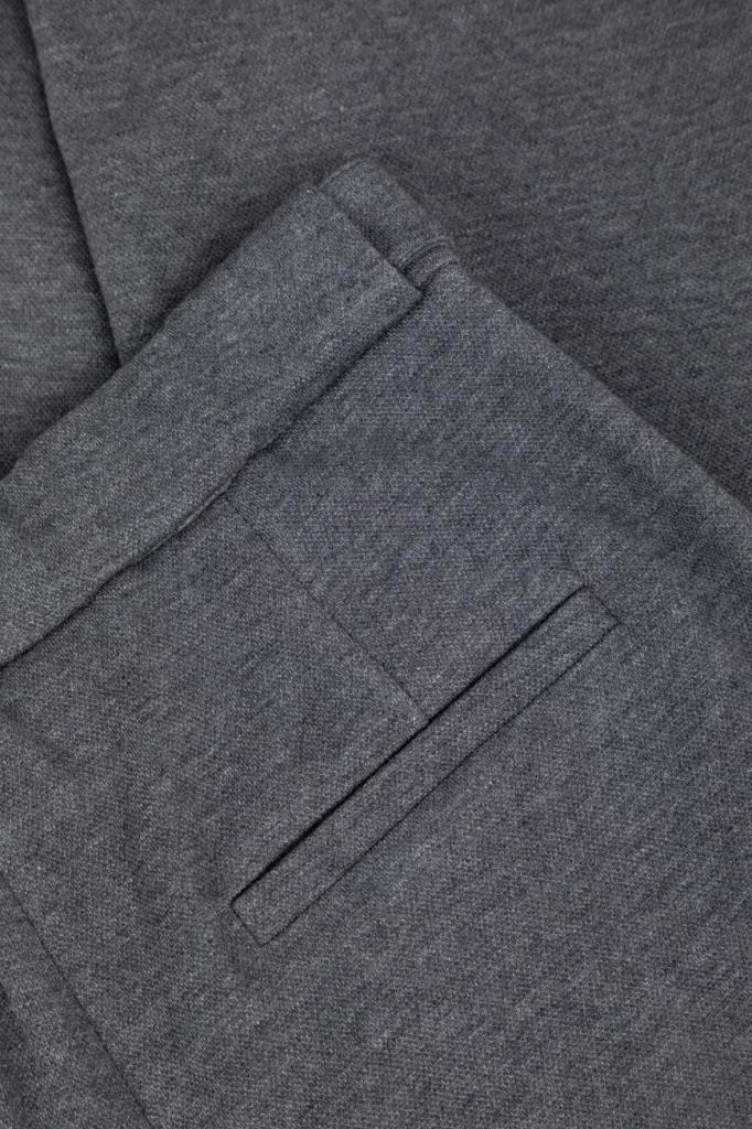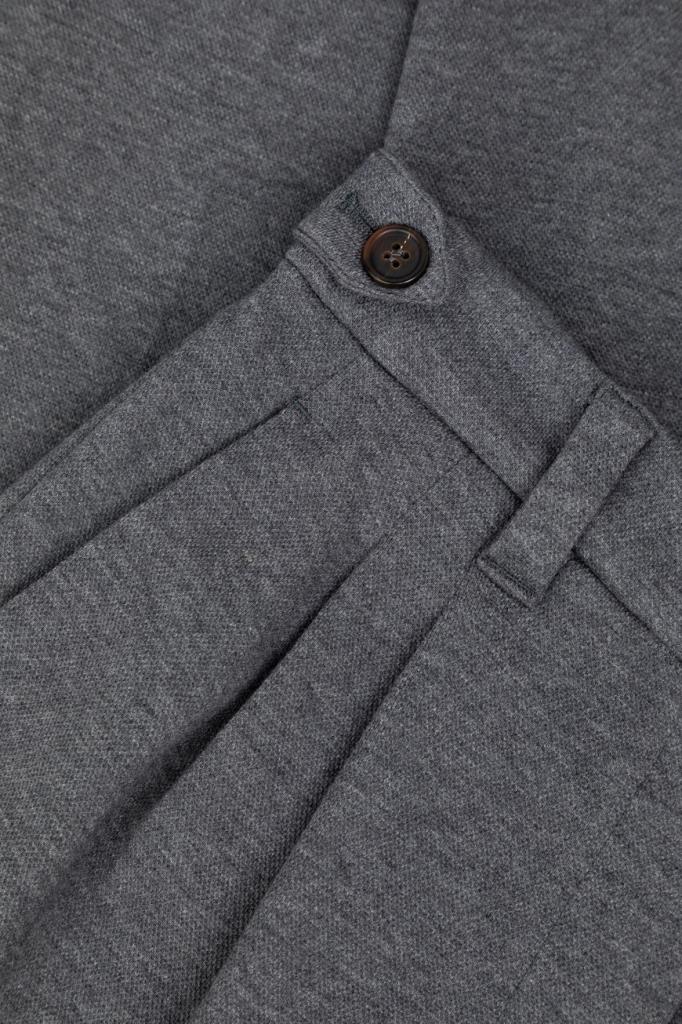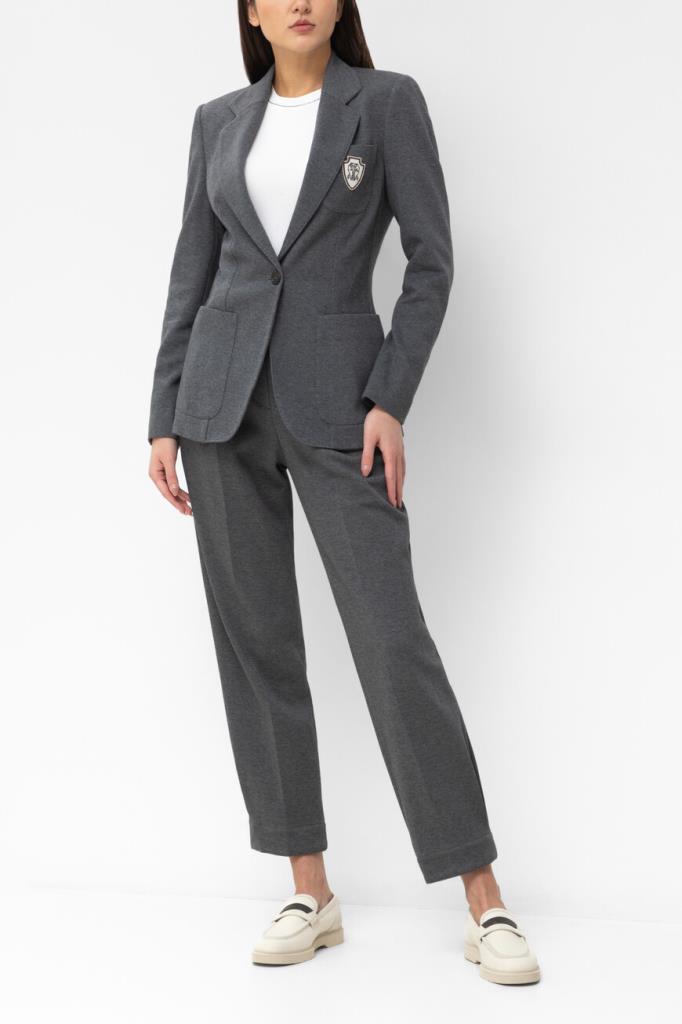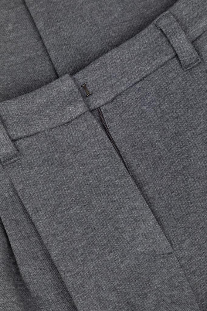 Трикотажные брюки BRUNELLO CUCINELLI на потайной молнии и крючке с планкой. Для создания изделия широкого, зауженного книзу кроя выбраны мягкий хлопок и прочный нейлон. Отличительными особенностями модели стали паты на крупной роговой пуговице по бокам, классические стрелки и двойные защипы сверху, формирующие силуэт, и боковые складки. Укороченные брюки станут основой образа в стиле smart casual с парным жакетом тёмно-серого цвета из той же коллекции.