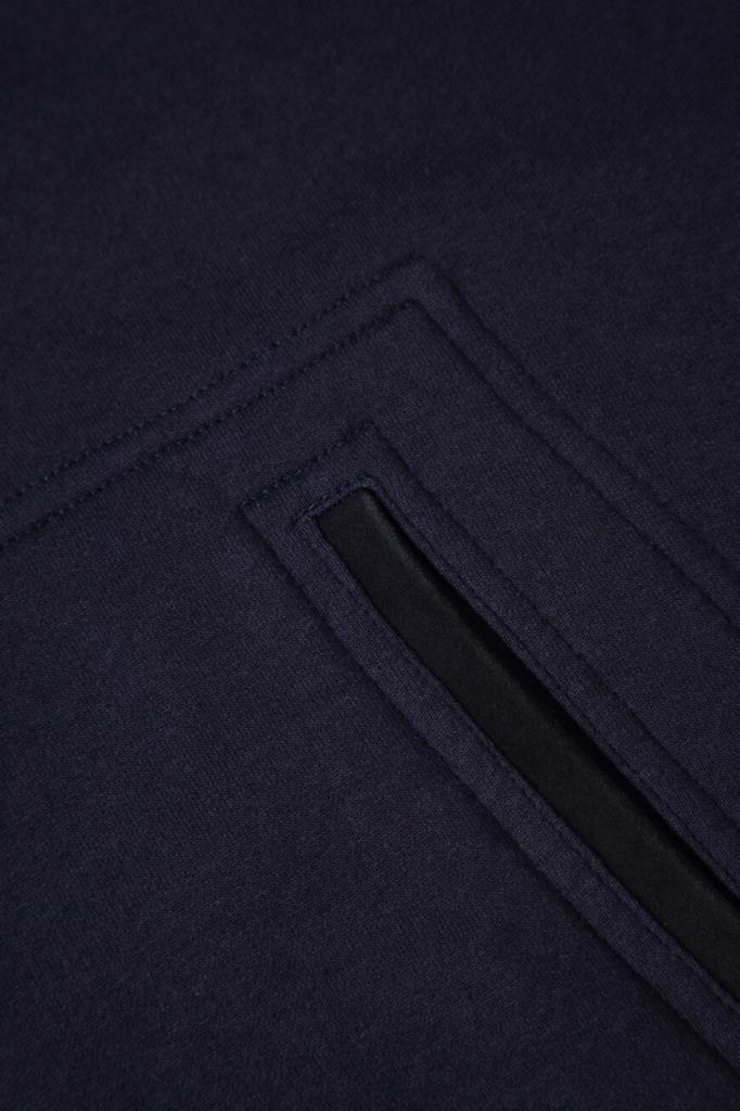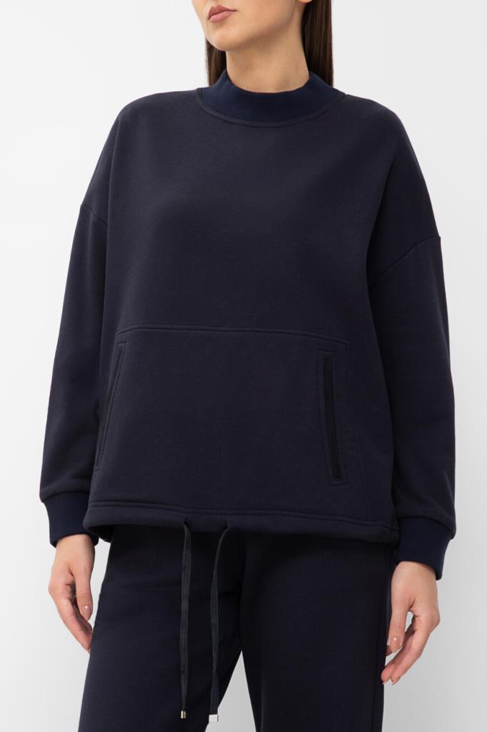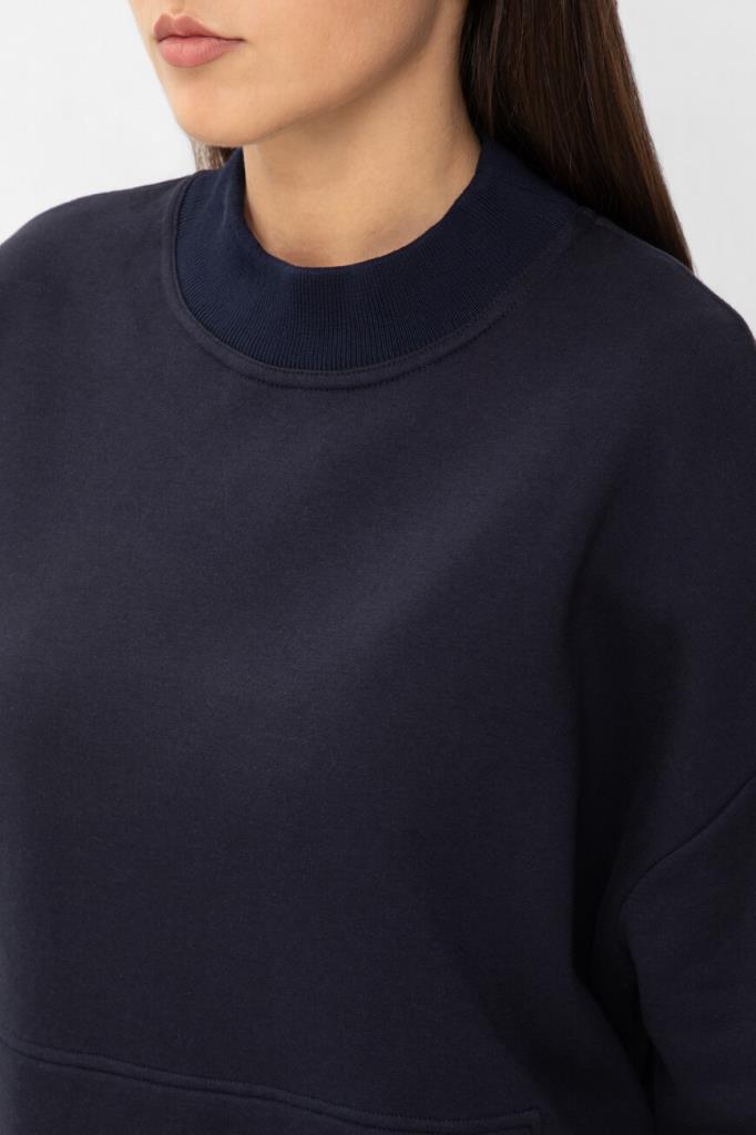 Женский свитшот Kiton из мягкого плотного трикотажа на основе хлопка и фирменного кашемира тёмно-синего цвета. Модель комфортного прямого кроя с длинными рукавами с манжетами на резинке, круглым вырезом горловины с широким воротом с фактурой в рубчик и удобным карманом-кенгуру. Низ изделия подобран на кулиску.