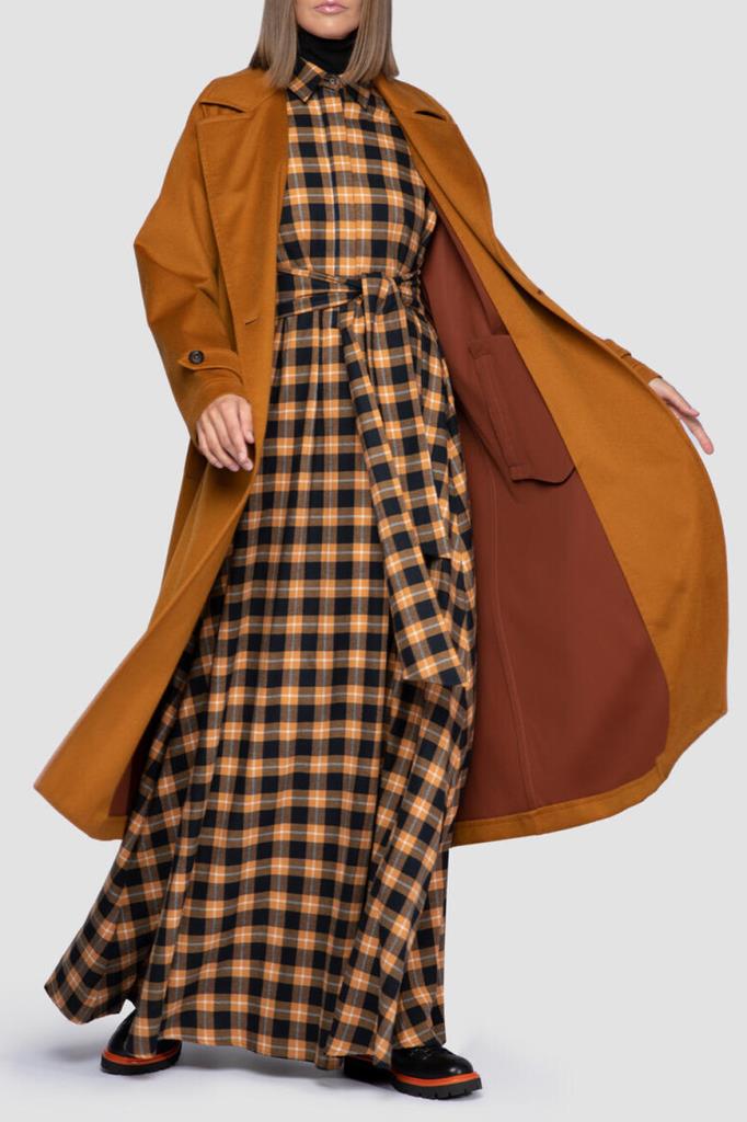 Роскошное женское пальто Kiton из мягкого фирменного кашемира универсального коричневого оттенка. Длинная двубортная модель комфортного прямого кроя, с прямоугольными лацканами, изящным V-образным вырезом горловины, длинными рукавами с хлястиками на пуговице, двумя прорезными карманами по бокам и шлицей сзади. Изделие дополнено контрастной тёмно-коричневой изнаночной стороной и стильным съёмным поясом для фиксации из той же ткани в тон.