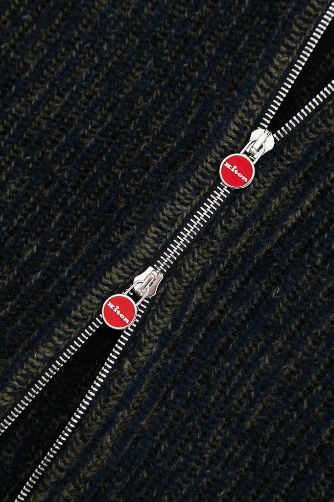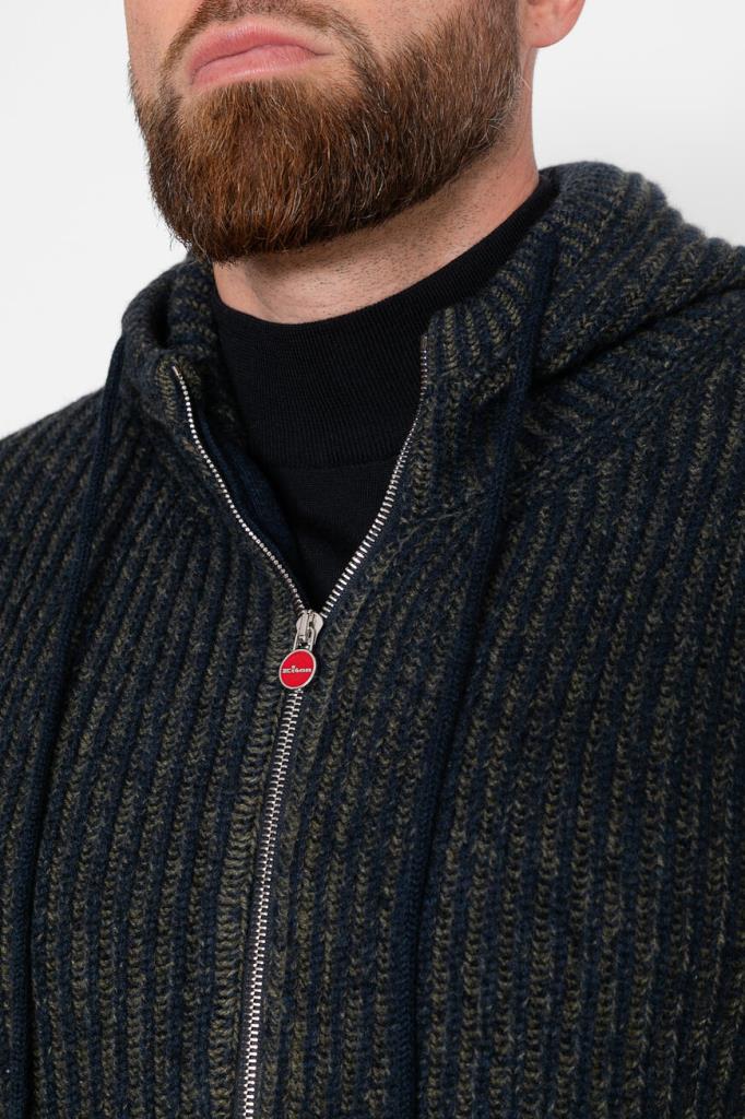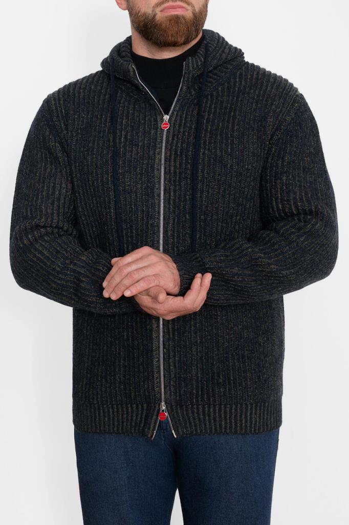 Вязаный кардиган Kiton с объёмным капюшоном на завязках. Изделие выполнено из мягкого кашемира в сине-зелёной гамме. Фасон повседневной модели предполагает воротник-стойку и застёжку на молнию с двумя брендированными бегунками.