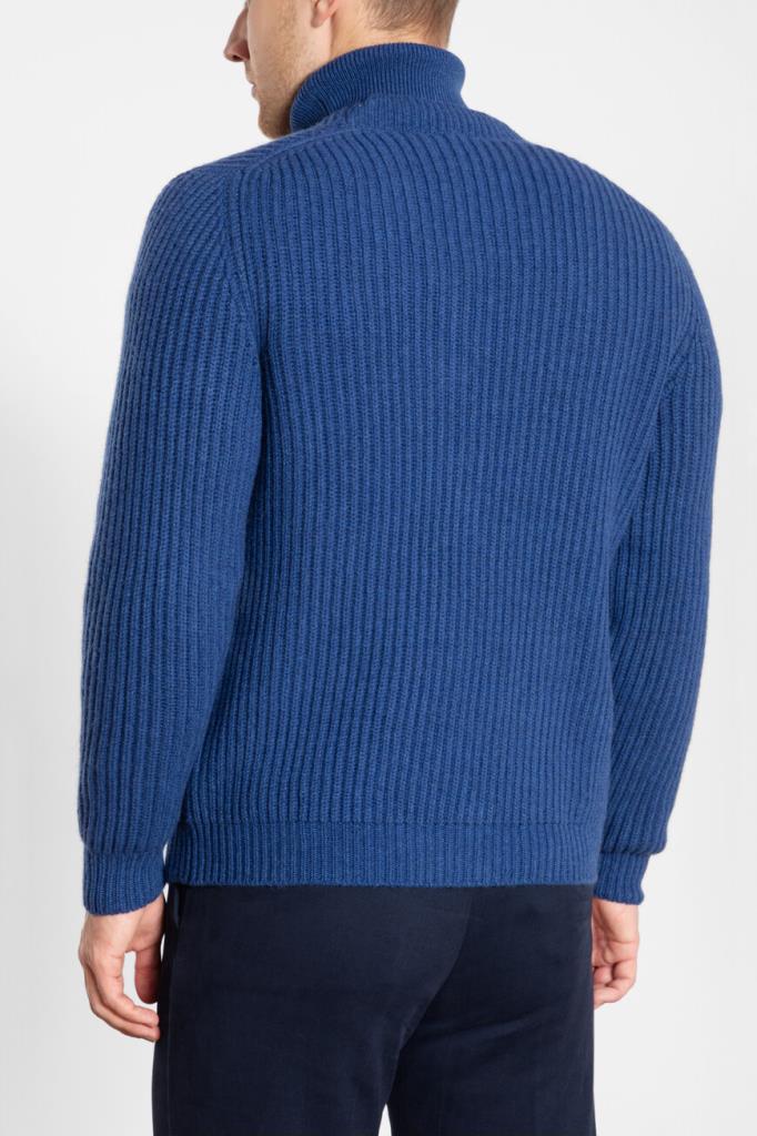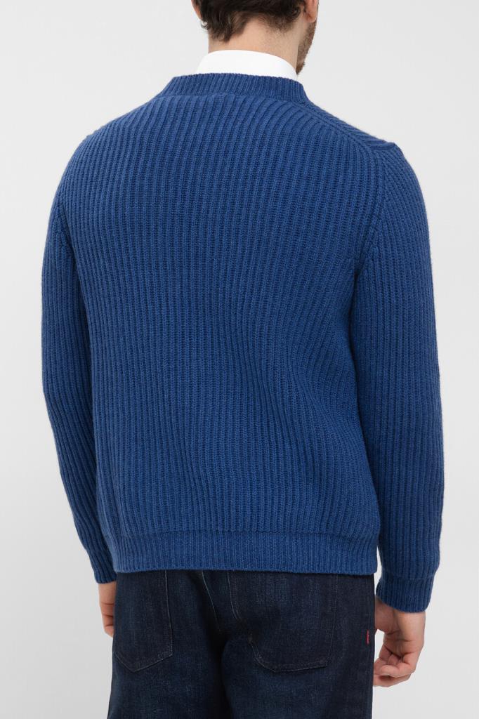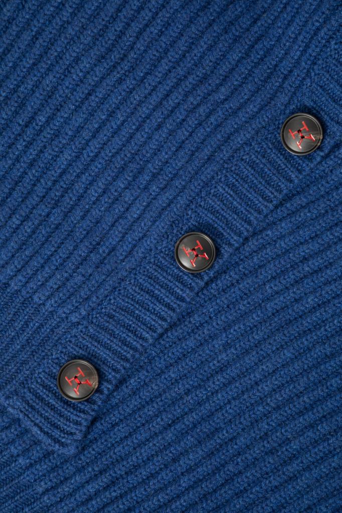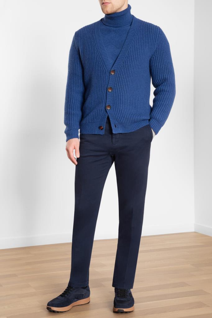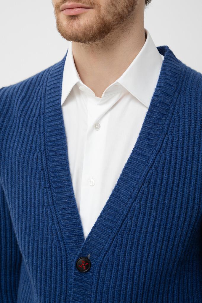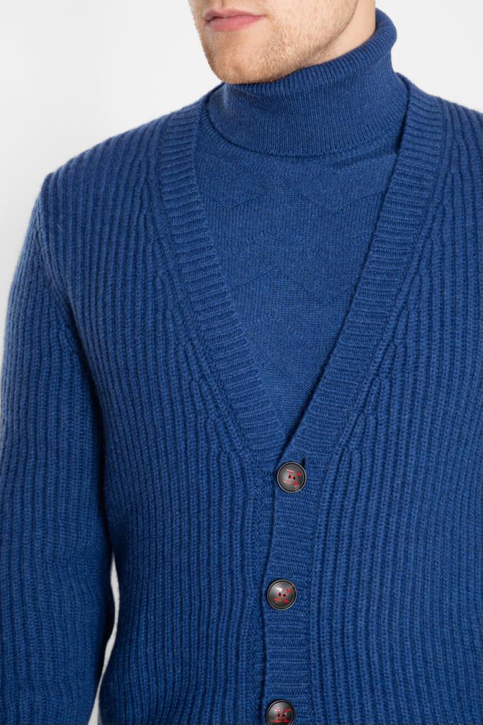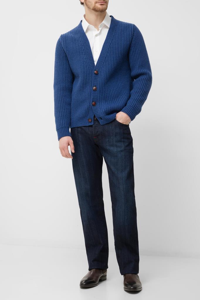 Синий кардиган Kiton может сыграть роль верхней одежды в период межсезонья. Повседневная модель с глубокой V-образной горловиной связана из мягкого кашемира рыбацкой резинкой и оснащена застёжкой на брендированные роговые пуговицы. Манжеты-резинки и широкий эластичный пояс обеспечивают комфортную посадку изделия по фигуре.