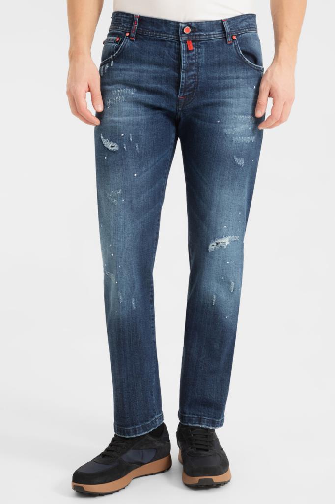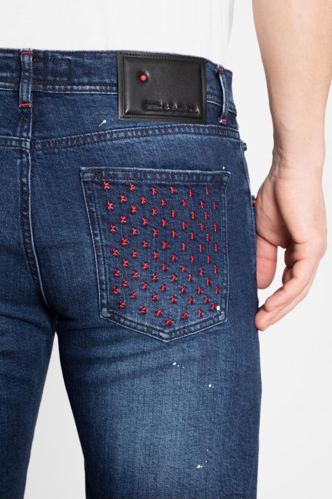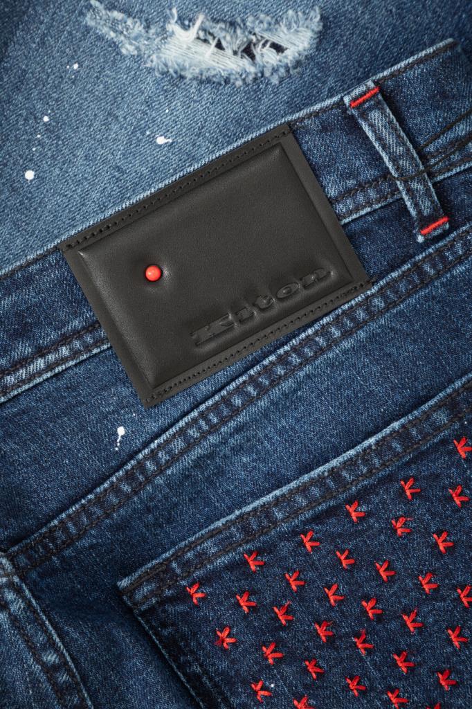 Тёмно-синие джинсы Kiton с брендированной вышивкой на задних карманах. Изделие выполнено из эластичного хлопкового денима с эффектом делаве и дизайнерскими разрывами. Отличительной деталью стала чёрная кожаная нашивка с тиснёным логотипом и красной точкой на поясе сзади. Шов-срез на коже закрашен вручную в стиле сумок Hermès.