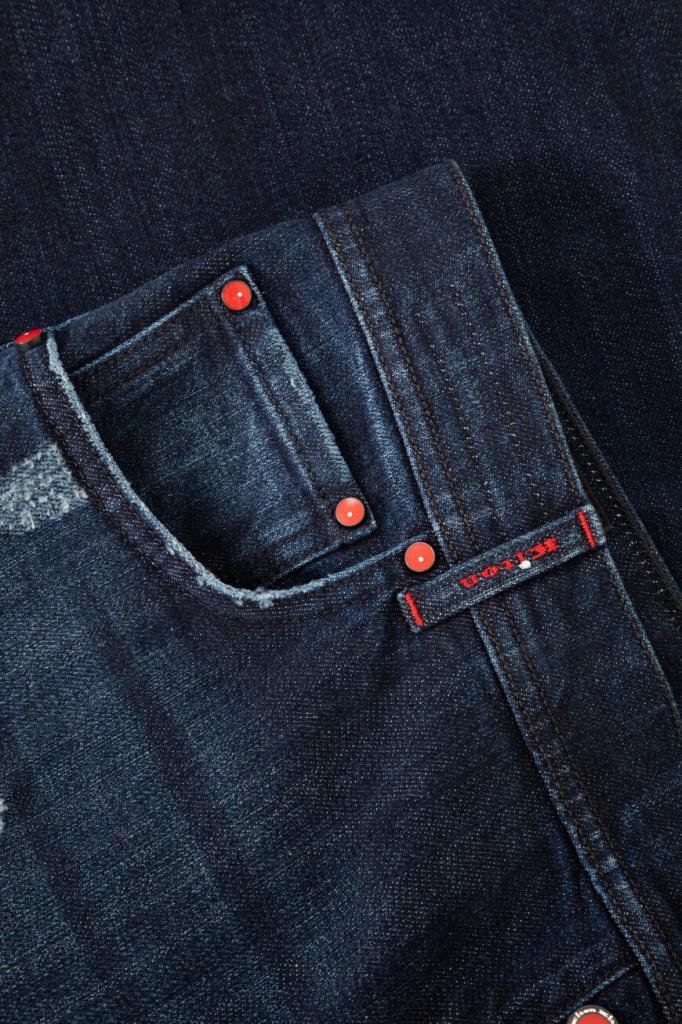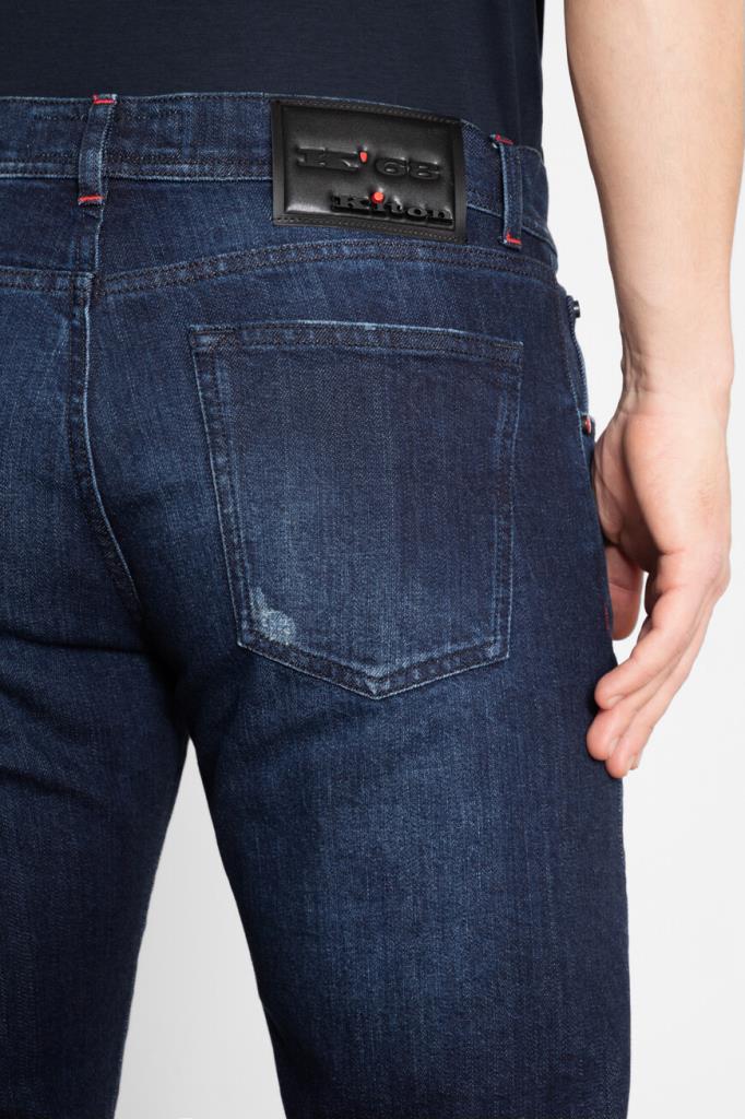 Хлопковые джинсы прямого кроя от бренда Kiton. Модель изготовлена из тёмно-синего денима стрейч с эффектом делаве и дизайнерскими разрывами. Декором выступает чёрная кожаная нашивка с рельефным логотипом и годом основания Дома на поясе сзади. Шов-срез на коже закрашен вручную в стиле сумок Hermès.