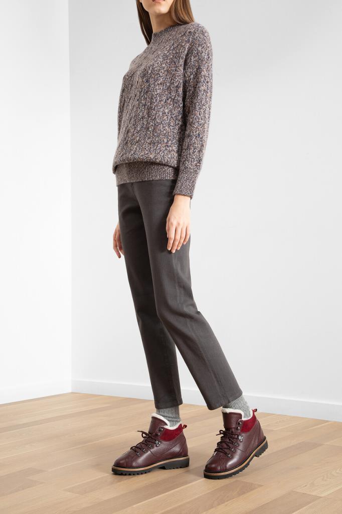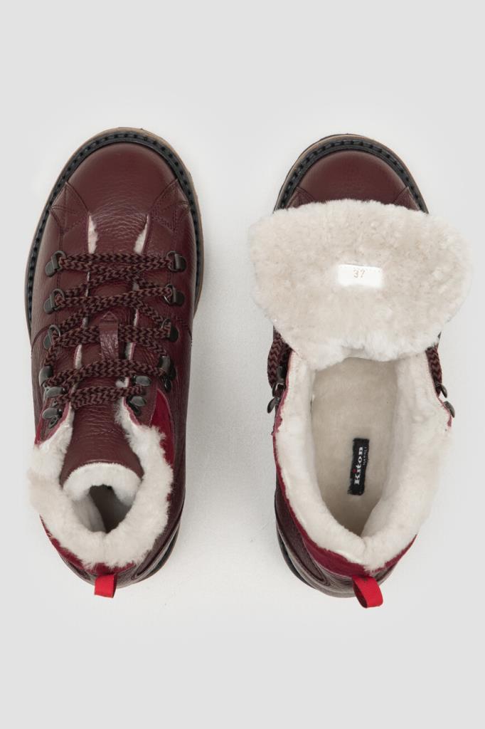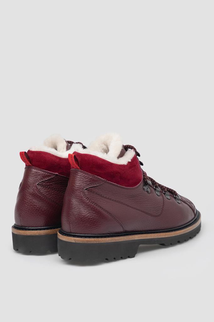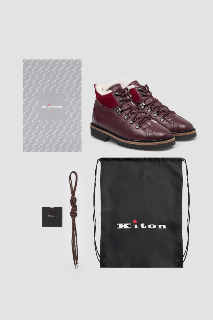 Утеплённые ботинки Kiton бордового оттенка. Для создания модели выбрана крупнозернистая кожа оленя. Отличительные особенности - бархатистая вставка винного оттенка на голенище и белая внутренняя отделка из густой овчины с коротким плотным ворсом.