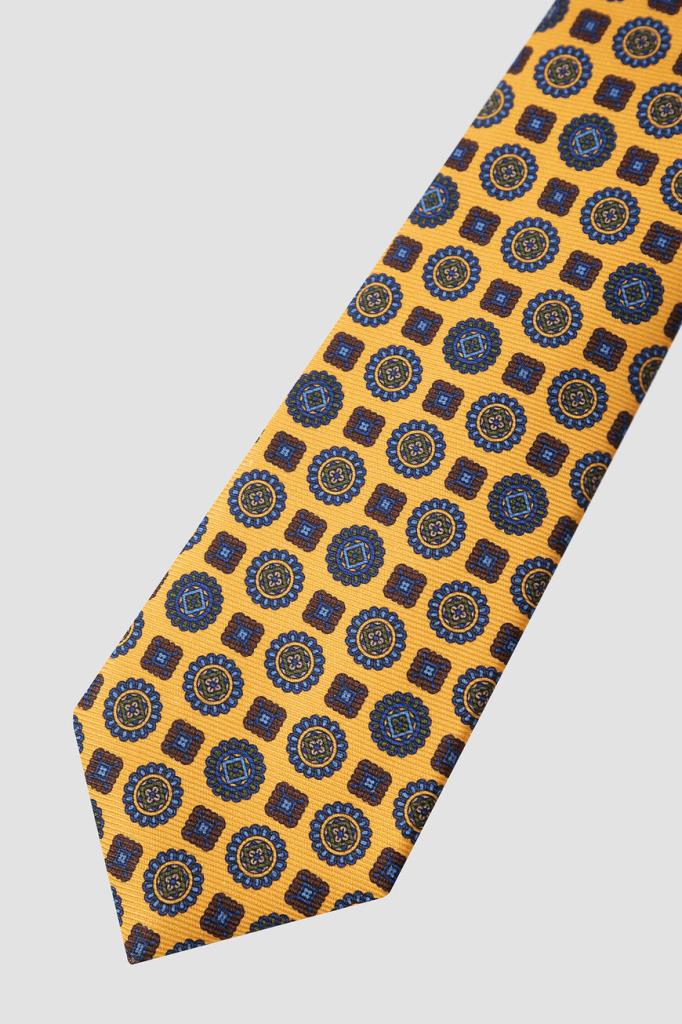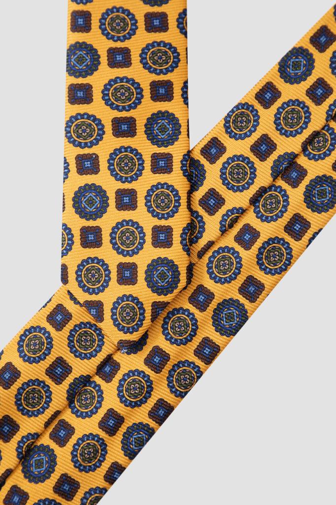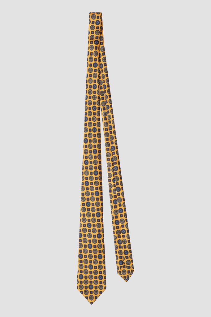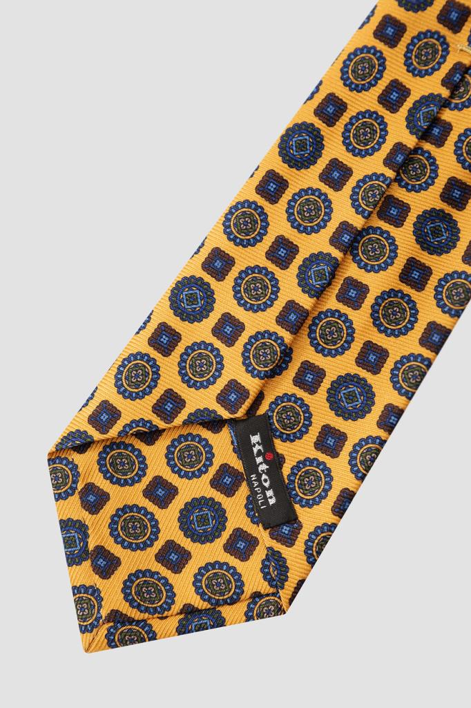 Шелковый галстук Kiton станет ярким акцентом в деловом образе. Модель ручной работы окрашена в жёлтый оттенок и дополнена геометрическим орнаментом. Плотный фактурный материал красиво драпируется, хорошо держит узел и быстро восстанавливает форму после развязывания. Такая пластичность достигается благодаря технологии seven folds, при которой цельный отрез ткани много раз складывают и отпаривают, а затем прошивают вручную.