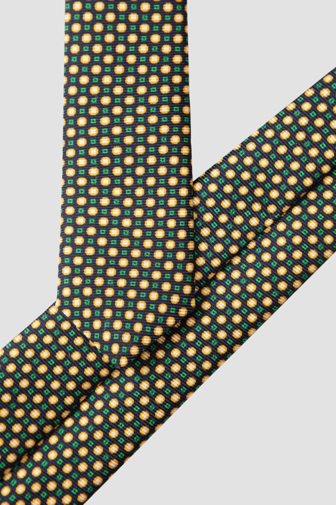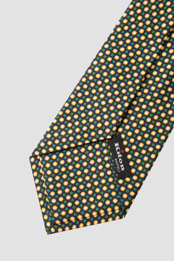 Галстук с ярким геометрическим мотивом от бренда Kiton. Для создания тёмно-синей модели используется прочный фактурный шёлк. Технология семикратного сложения и кропотливая ручная работа гарантируют этому аксессуару безупречный внешний вид.