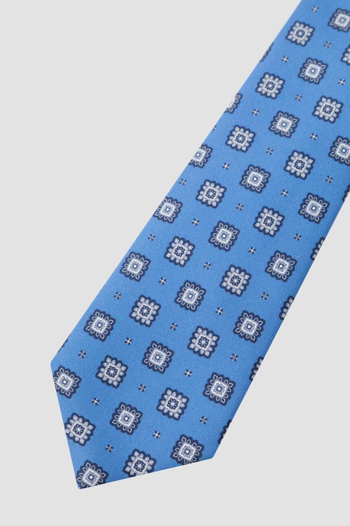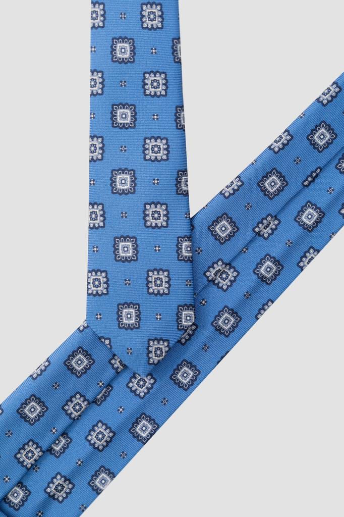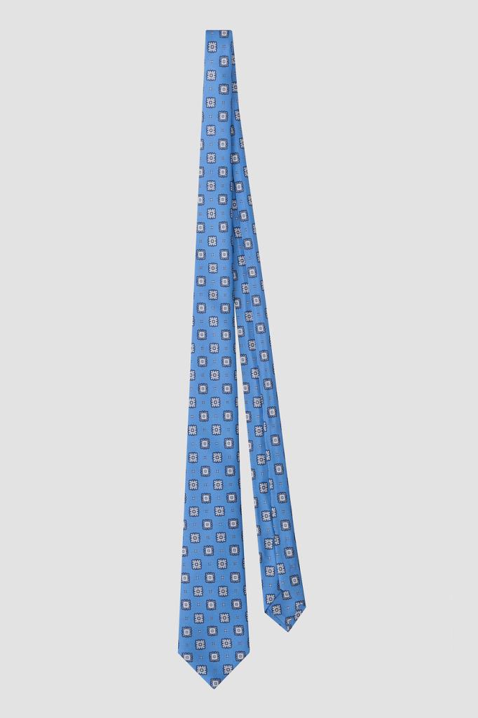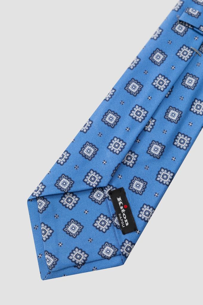 Голубой галстук Kiton с двухцветными геометрическим и цветочным мотивами. Для пошива принтованного аксессуара без подкладки выбран плотный фактурный шёлк. Обратную сторону украшает символика Дома - чёрная бирка Kiton NAPOLI.