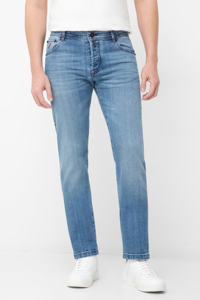 Хлопковые джинсы Kiton с пятью карманами. Модель из мягкого денима с добавлением эластичных волокон комфортно садится по фигуре и не вытягивается на коленях. Изделие выполнено в синем цвете и дополнено выбеленным эффектом и прострочкой на швах. Джинсы на брендированных матовых пуговицах с планкой интересны чёрно-красной кожаной нашивкой со слоганом «The best of the best +1» на поясе сзади и вышитой ярко-красной символикой Дома на маленьком кармане спереди.