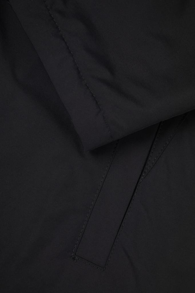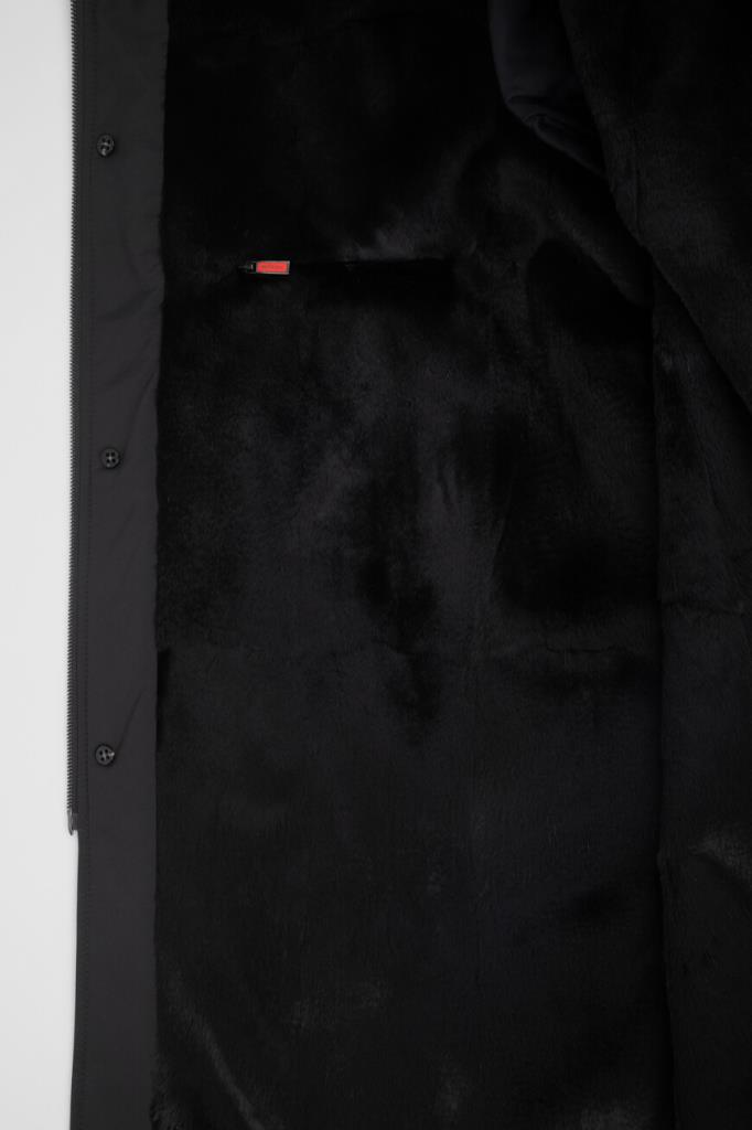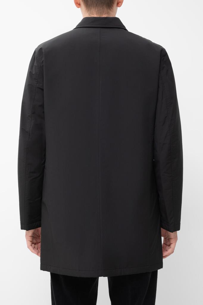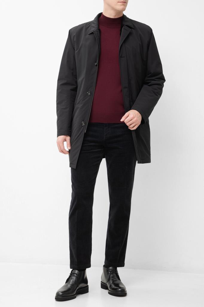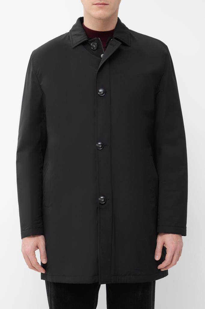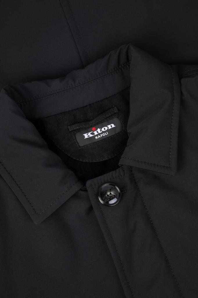 Чёрное пальто Kiton на потайной молнии и крупных роговых пуговицах с планкой. Для создания модели прямого силуэта выбраны мягкая шерсть и прочный матовый нейлон. Надёжную защиту от непогоды обеспечивает внутренняя отделка из меха овчины. В однобортном пальто гармонично сочетаются непревзойдённый комфорт и элегантность, характерная для изделий Дома.