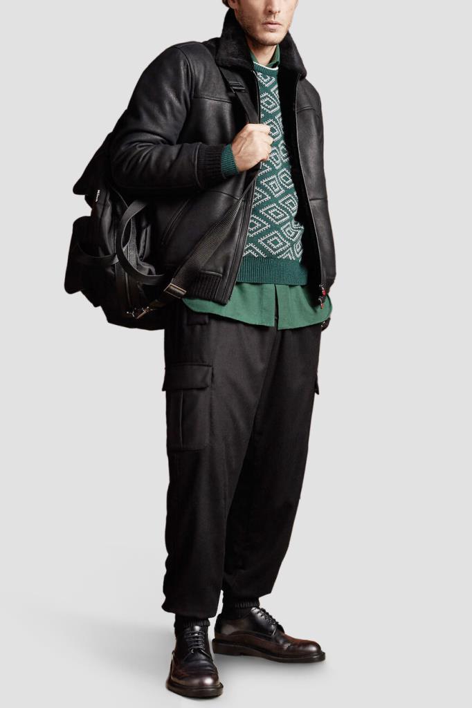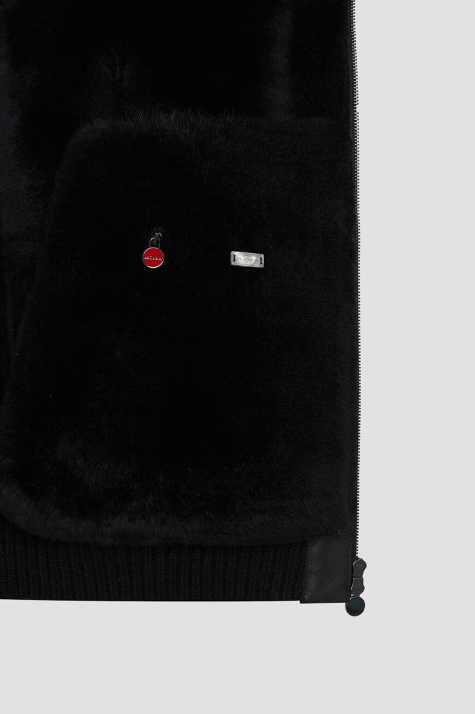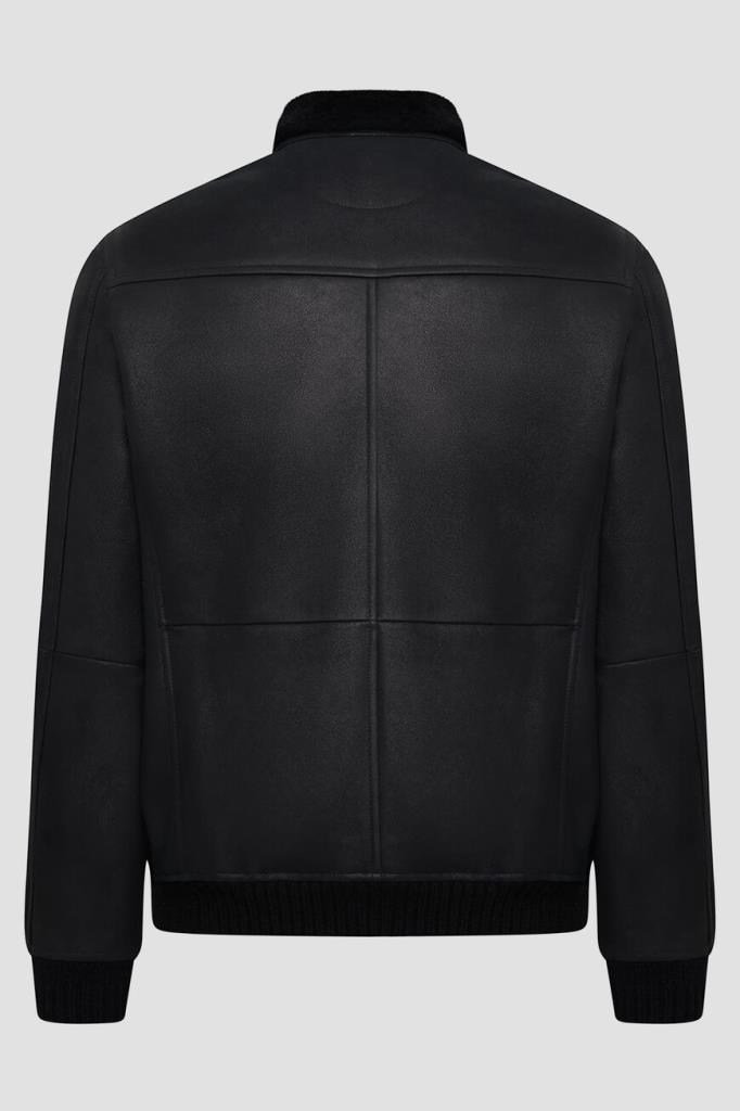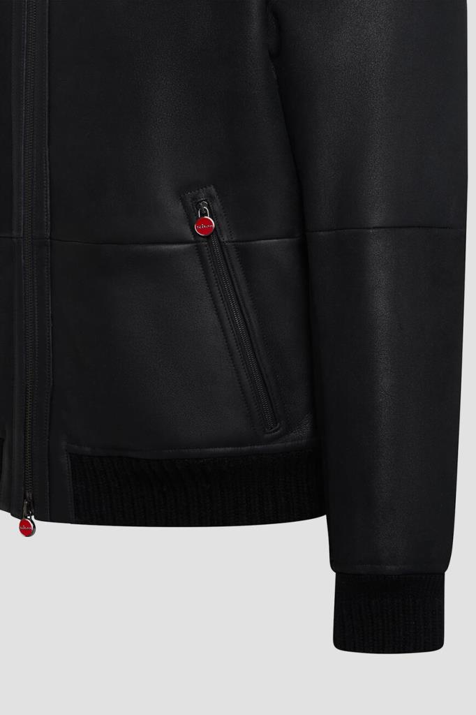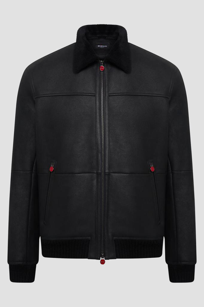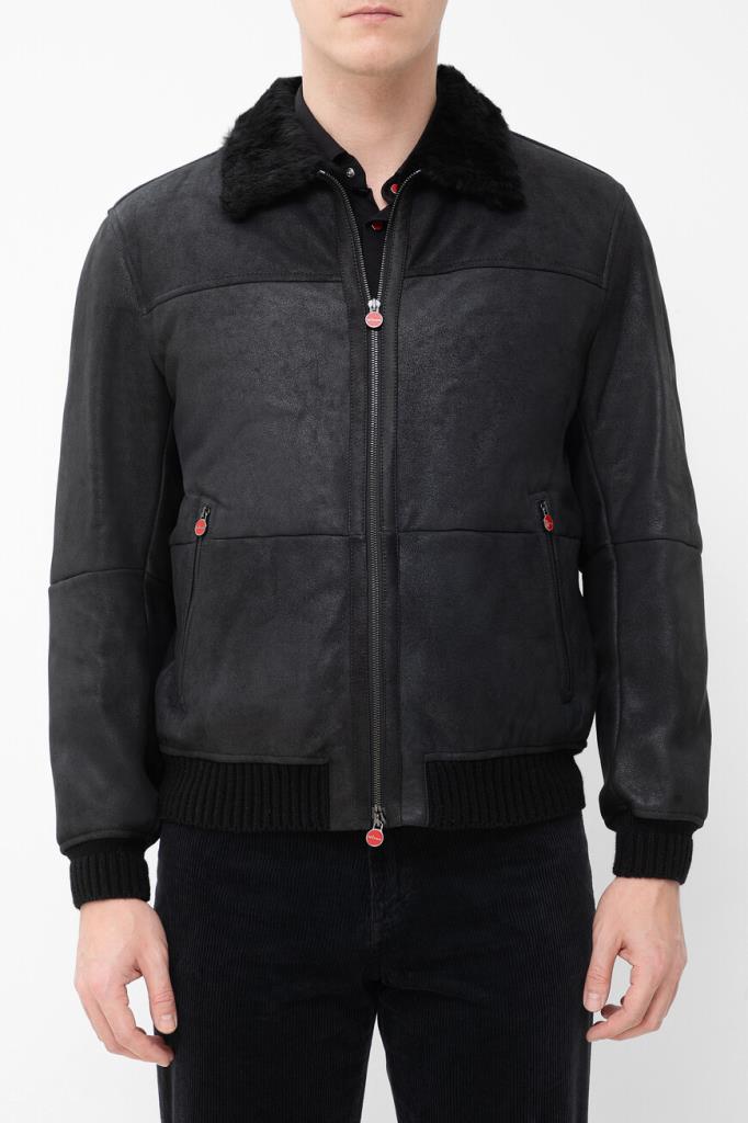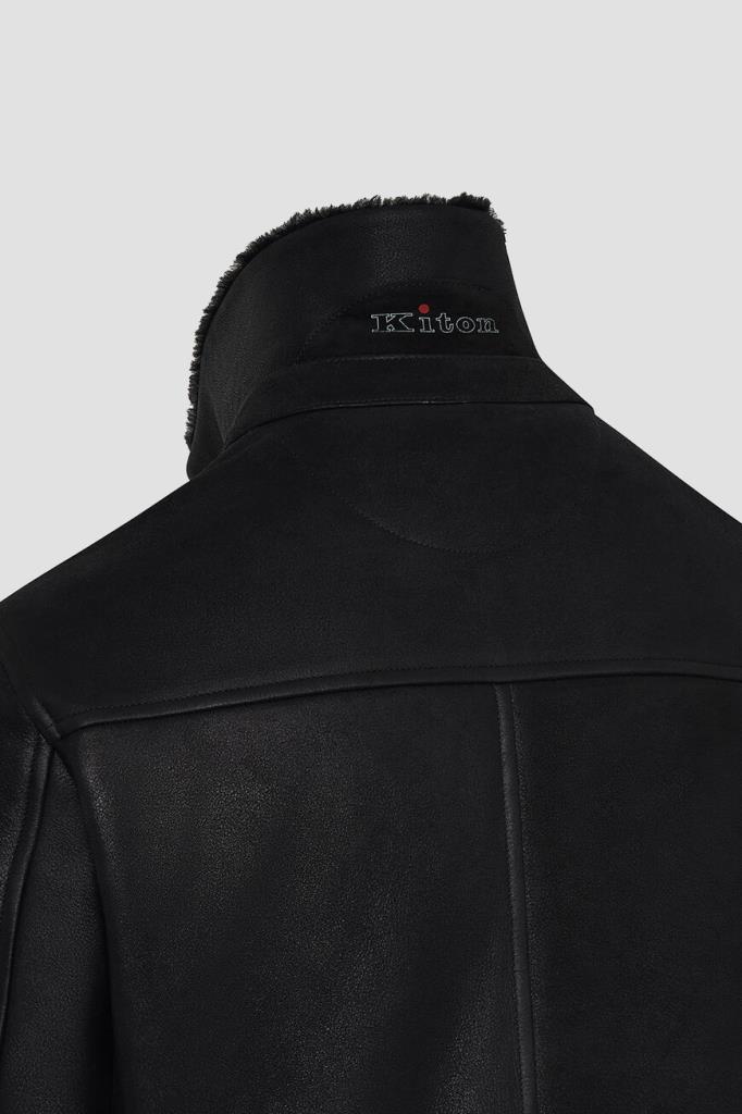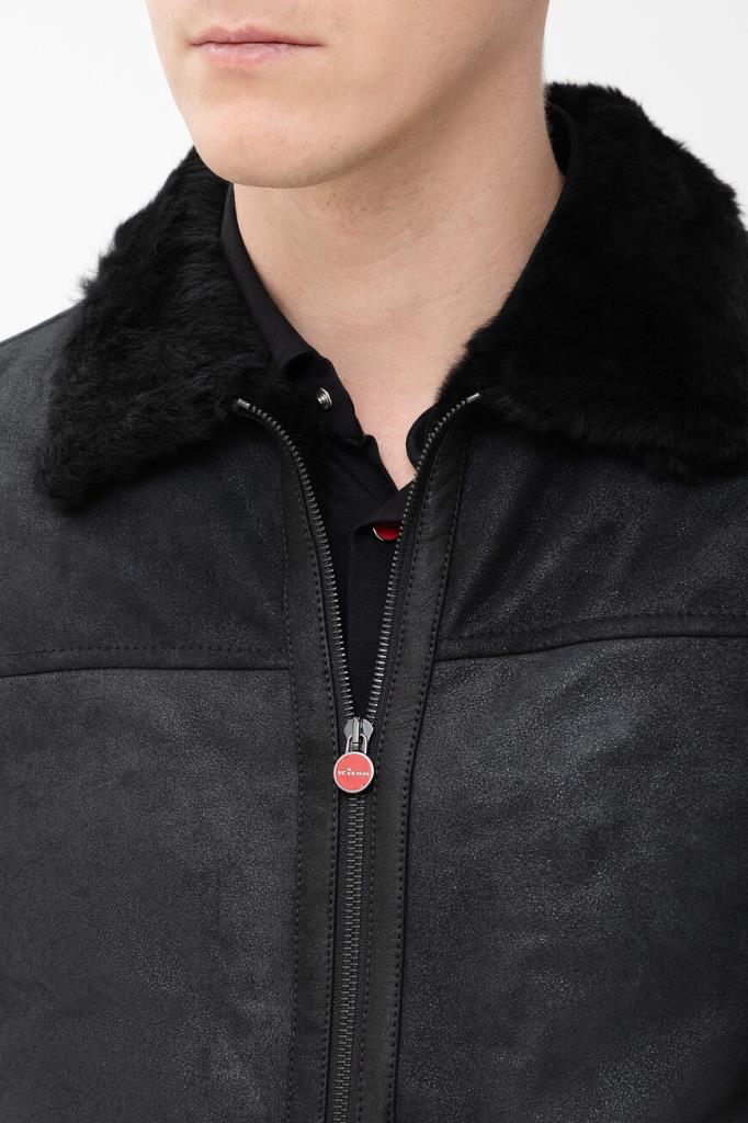 Кожаная куртка Kiton с трикотажными поясом и манжетами на резинке. Изделие выполнено в чёрном цвете и оснащено тёплой подкладкой из мягкого меха овчины. Отличительной особенностью модели стал отложной меховой воротник, который можно поднять. Сзади на воротнике расположена замшевая вставка с белым логотипом Дома.