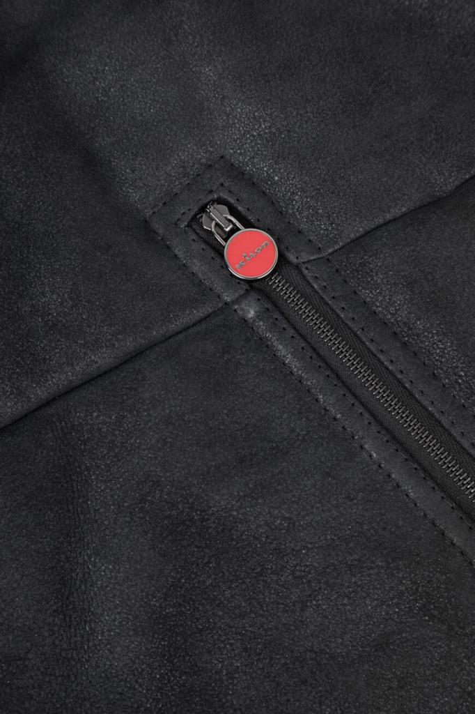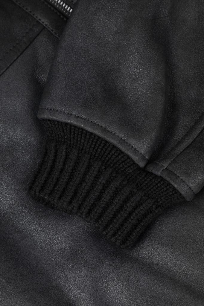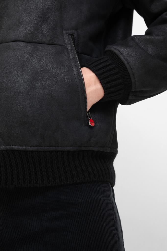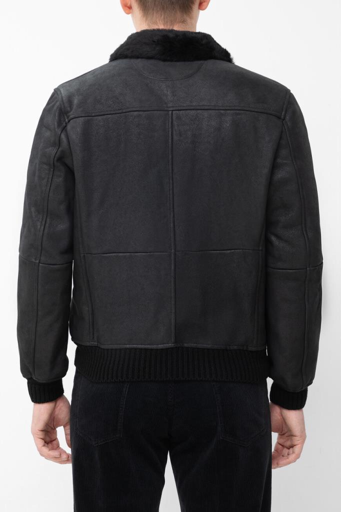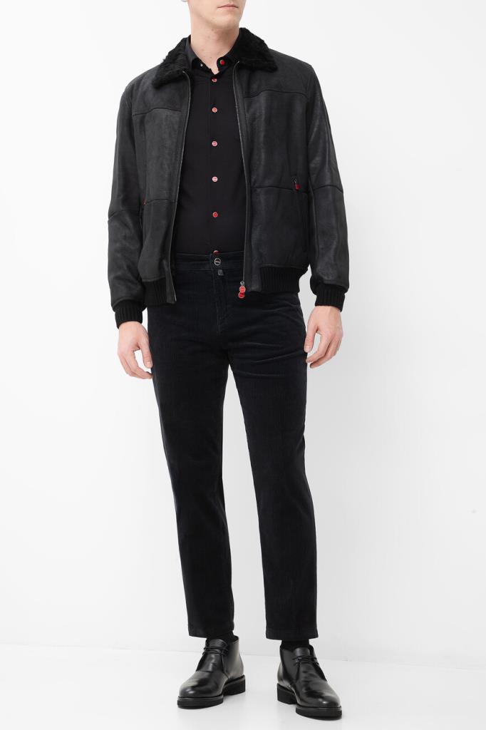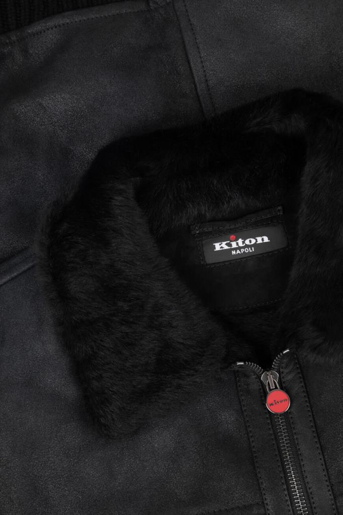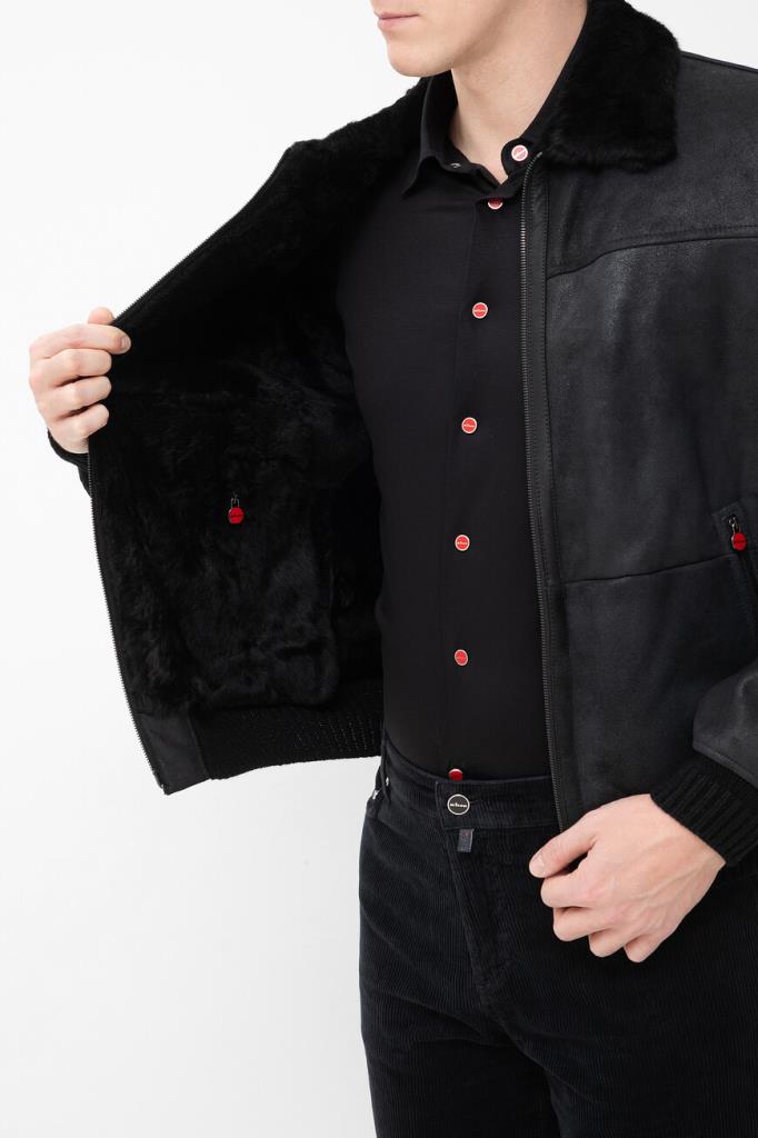 Кожаная куртка Kiton с трикотажными поясом и манжетами на резинке. Изделие выполнено в чёрном цвете и оснащено тёплой подкладкой из мягкого меха овчины. Отличительной особенностью модели стал отложной меховой воротник, который можно поднять. Сзади на воротнике расположена замшевая вставка с белым логотипом Дома.