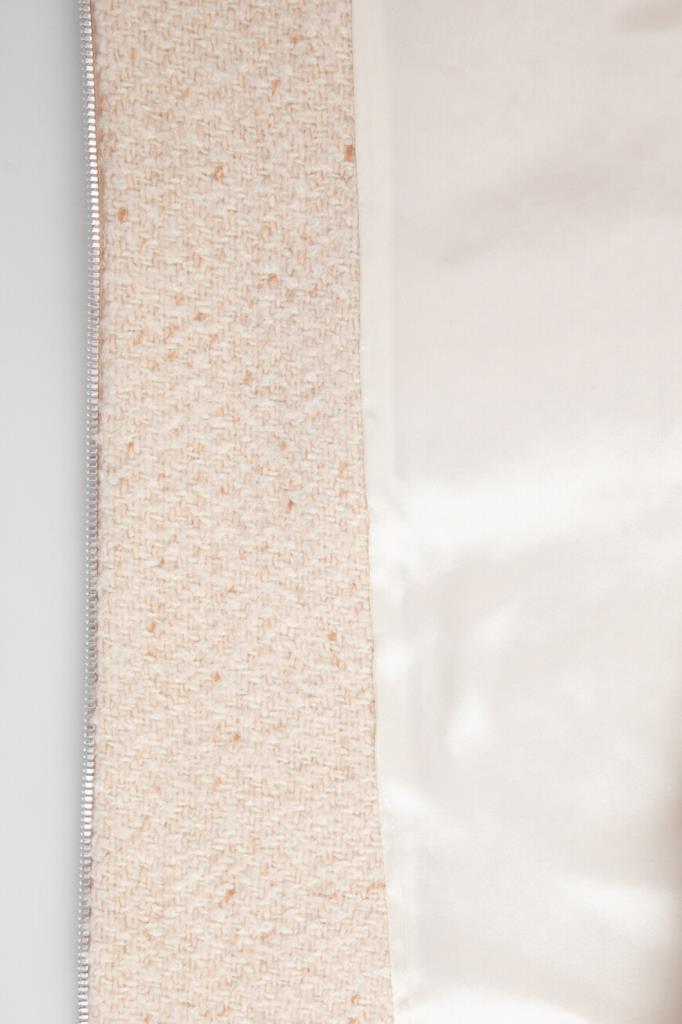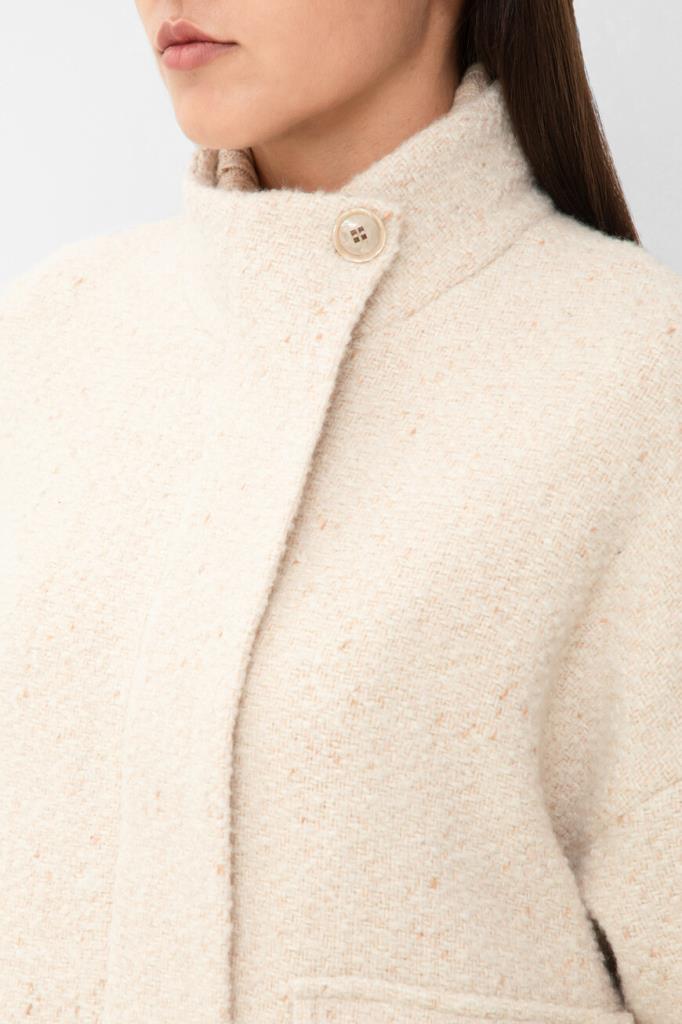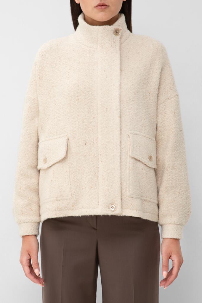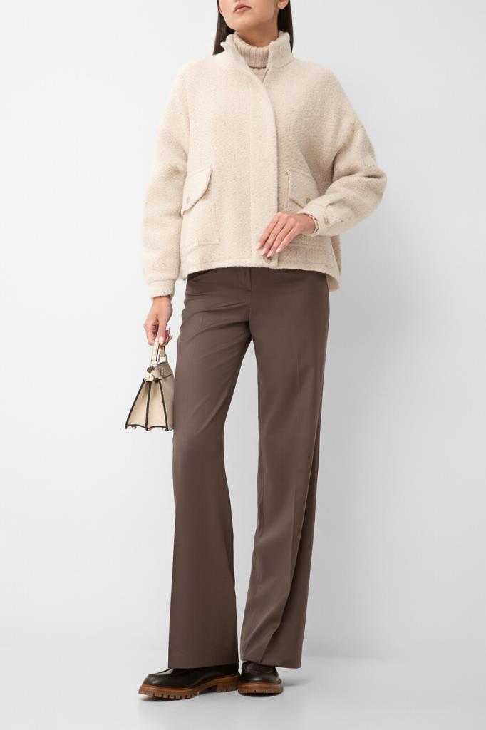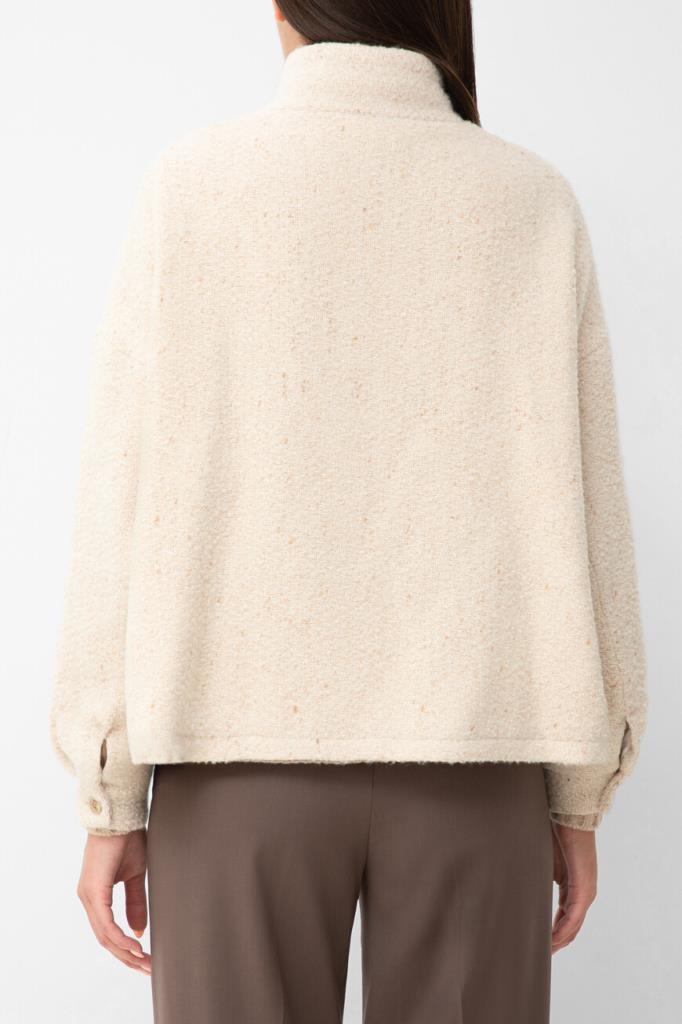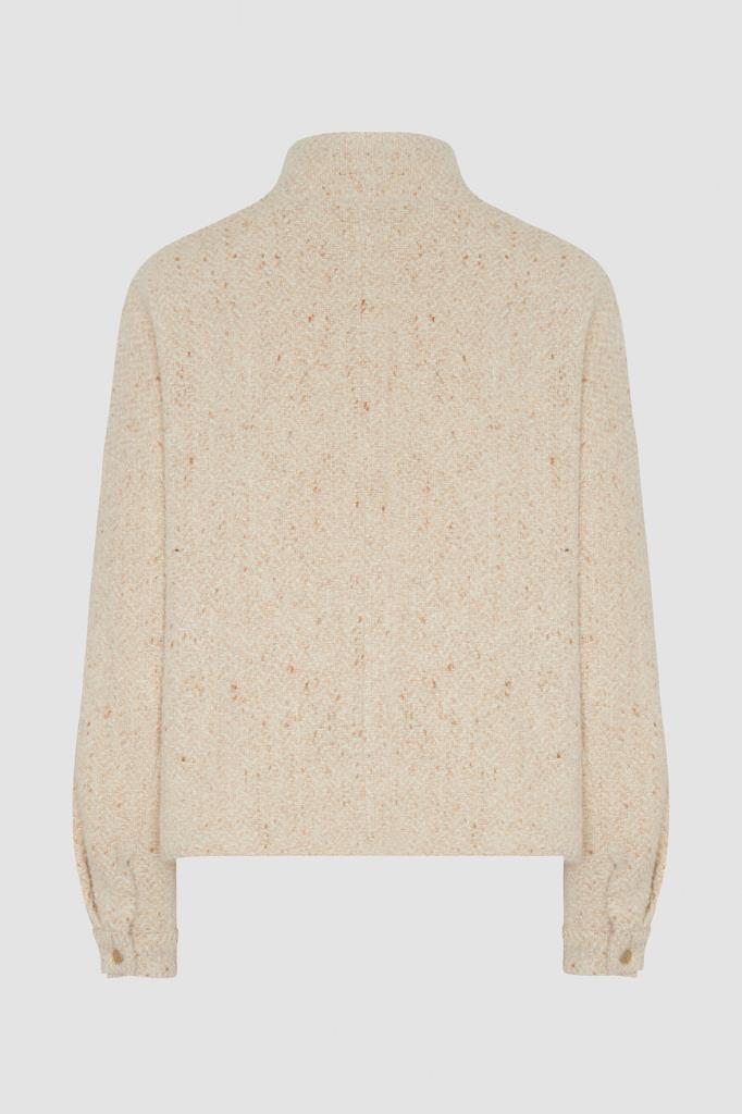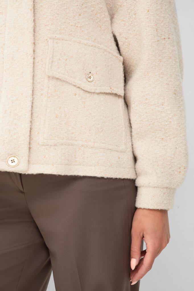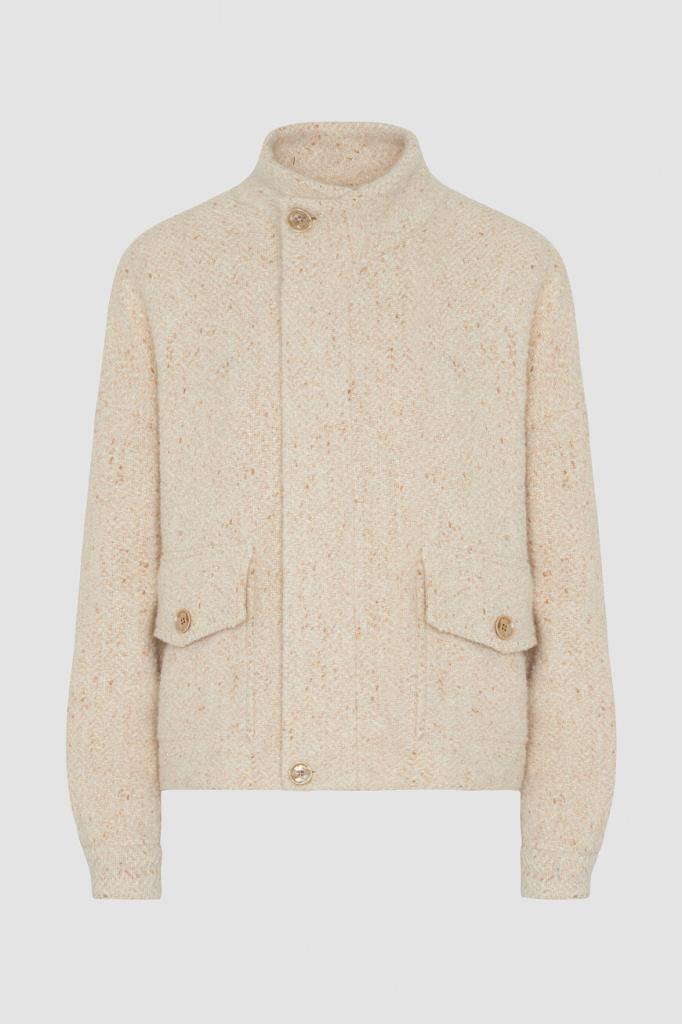 Куртка Kiton с двумя крупными накладными карманами с клапанами на пуговице. Для создания модели свободного силуэта выбран мягкий фактурный трикотаж на основе вирджинской шерсти, кашемира и гладкого шёлка светло-бежевого оттенка. Фасон изделия предполагает невысокий воротник-стойку и застёжку на потайную молнию и две перламутровые пуговицы с планкой.