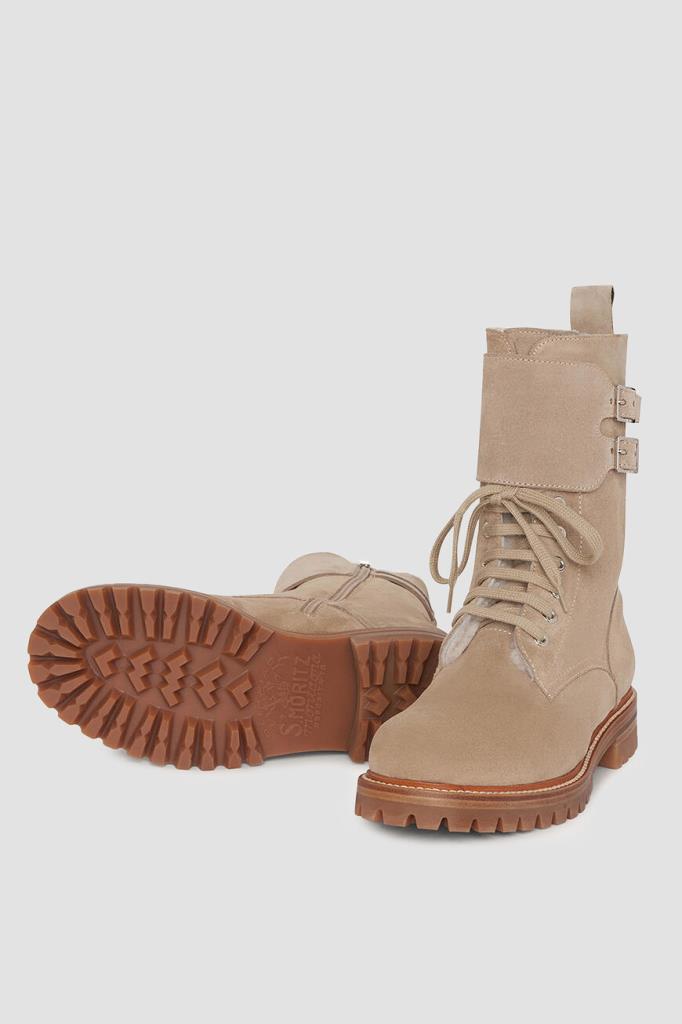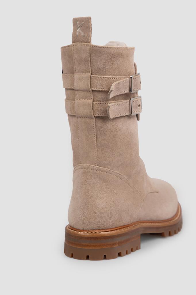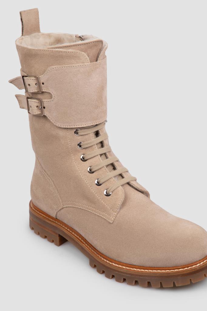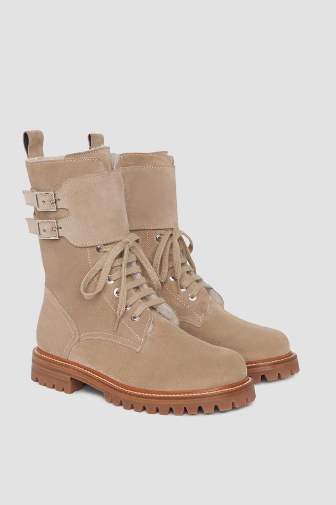 Ботинки Kiton из мягкой бархатистой замши светло-коричневого оттенка. Чтобы ногам в такой обуви было комфортно во время зимних прогулок, высокую модель утеплили густой стриженой овчиной, поддерживающей оптимальный микроклимат. Широкая резиновая подошва с устойчивым каблуком дополнена глубоким нескользящим протектором, дарящим уверенность на любом грунте. Женственная пара с регулируемым ремешком с двойной пряжкой на голенище застёгивается молнией сбоку.