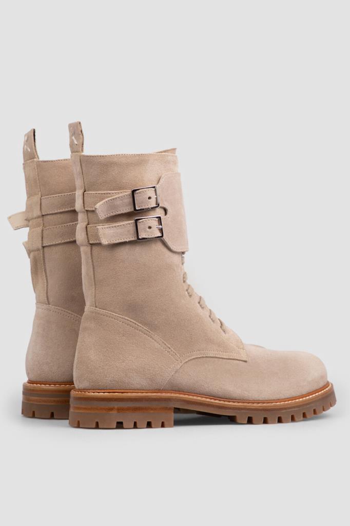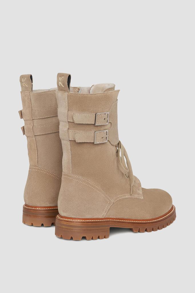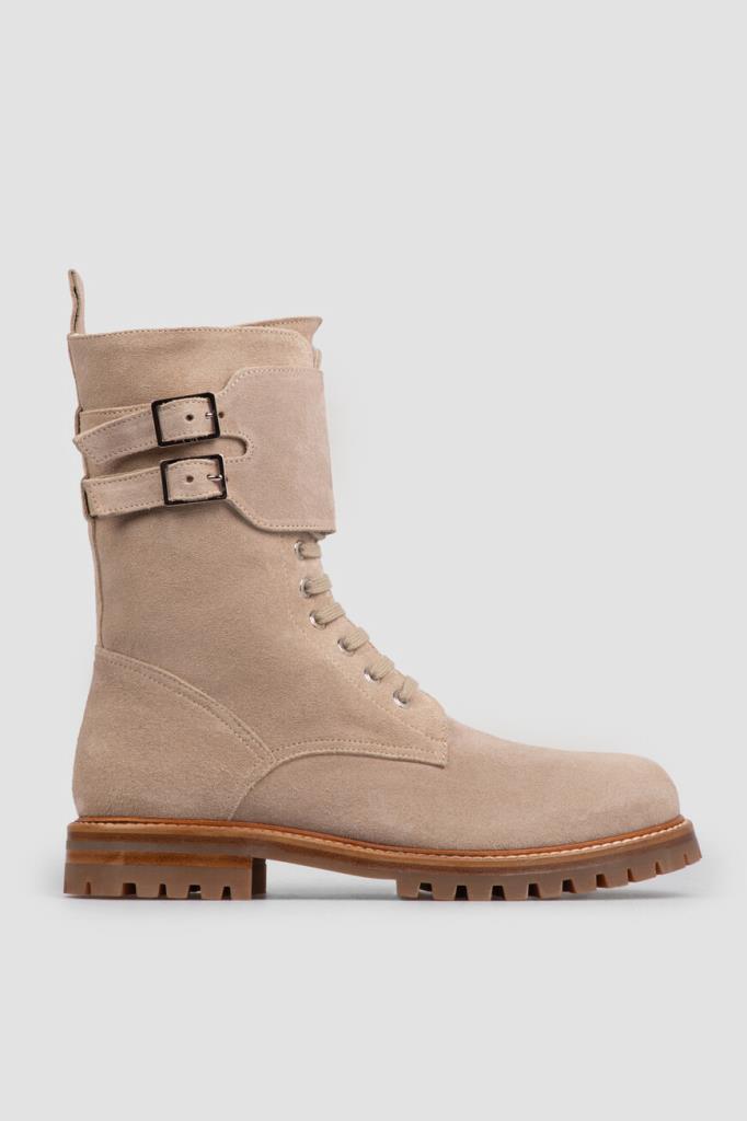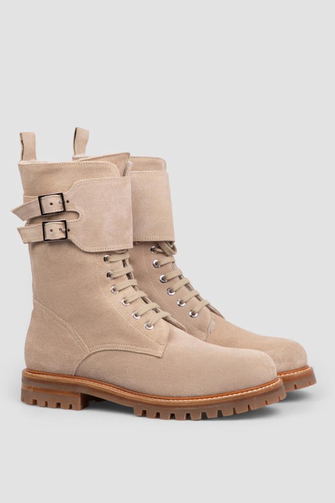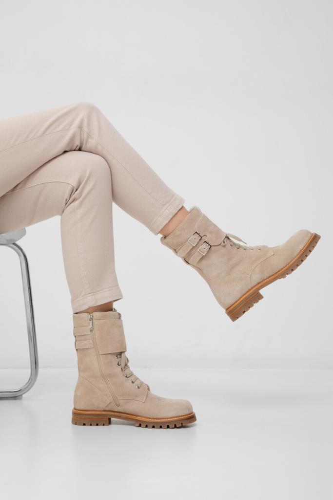 Ботинки Kiton из мягкой бархатистой замши светло-коричневого оттенка. Чтобы ногам в такой обуви было комфортно во время зимних прогулок, высокую модель утеплили густой стриженой овчиной, поддерживающей оптимальный микроклимат. Широкая резиновая подошва с устойчивым каблуком дополнена глубоким нескользящим протектором, дарящим уверенность на любом грунте. Женственная пара с регулируемым ремешком с двойной пряжкой на голенище застёгивается молнией сбоку.