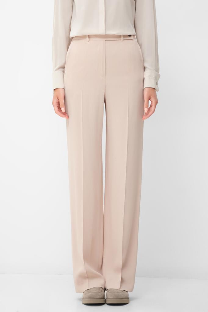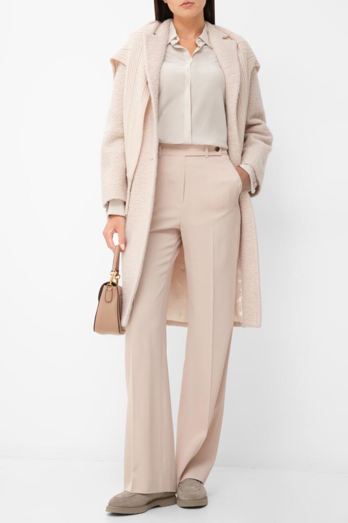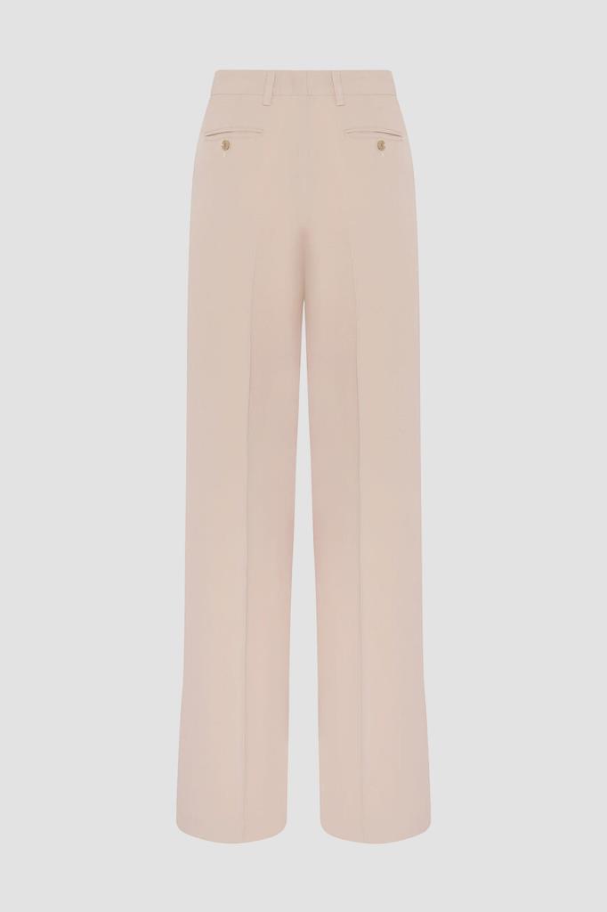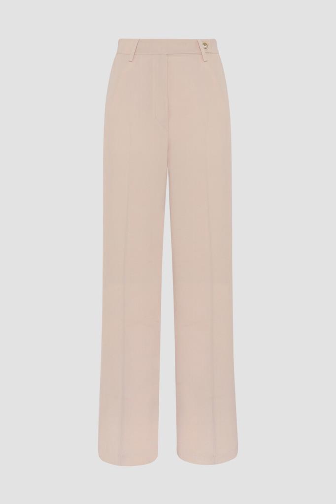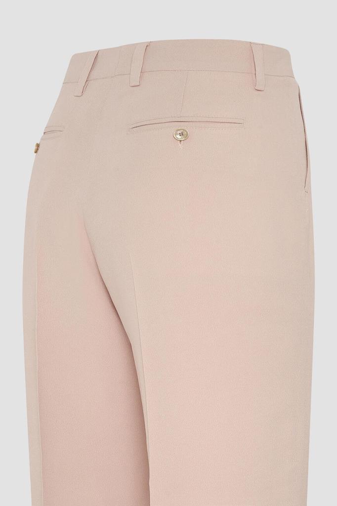 Брюки бледно-розового оттенка от бренда Kiton. Для пошива модели с четырьмя прорезными карманами используется мягкий трикотаж на основе прочного вискозного волокна и ацетата. Изделие с отглаженными стрелками приятно ощущается на коже и обеспечивает свободу движения за счёт прямого силуэта.