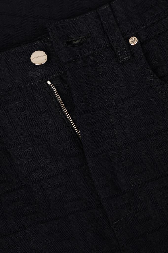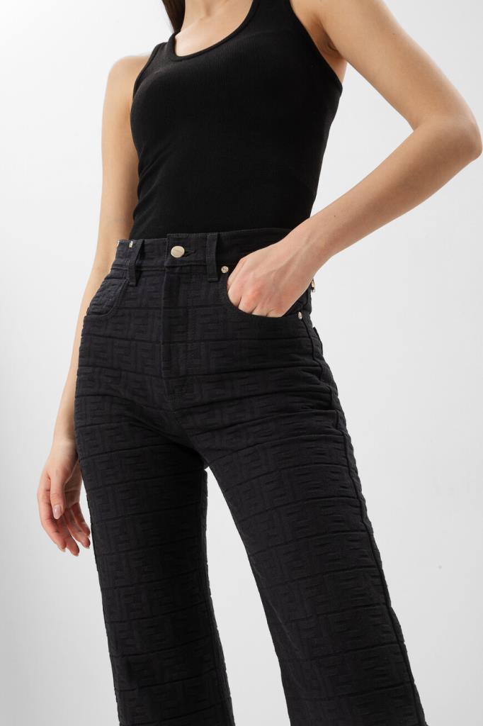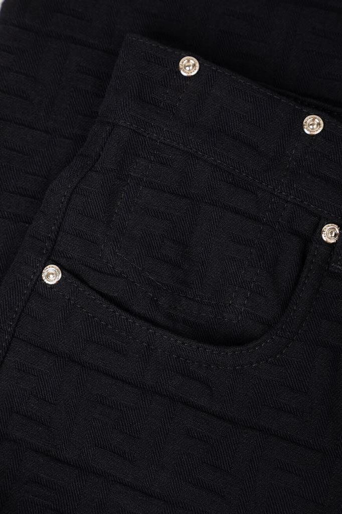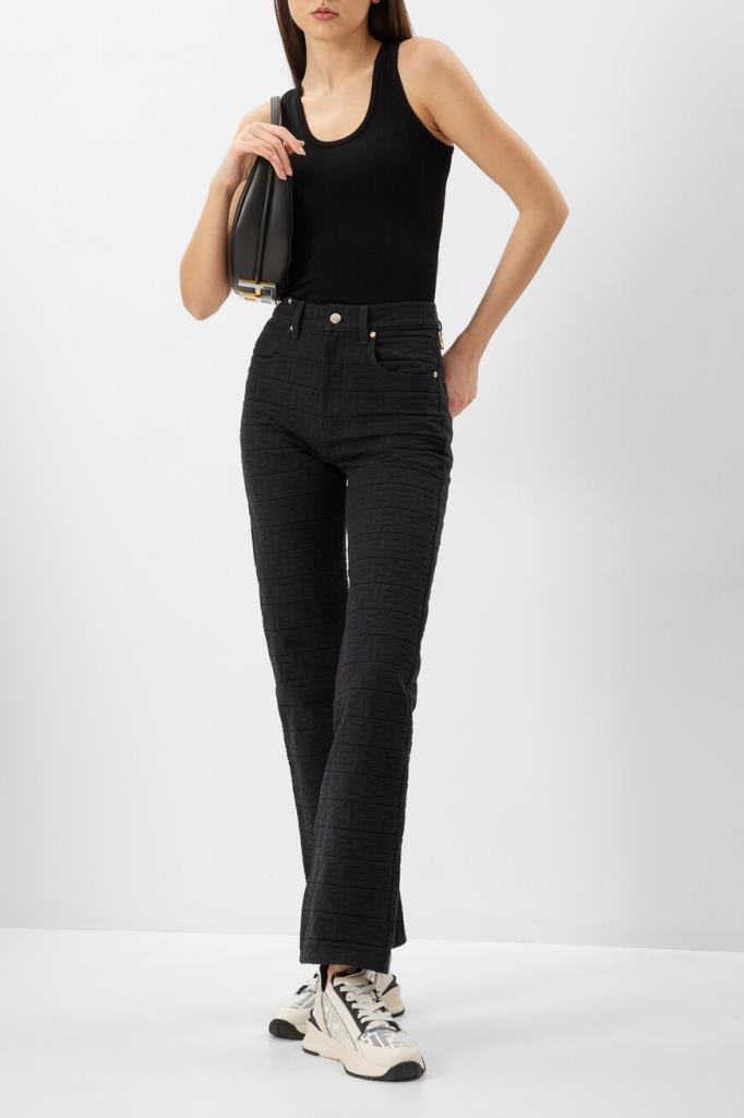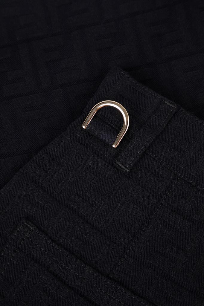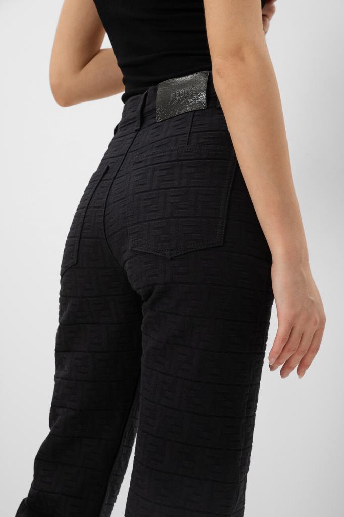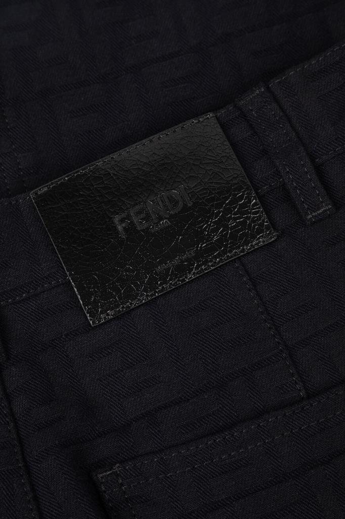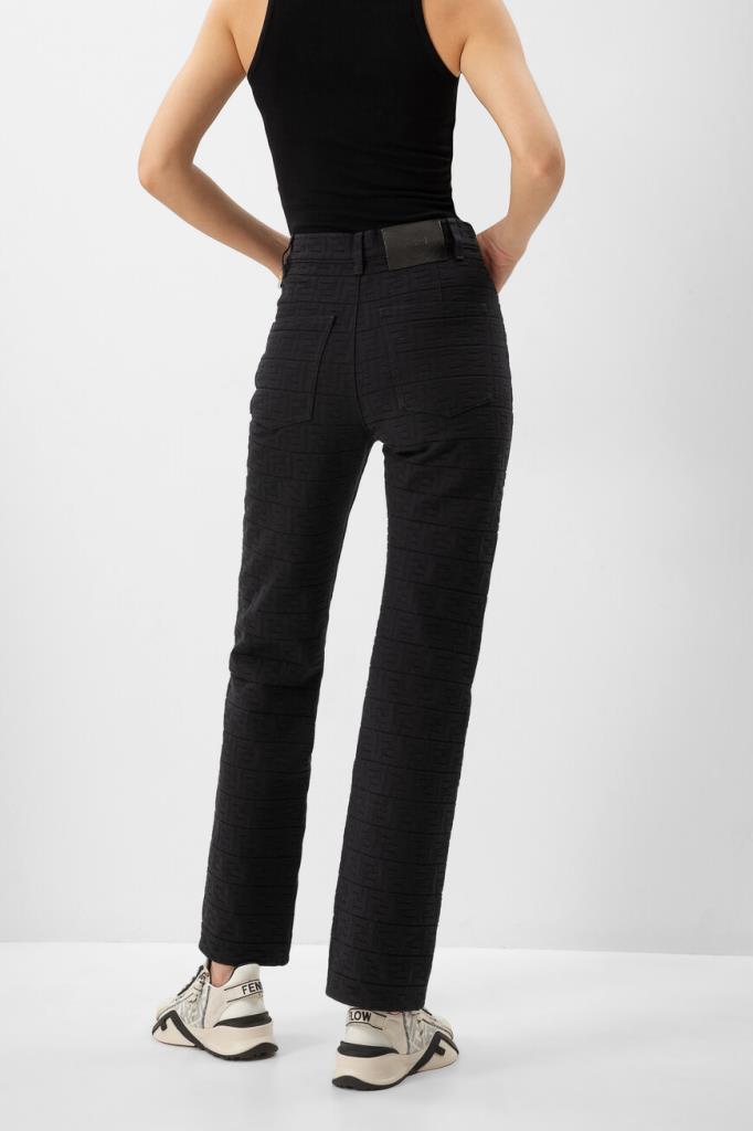 Хлопковые брюки Fendi с повторяющимся жаккардовым мотивом «FF». Фасон изделия предполагает прямой силуэт и пять карманов. Модель чёрного цвета застёгивается на молнию и логотипированную пуговицу из металла светло-золотого оттенка. Отличительными особенностями брюк стали D-образная металлическая деталь на поясе сбоку и кожаная нашивка с мятым эффектом и логотипом сзади.