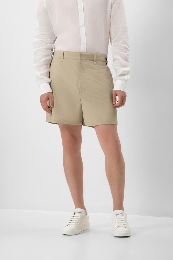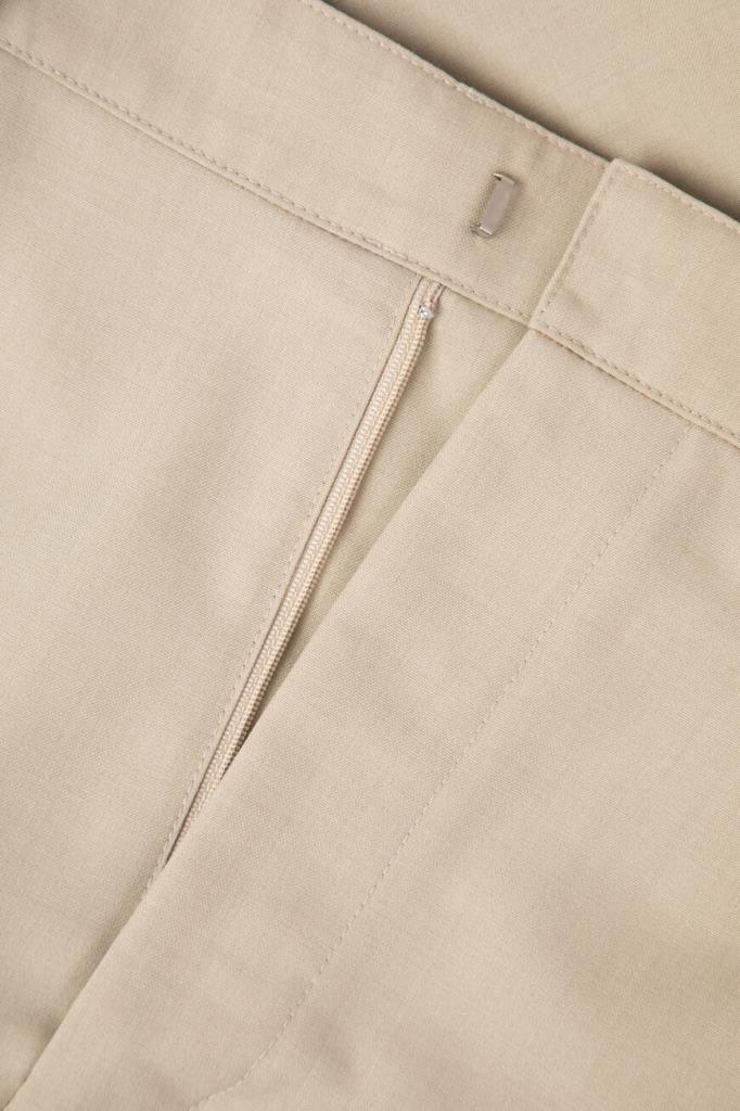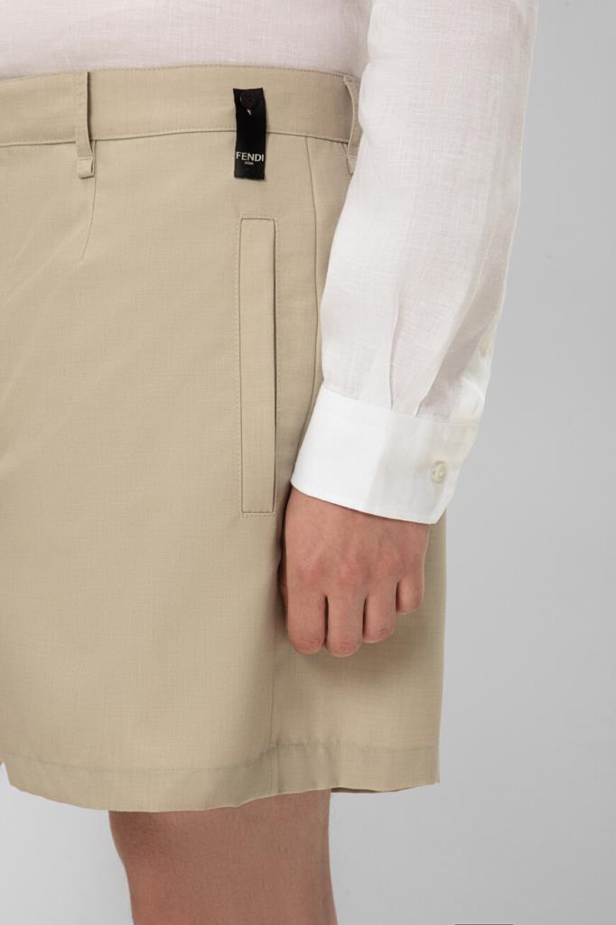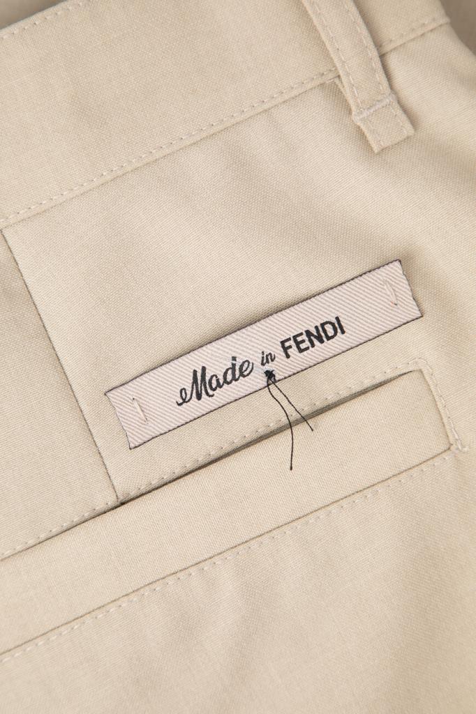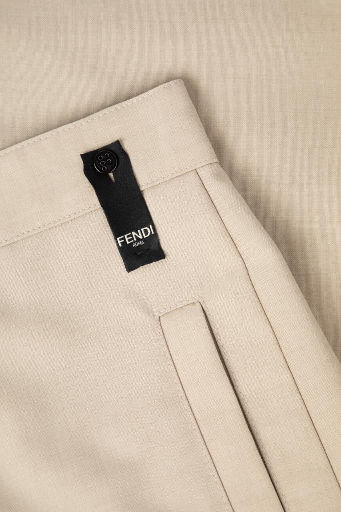 Шерстяные шорты дизайнерского силуэта от бренда Fendi. Изделие светло-бежевого оттенка застёгивается на потайную молнию и крючок с планкой. Декором выступает лаконичная вставка с чёрными надписью «Made in FENDI» и нитью над правым задним карманом. Лёгкая короткая модель с высокой талией станет основой повседневного образа с однобортным пиджаком из той же коллекции.