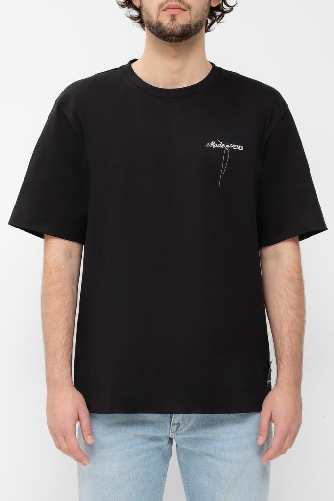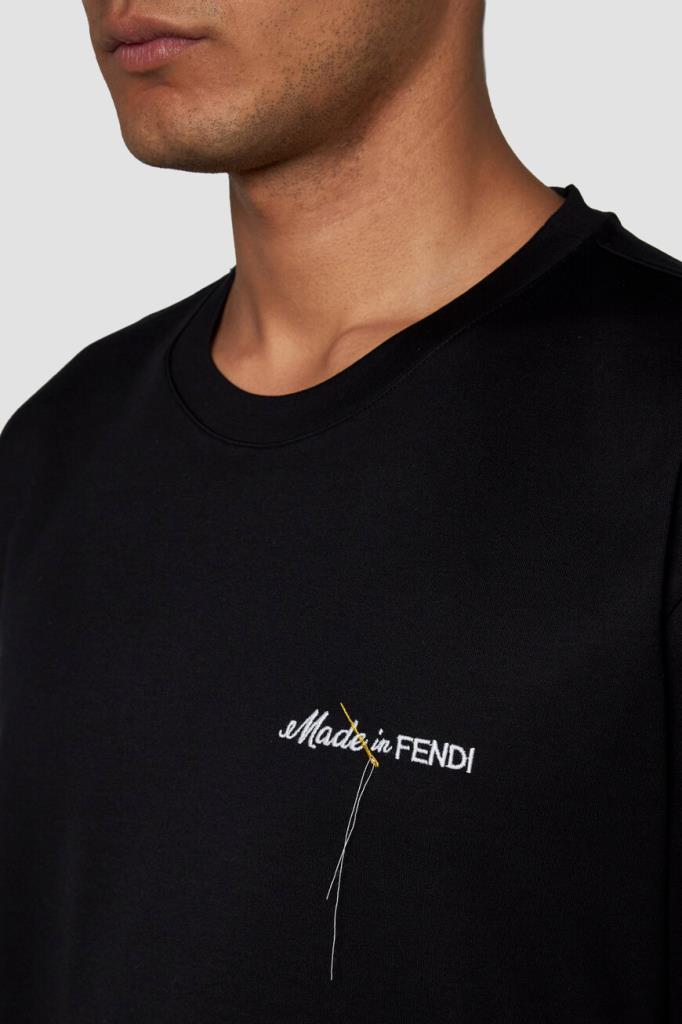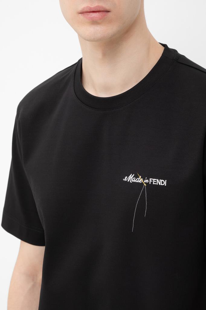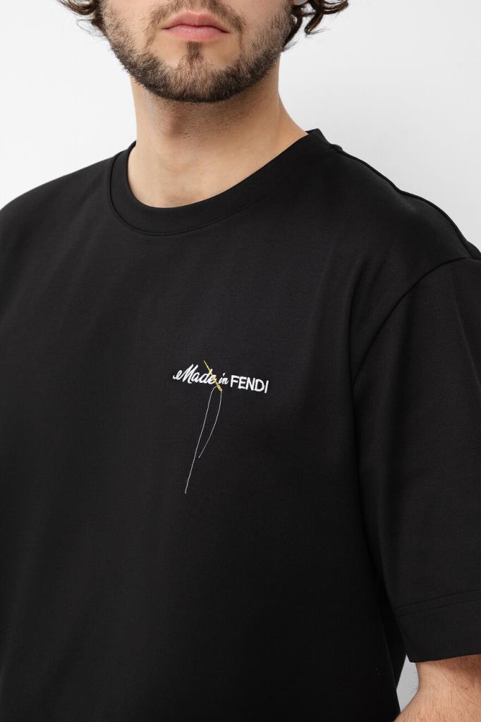 Чёрная футболка Fendi с контрастным декором. Для пошива модели прямого силуэта выбран мягкий хлопковый трикотаж. Атрибутом Дома стала минималистичная вышивка с надписью «Made in FENDI» и изображением жёлтой иглы с продетой сквозь неё белой нитью слева на груди. Образ можно дополнить бермудами из плотной холщовой ткани того же бренда.