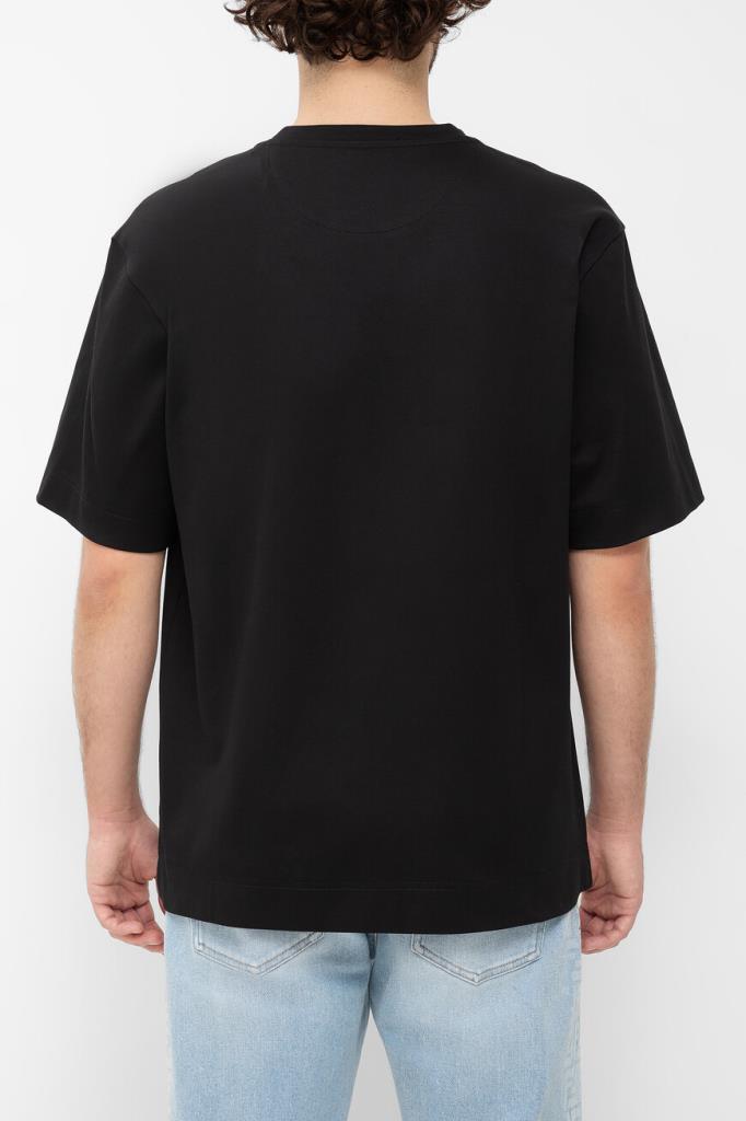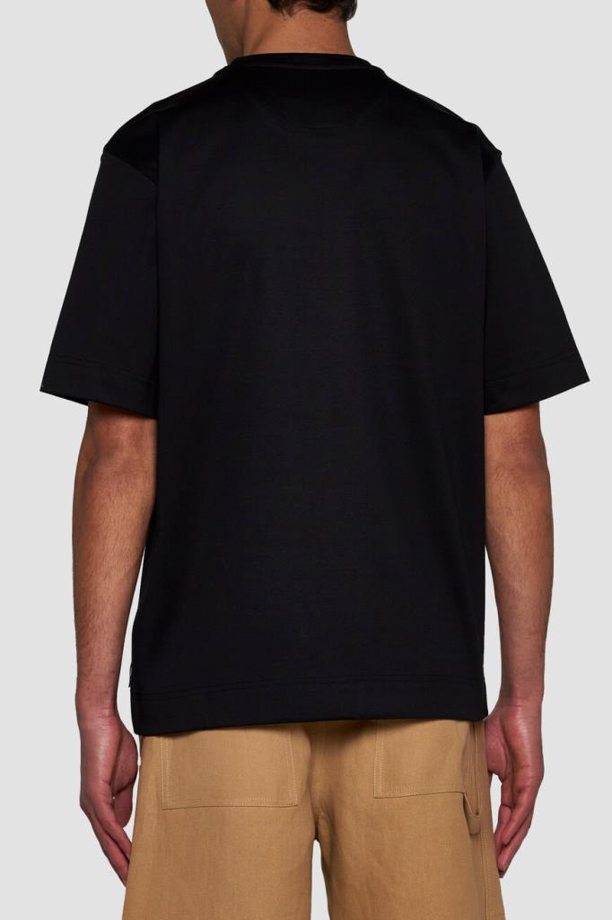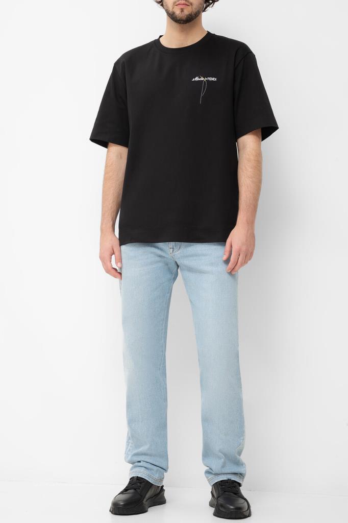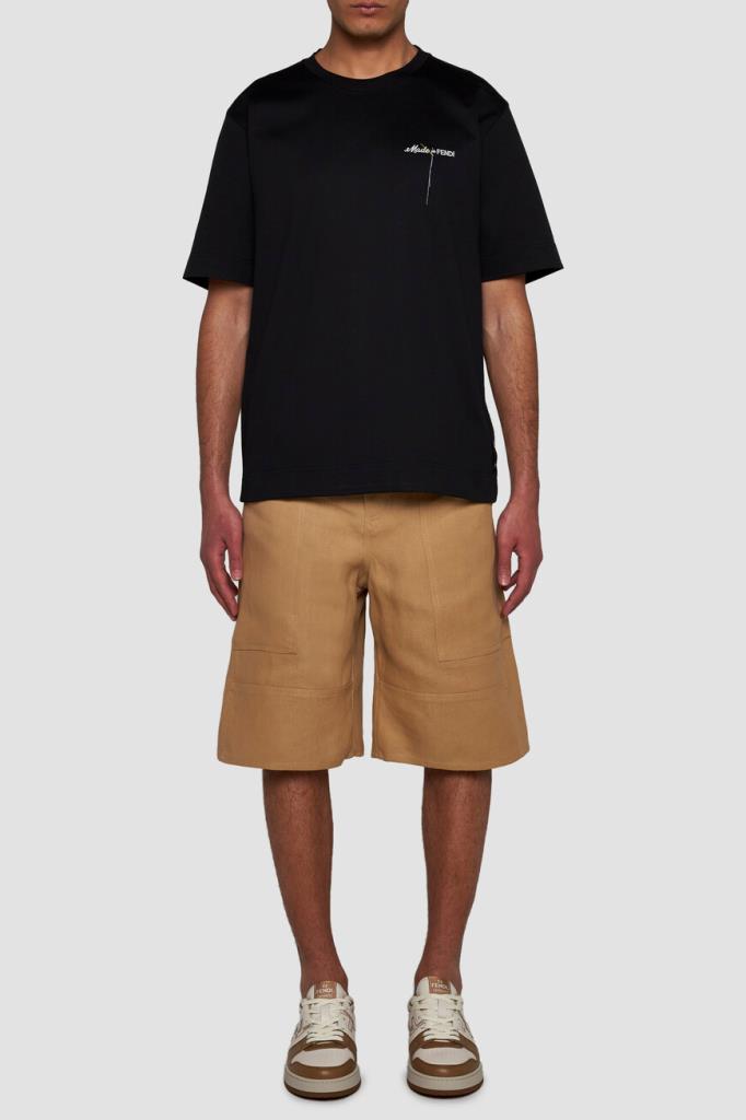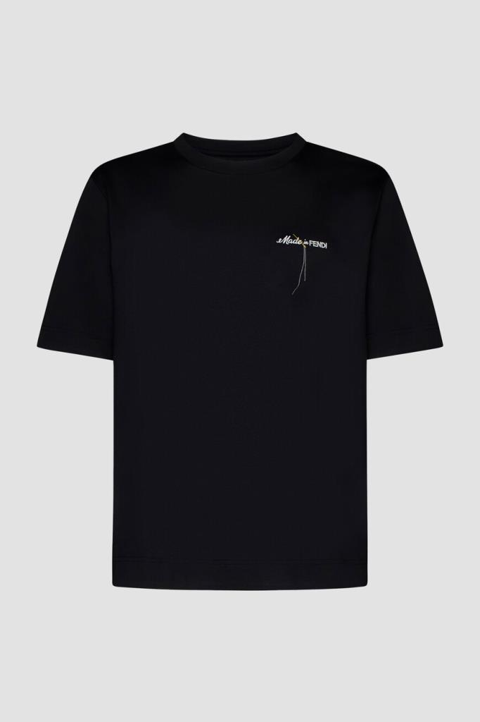Чёрная футболка Fendi с контрастным декором. Для пошива модели прямого силуэта выбран мягкий хлопковый трикотаж. Атрибутом Дома стала минималистичная вышивка с надписью «Made in FENDI» и изображением жёлтой иглы с продетой сквозь неё белой нитью слева на груди. Образ можно дополнить бермудами из плотной холщовой ткани того же бренда.