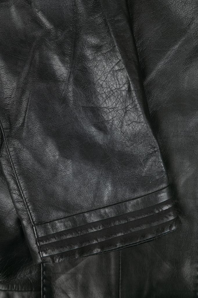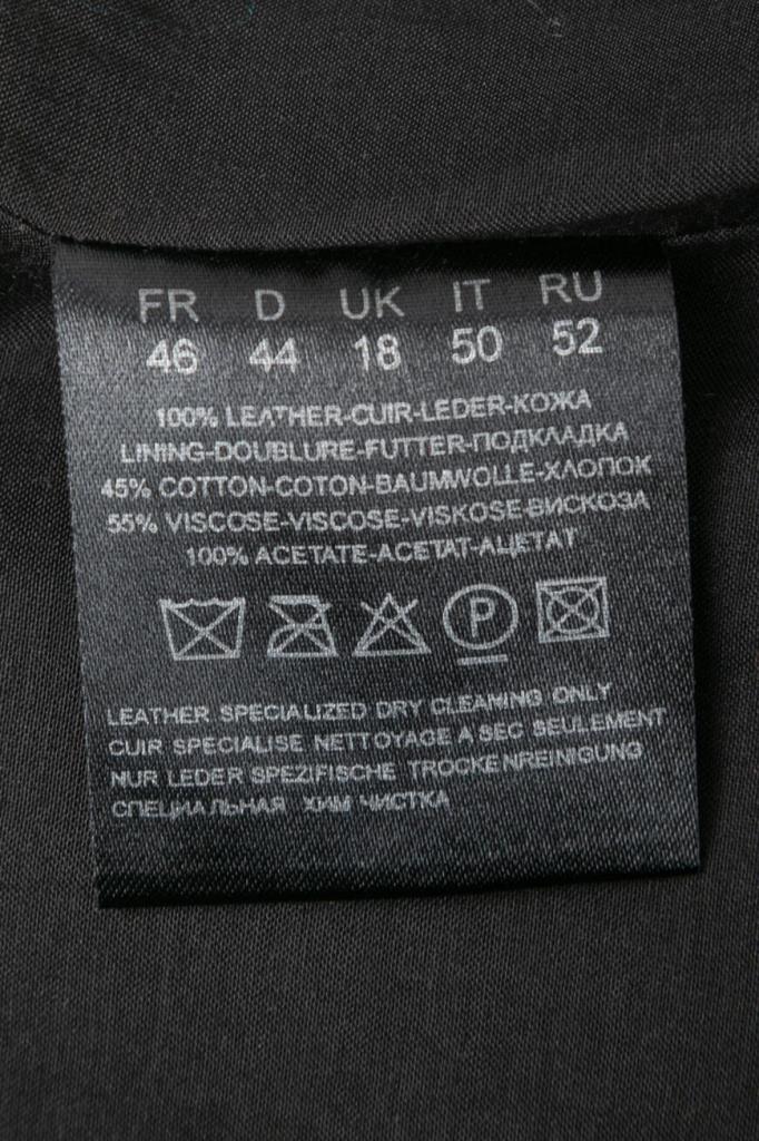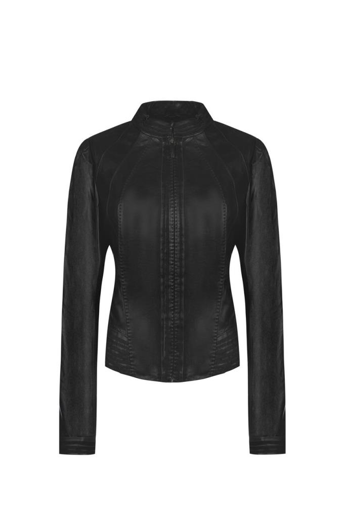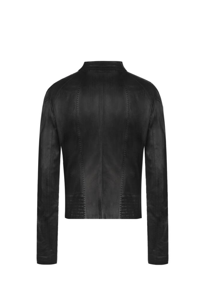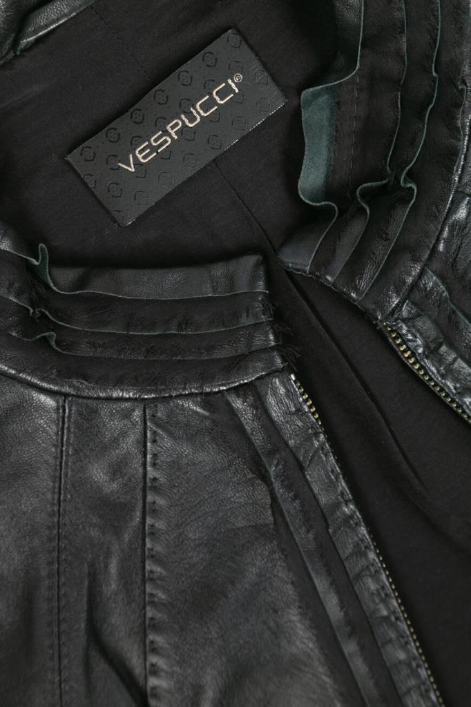 Стильная женская куртка Vespucci из мягкой натуральной телячьей кожи чёрного цвета с оригинальным фактурным геометрическим узором в виде рельефных полос по всей поверхности изделия.
