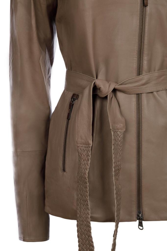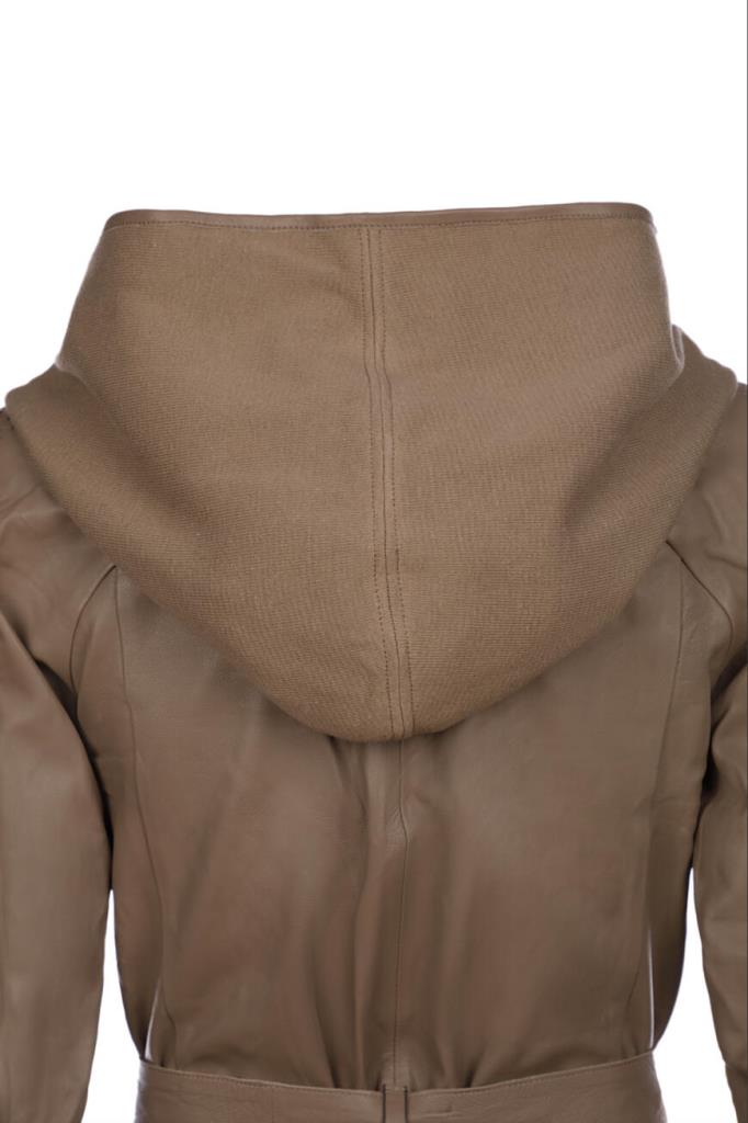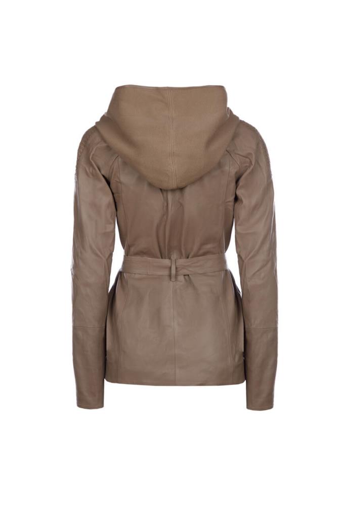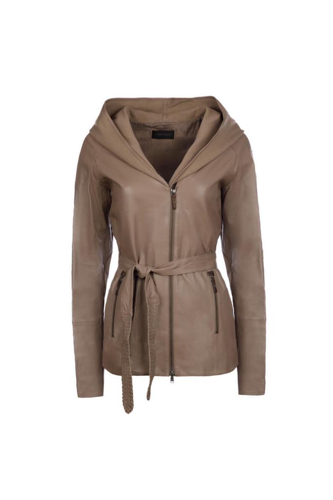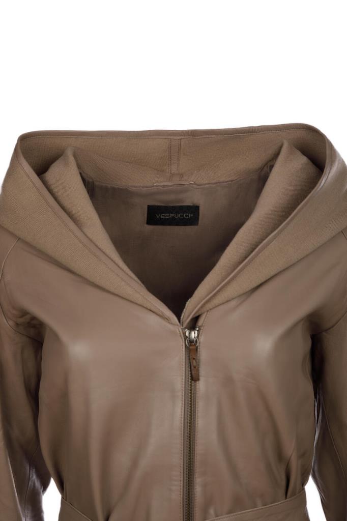Шикарная женская куртка от Vespucci из мягкой натуральной телячьей кожи коричневого цвета с эффектным объёмным, слегка контрастным трикотажным капюшоном.