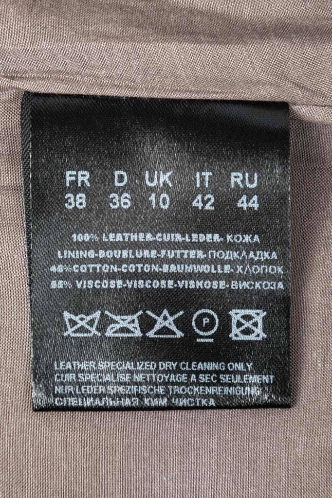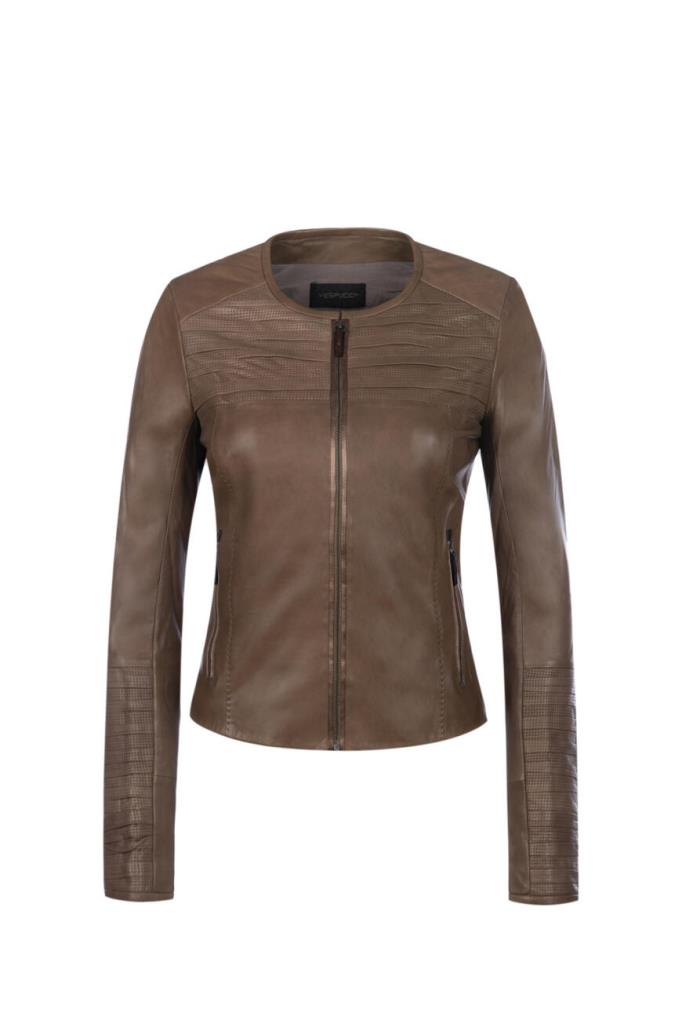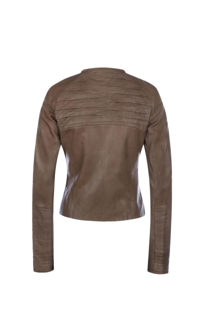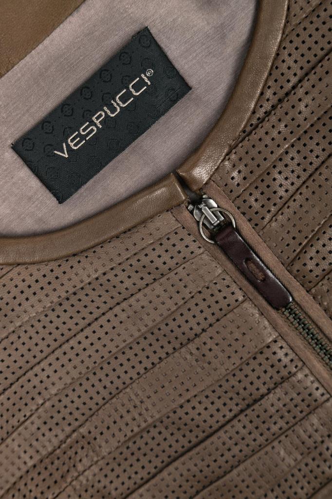 Стильная женская куртка Vespucci из мягкой натуральной телячьей кожи коричневого цвета с оригинальным перфорированным геометричесим узором в виде рельефных полос спереди и сзади на уровне груди и на рукавах ниже уровня локтя.
