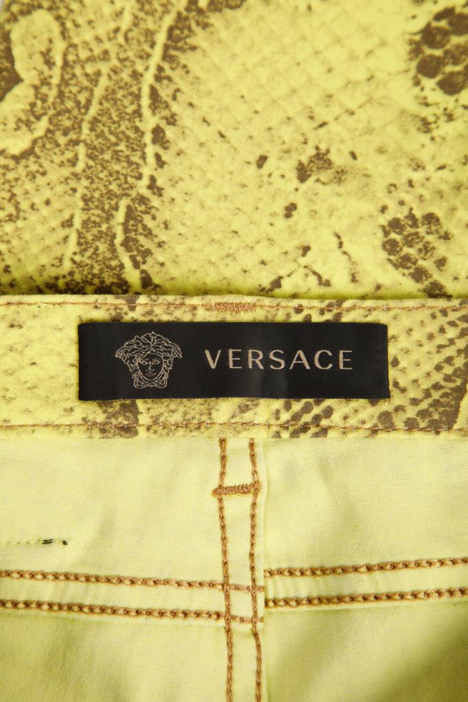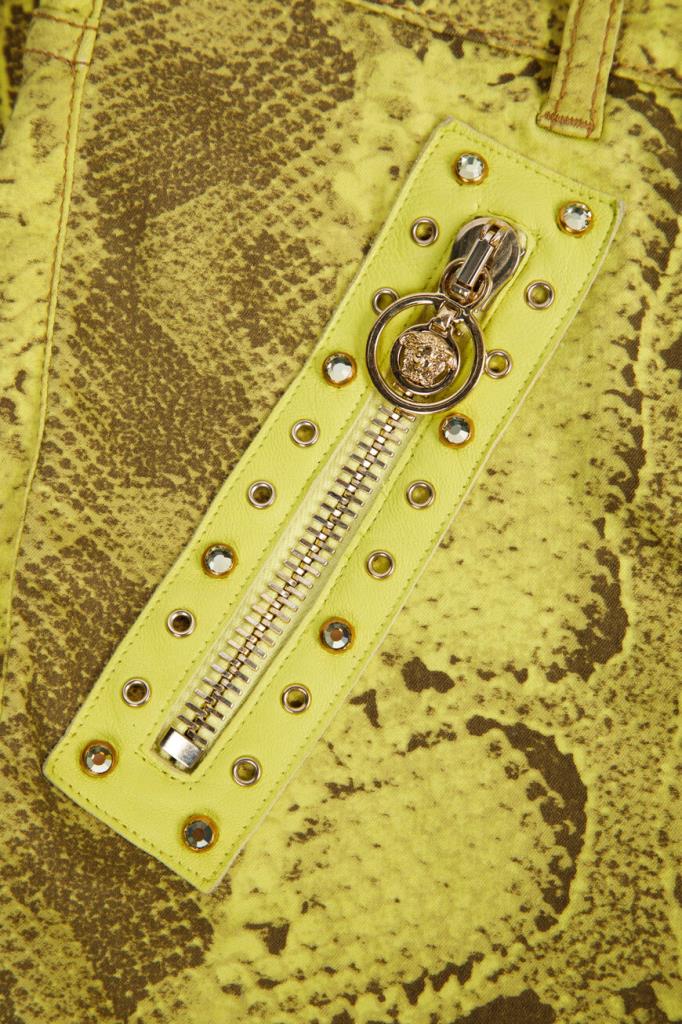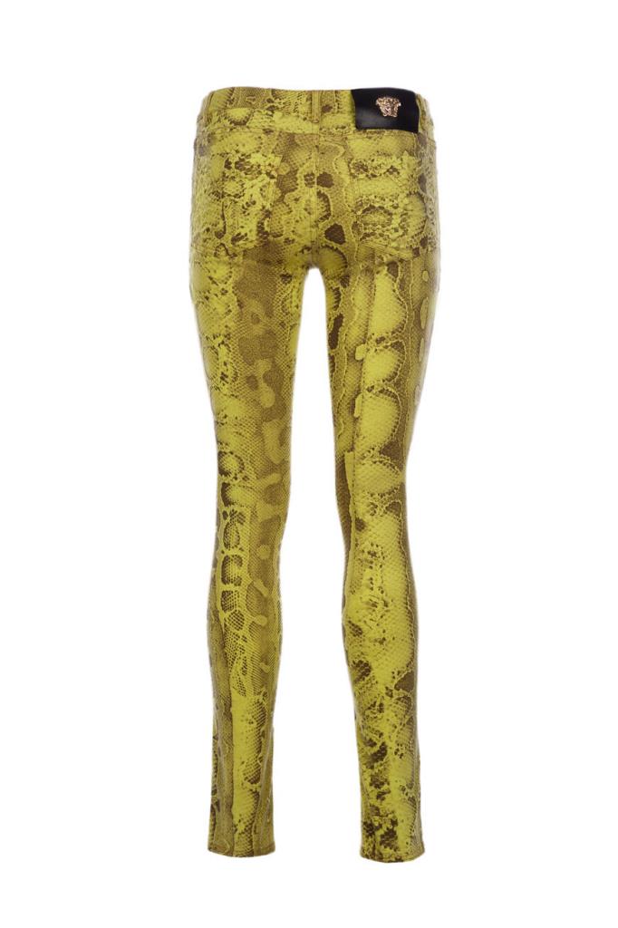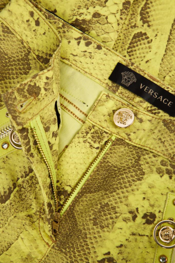 Роскошные женские джинсы Versace из мягкого эластичного денима на основе хлопка и прочного фирменного нейлона изысканного жёлтого оттенка с оригинальным контрастный узором, имитирующим змеиную кожу, по всей поверхности изделия. Эффектная модель ультраоблегающего кроя, с плотным поясом со шлевками под ремень, удобной застёжкой на молнию и фирменную металлическую пуговицу, двумя прорезными карманами на молнии по бокам и накладными карманами сзади. Фишки изделия: контрастная чёрная кожаная накладка с серебристой металлической вставкой с монограммой бренда - изображением фирменной символики "Медуза" на поясе сзади и ультрамодные металлические кольца с инкрустацией блестящими переливающимися стразами на боковых карманах.
