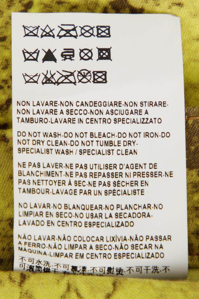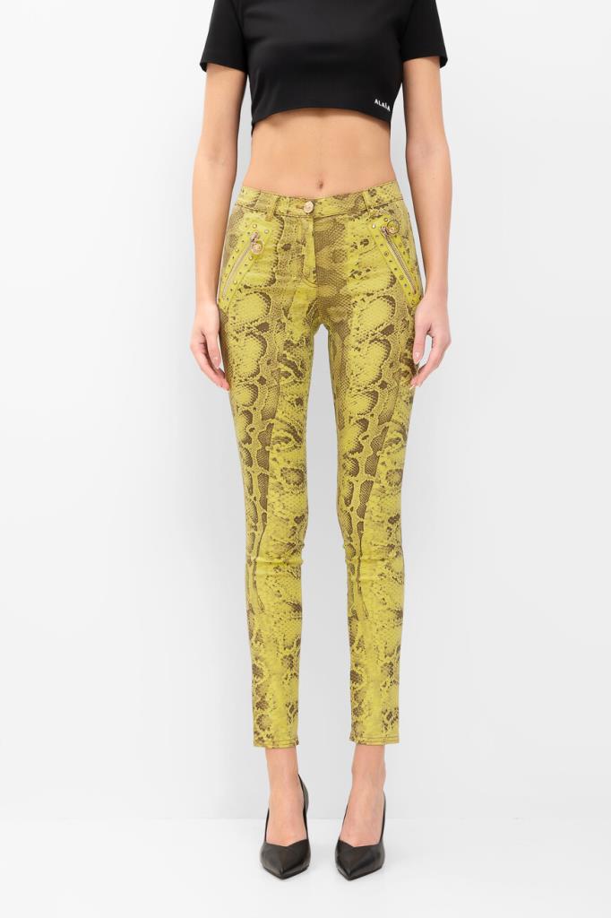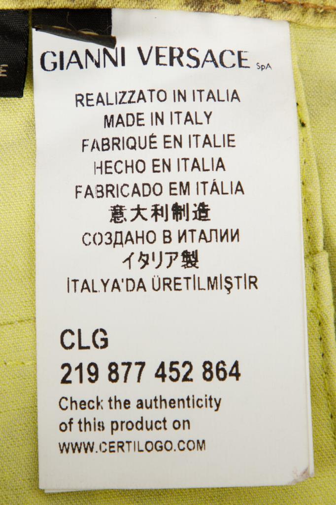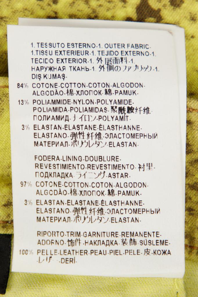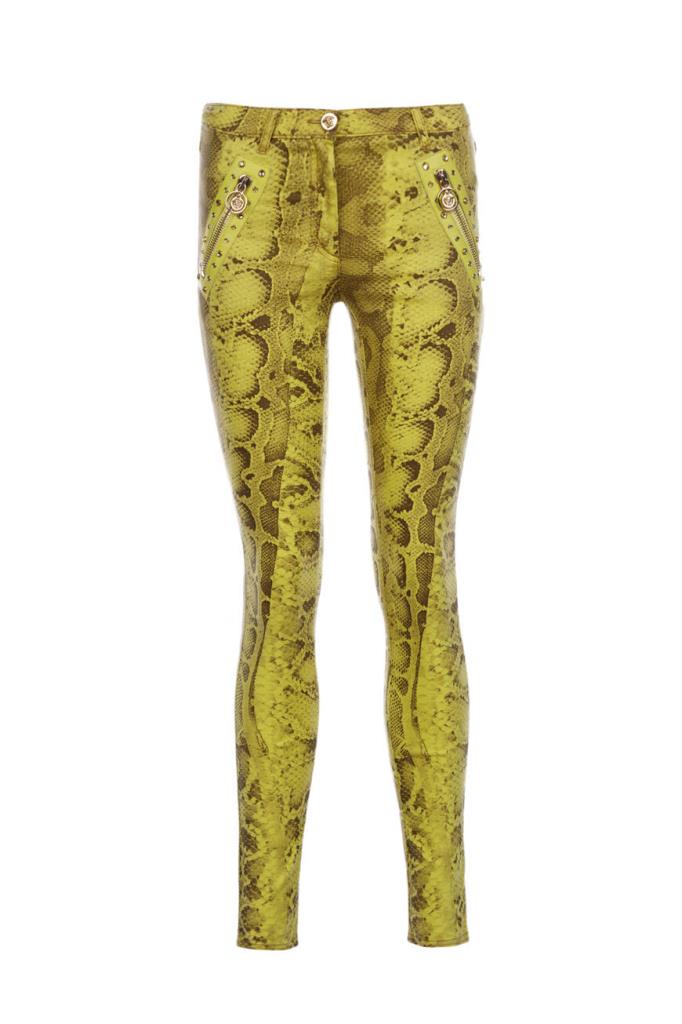 Роскошные женские джинсы Versace из мягкого эластичного денима на основе хлопка и прочного фирменного нейлона изысканного жёлтого оттенка с оригинальным контрастный узором, имитирующим змеиную кожу, по всей поверхности изделия. Эффектная модель ультраоблегающего кроя, с плотным поясом со шлевками под ремень, удобной застёжкой на молнию и фирменную металлическую пуговицу, двумя прорезными карманами на молнии по бокам и накладными карманами сзади. Фишки изделия: контрастная чёрная кожаная накладка с серебристой металлической вставкой с монограммой бренда - изображением фирменной символики "Медуза" на поясе сзади и ультрамодные металлические кольца с инкрустацией блестящими переливающимися стразами на боковых карманах.