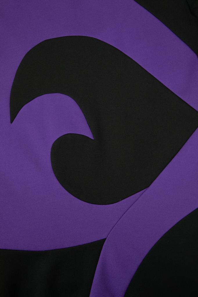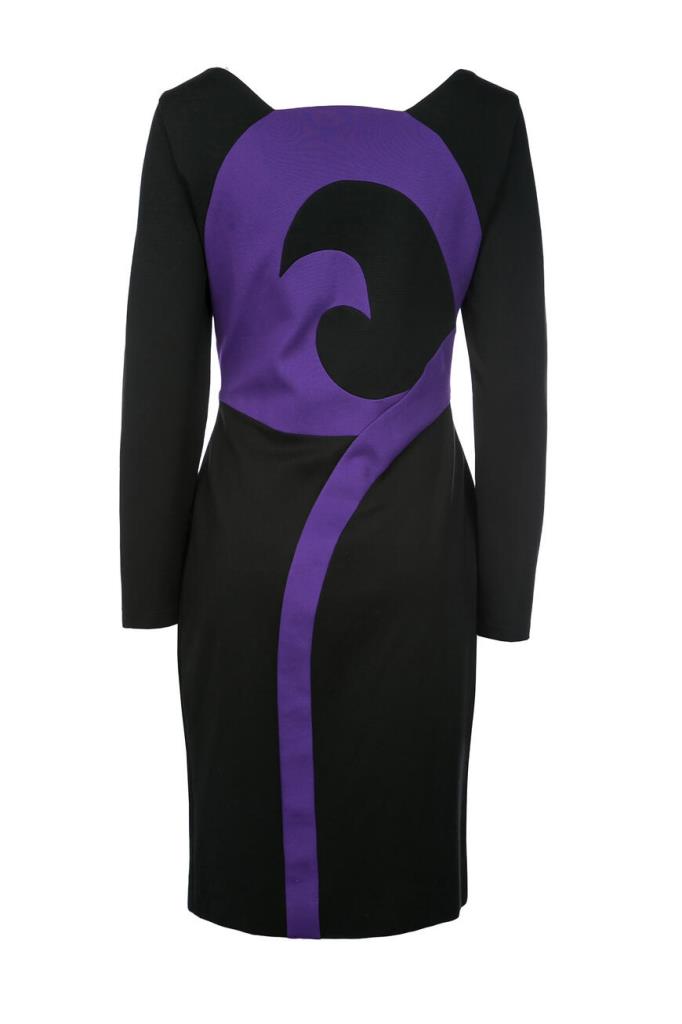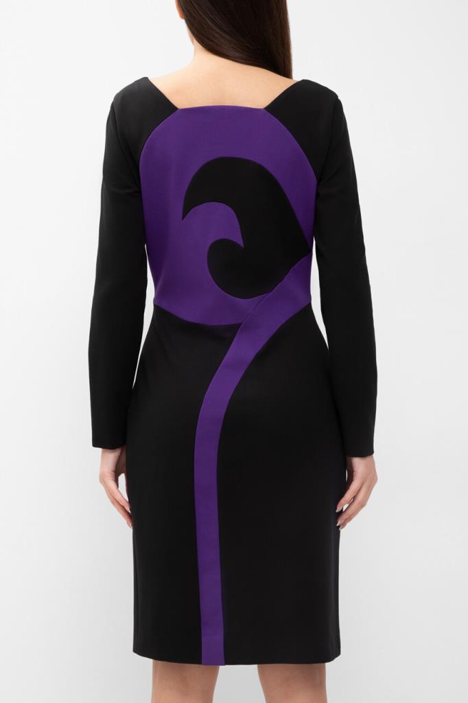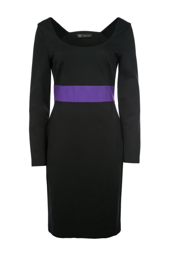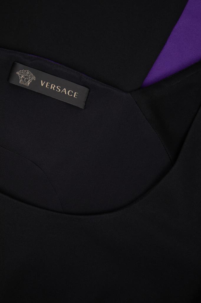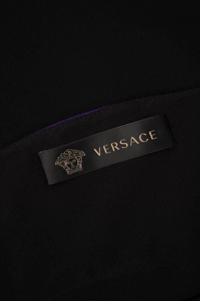 Изящное женское платье Versace из мягкого эластичного трикотажа на основе прочного фирменного нейлона и вискозного волокна чёрного цвета с оригинальным контрастным фиолетовым абстрактным дизайнерским узором сзади по всей длине изделия, который продолжается на "поясе" (узор) спереди.