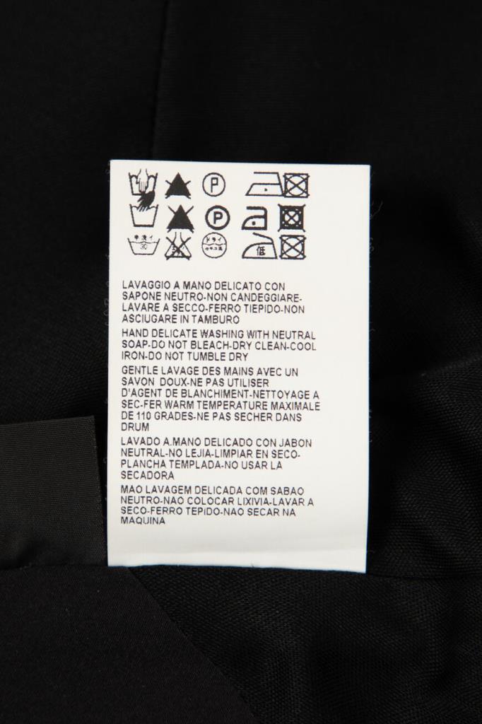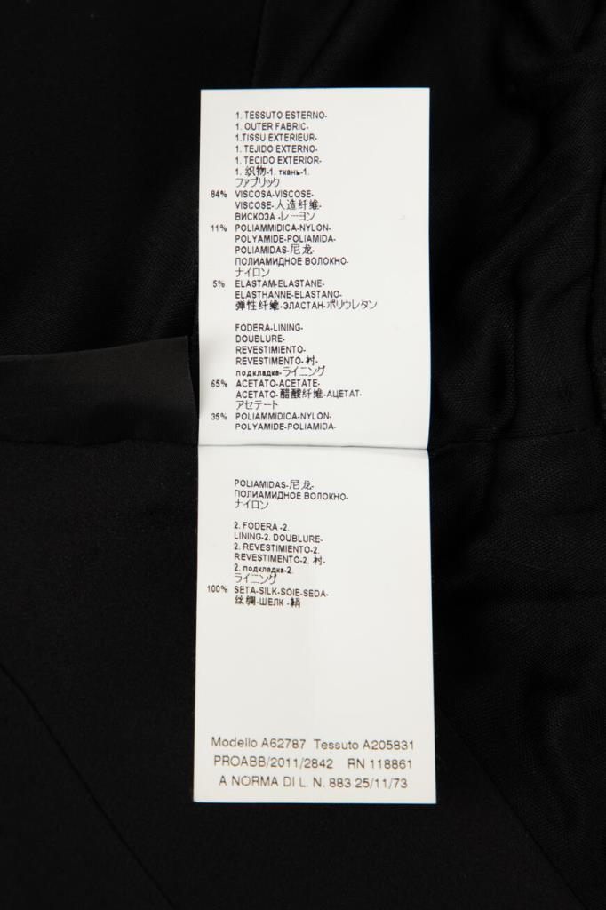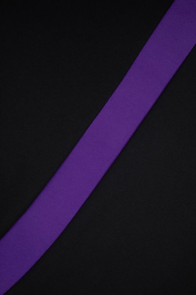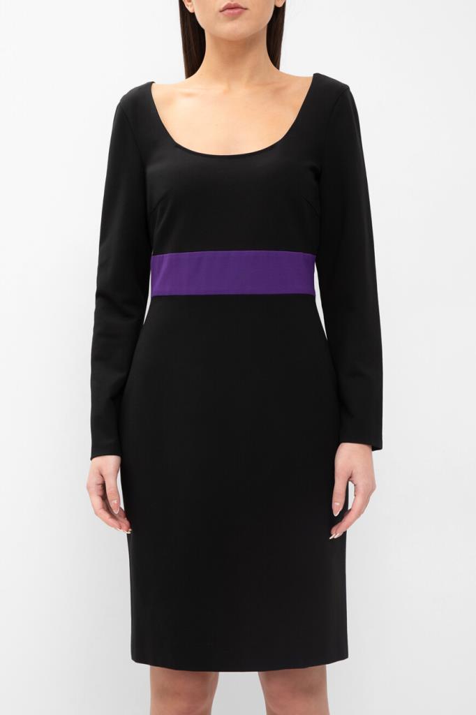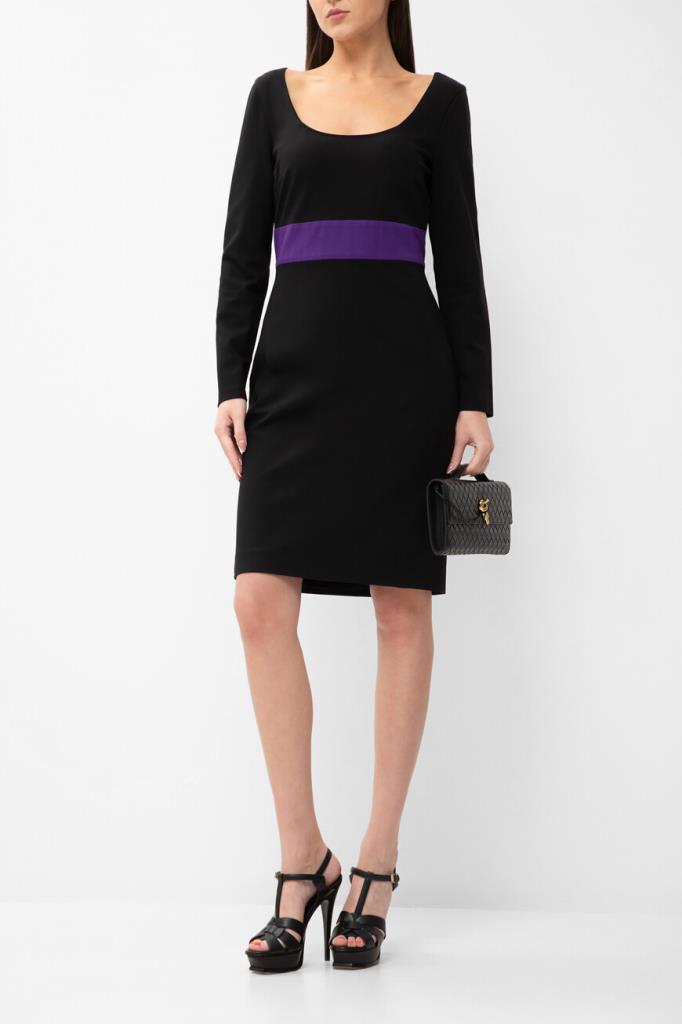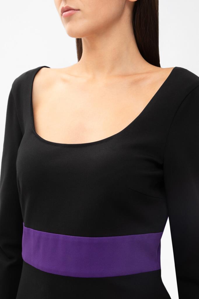 Изящное женское платье Versace из мягкого эластичного трикотажа на основе прочного фирменного нейлона и вискозного волокна чёрного цвета с оригинальным контрастным фиолетовым абстрактным дизайнерским узором сзади по всей длине изделия, который продолжается на "поясе" (узор) спереди.