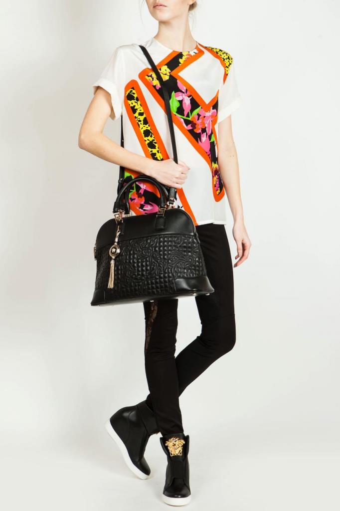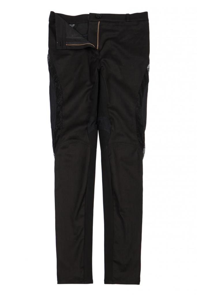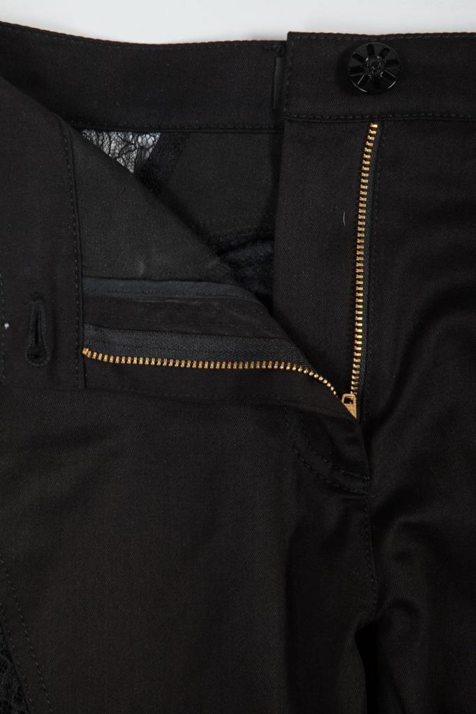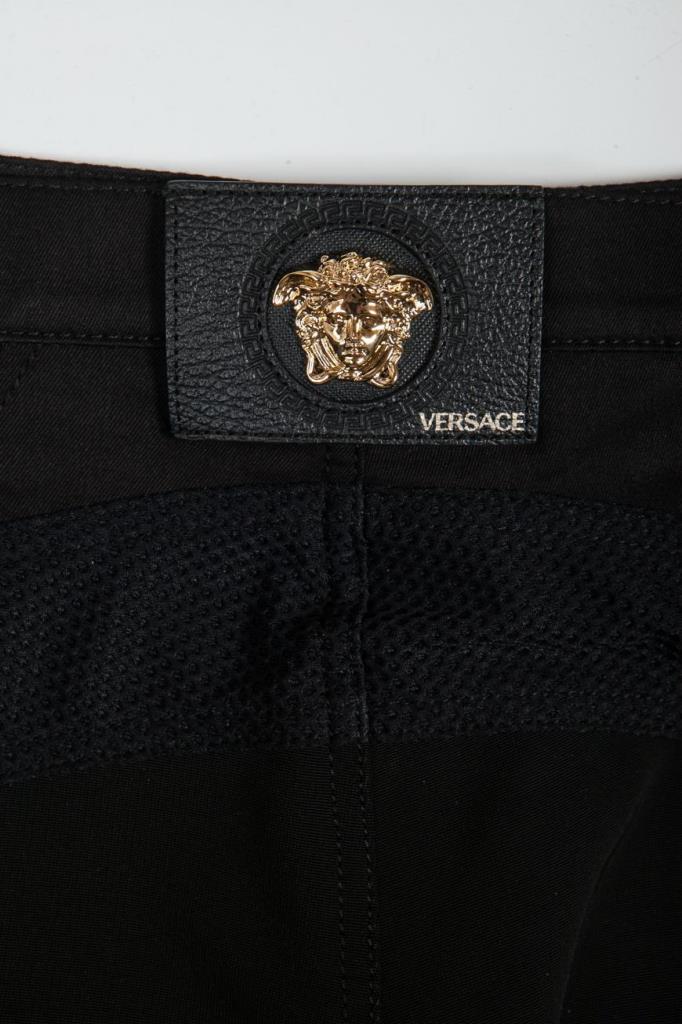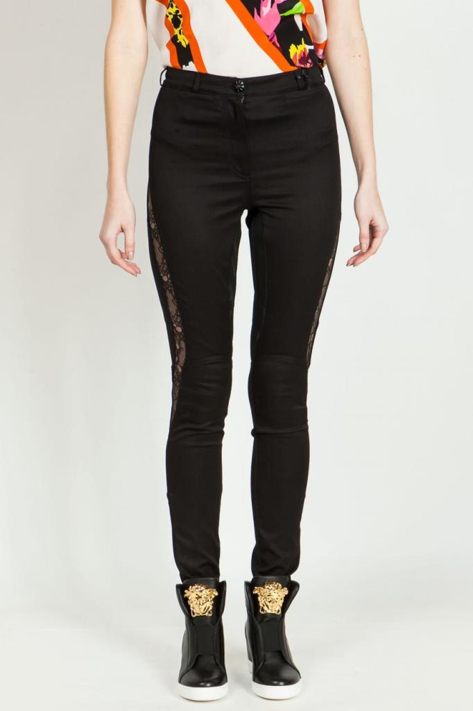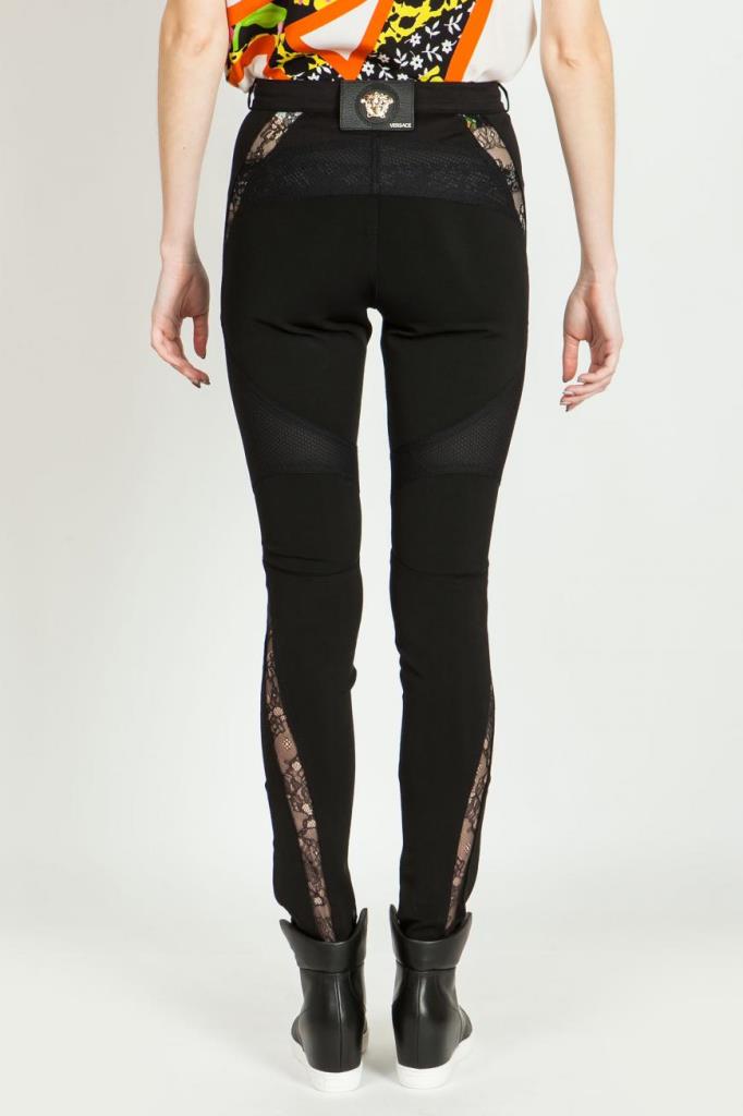 Стильные женские брюки-skinny от знаменитой итальянской марки VERSACE. Изготовлены из натурального хлопкового полотна со вставками из полиэстера. Крой у брюк сложный, дизайнерский. Сзади имеется несколько эластичных сетчатых вставок. С боков брюки украшают волнистые прозрачные кружевные вставки. Авторский дизайн дополняет нашивка из натуральной кожи с объемным логотипом, марки, выполненным из золотистого металла. Отлично сочетаются с футболками, блузами и толстовками из той же коллекции. Хорошо будут смотреться с обувью на высоком каблуке и танкетке.