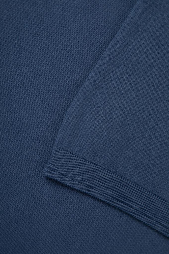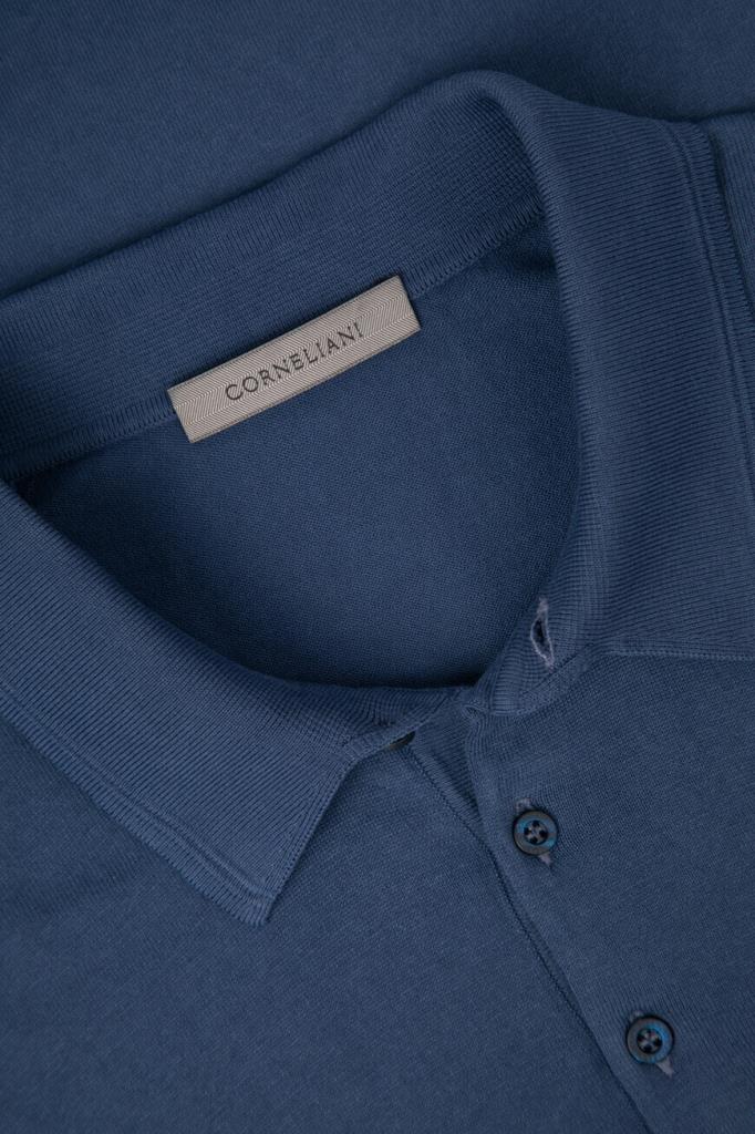 Синее поло CORNELIANI с минималистичным декором. Изделие сшито из мягкого хлопкового трикотажа и украшено двойной рельефной окантовкой на воротнике, манжетах и поясе. Модель отличается застёжкой на брендированные роговые пуговицы сверху и сочетается с прямыми брюками из эластичного хлопкового габардина из той же коллекции.
