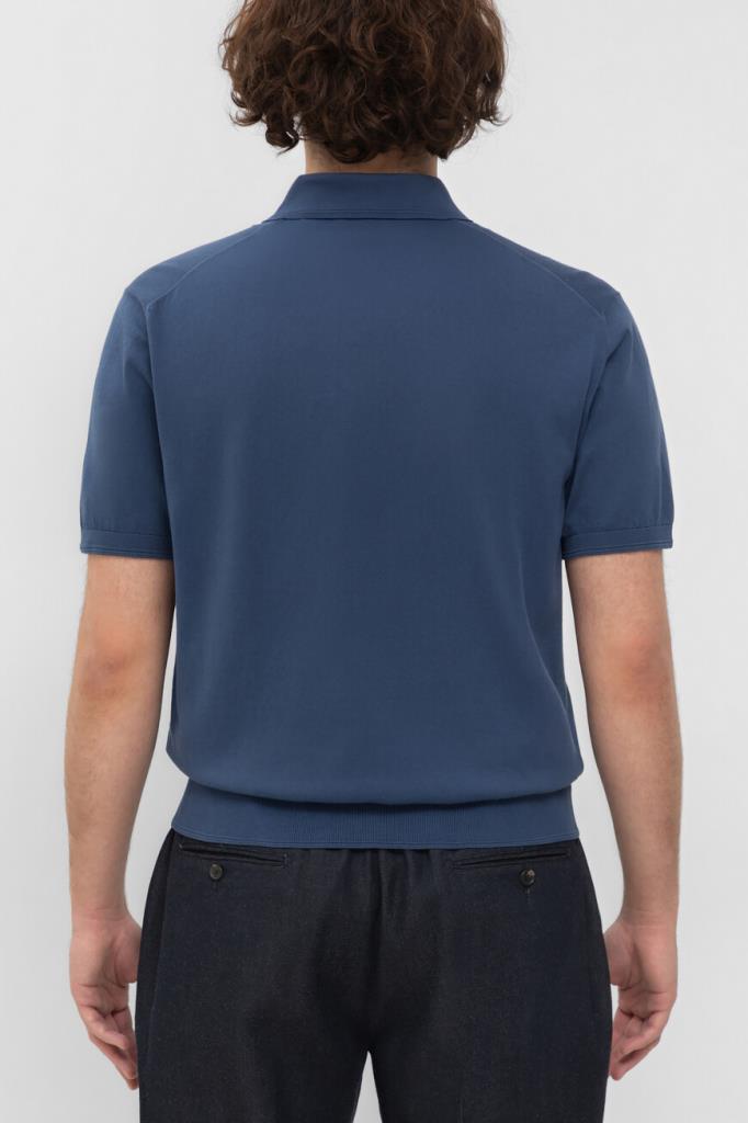 Синее поло CORNELIANI с минималистичным декором. Изделие сшито из мягкого хлопкового трикотажа и украшено двойной рельефной окантовкой на воротнике, манжетах и поясе. Модель отличается застёжкой на брендированные роговые пуговицы сверху и сочетается с прямыми брюками из эластичного хлопкового габардина из той же коллекции.