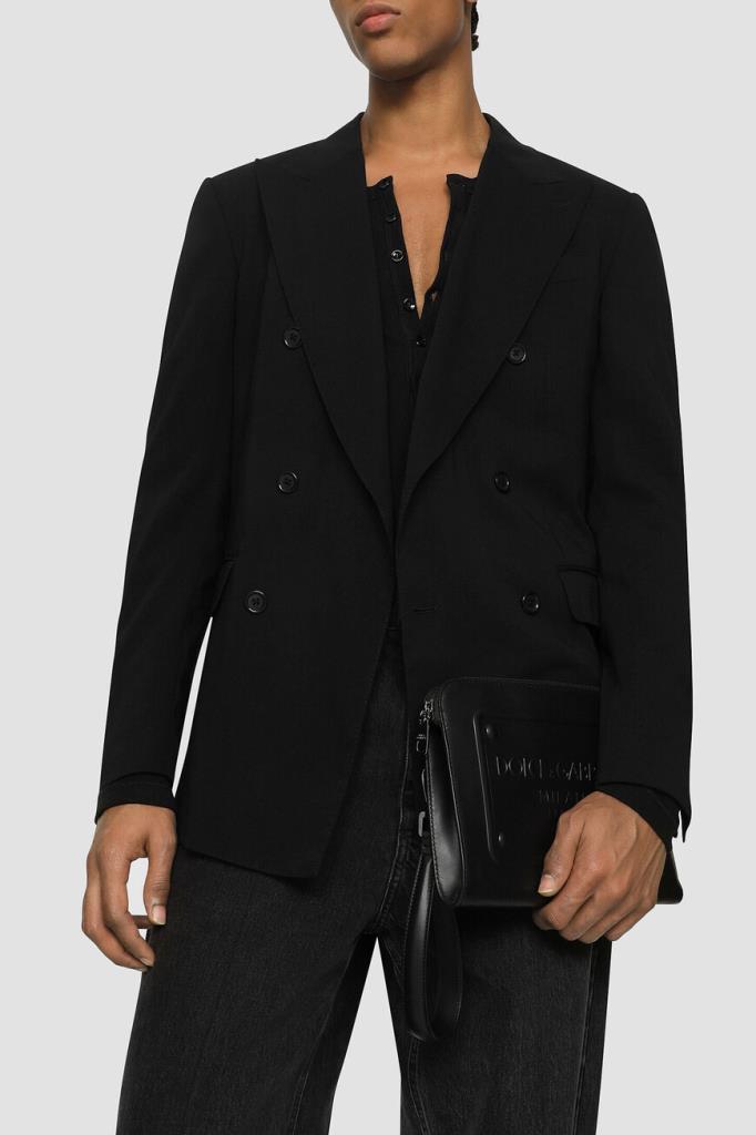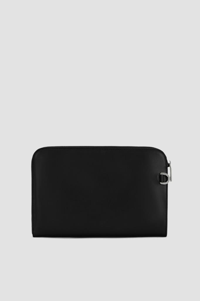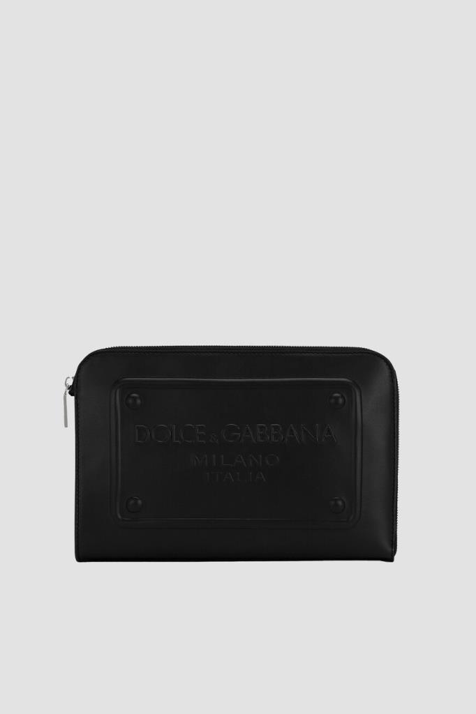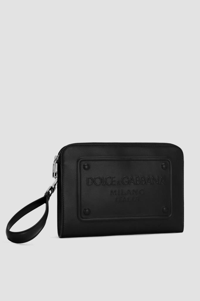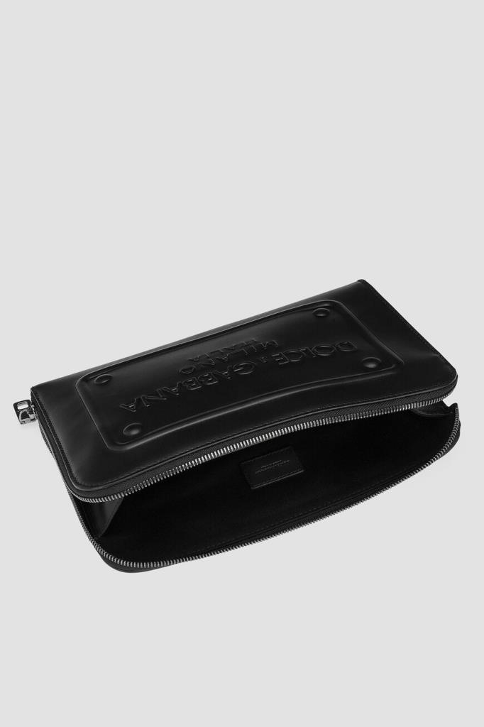 Компактный клатч из натуральной гладкой кожи телёнка от Dolce & Gabbana. Изделие прямоугольного формата выполнено в чёрном цвете и оснащено круговой застёжкой-молнией с брендированным бегунком. О принадлежности модели бренду напоминает рельефная прямоугольная вставка с трёхмерными лого и надписью «Dolce&Gabbana Milano» спереди.