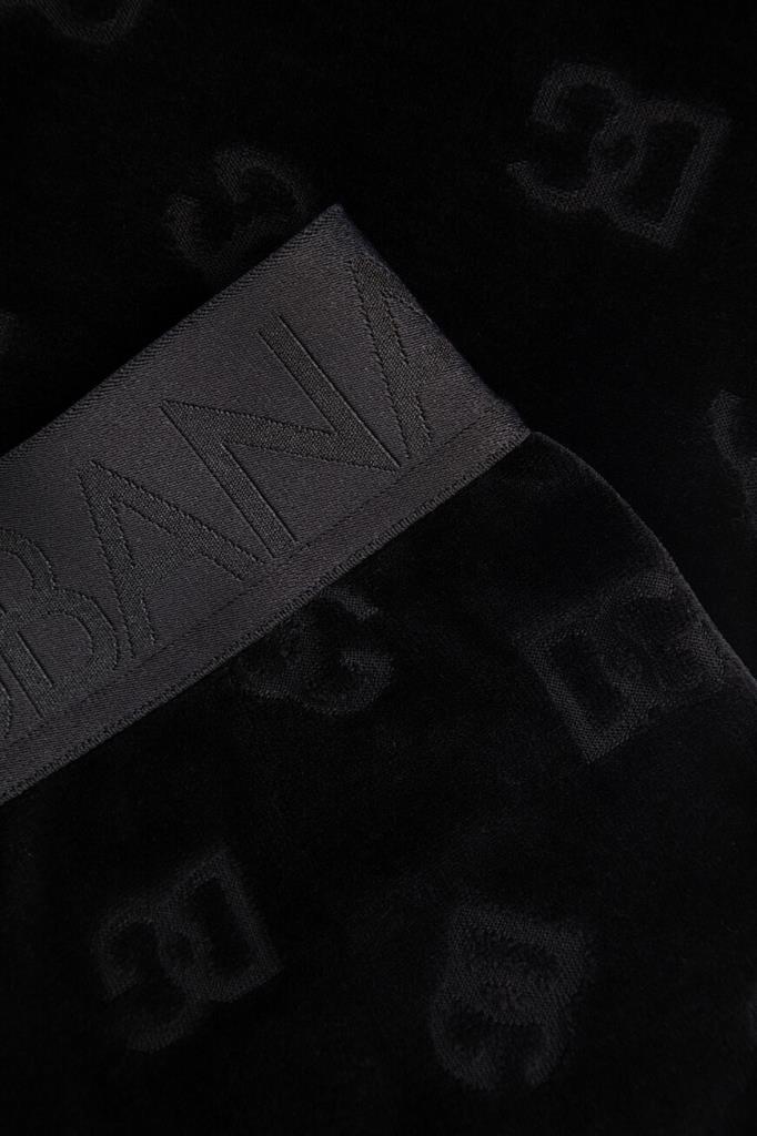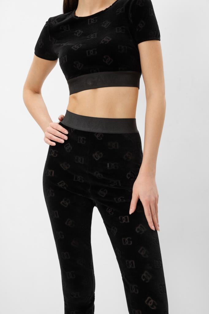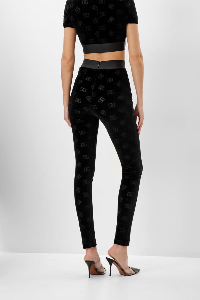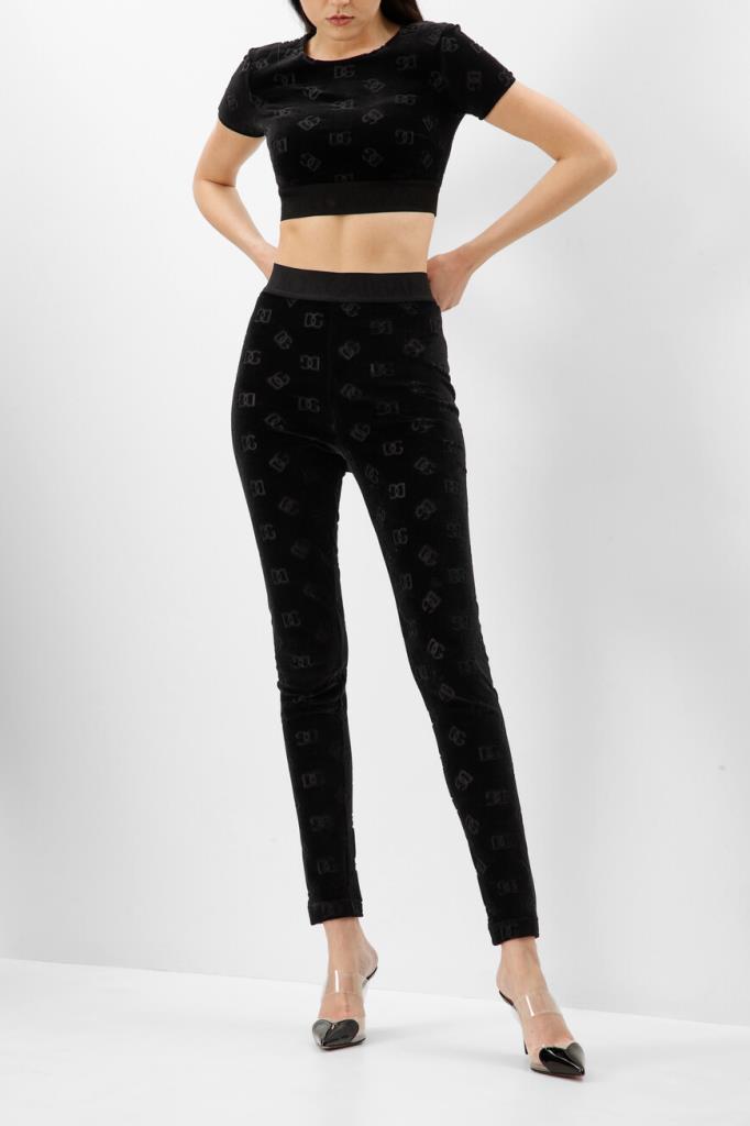 Чёрные облегающие леггинсы высокой посадки от Dolce & Gabbana. Для создания модели выбрано мягкое флокированное джерси на основе хлопка. Отличительной особенностью стал жаккардовый принт в виде лого-монограммы бренда. Изделие застёгивается на короткую молнию сзади и смотрится гармонично с брендированным топом из той же коллекции.