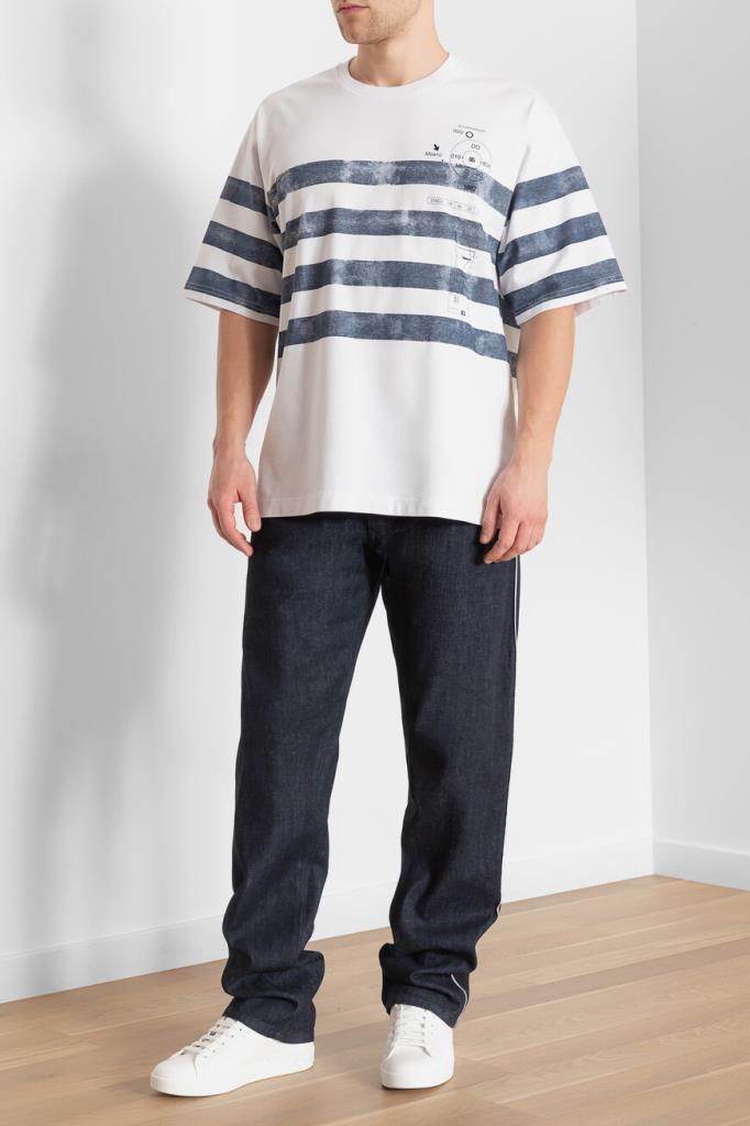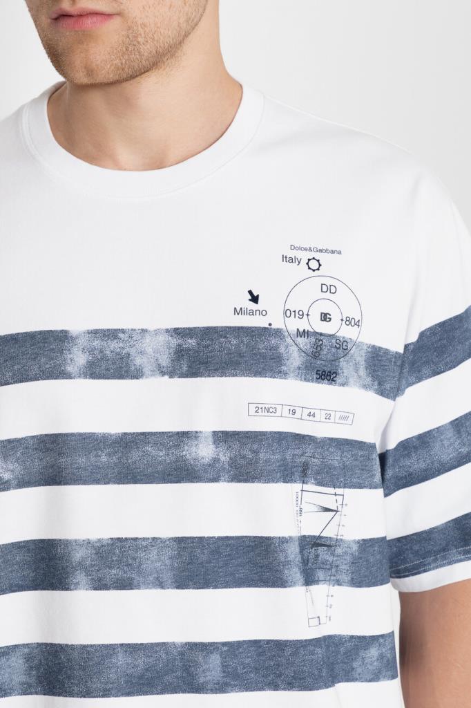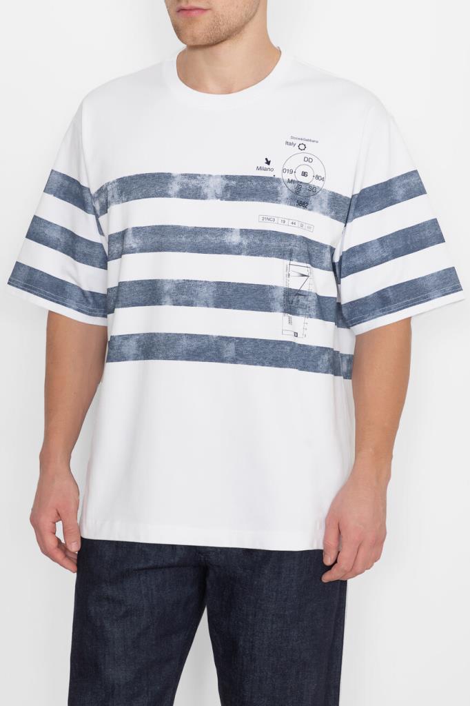 Белая футболка Dolce&Gabbana с морским принтом выполнена из чистого хлопка. Классическая модель прямого кроя интересна фирменным принтом Marina — новой дизайнерской интерпретацией тельняшки. Футболка станет отличным дополнением к повседневному гардеробу.