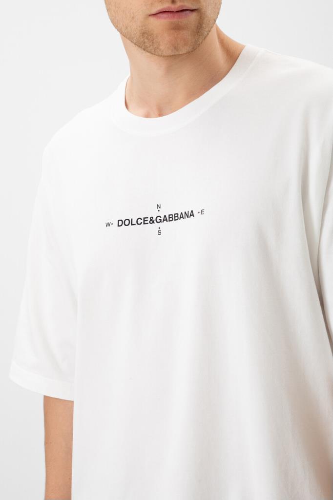 Футболка с круглым вырезом горловины на резинке от Dolce & Gabbana. Изделие из коллекции Marina, навевающей мечты о Средиземном море в его многообразии оттенков синего, сшито из мягкого хлопкового джерси. Передняя и задняя стороны модели дополнены графичным принтом, отсылающим к морской навигации, и фирменным брендингом на белом фоне.