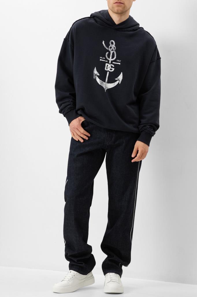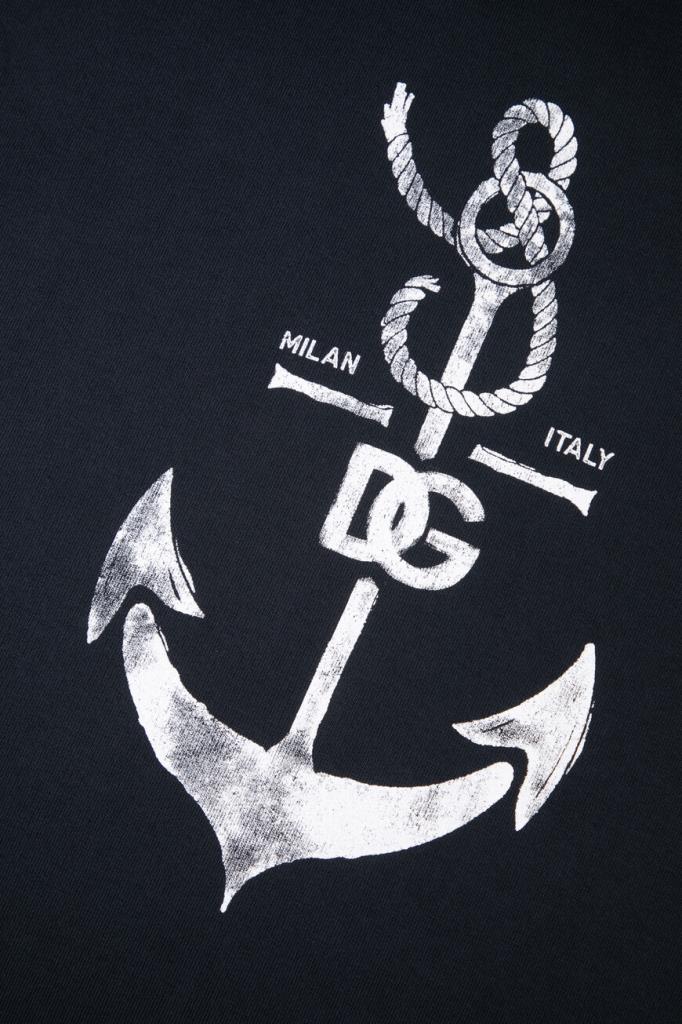 Худи с глубоким капюшоном от Dolce & Gabbana. Для создания модели свободного кроя используется тёмно-синее хлопковое джерси. Изделие входит в коллекцию Marina, навевающую мечты о Средиземном море в его многообразии оттенков синего. Спереди изображён якорь, дополненный культовой монограммой DG и надписями «Milan» и «Italy».