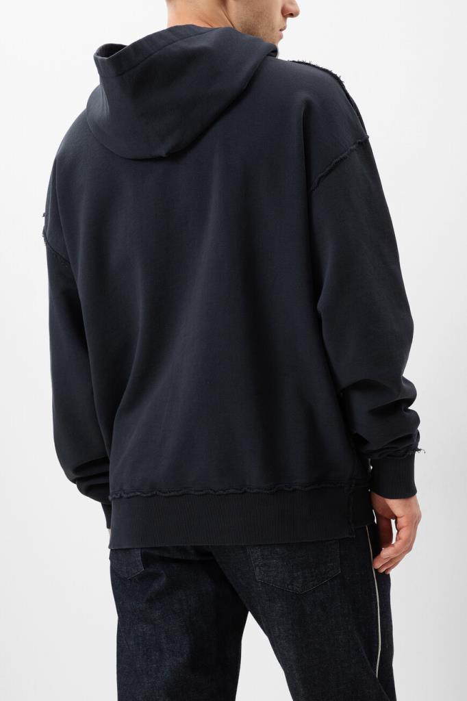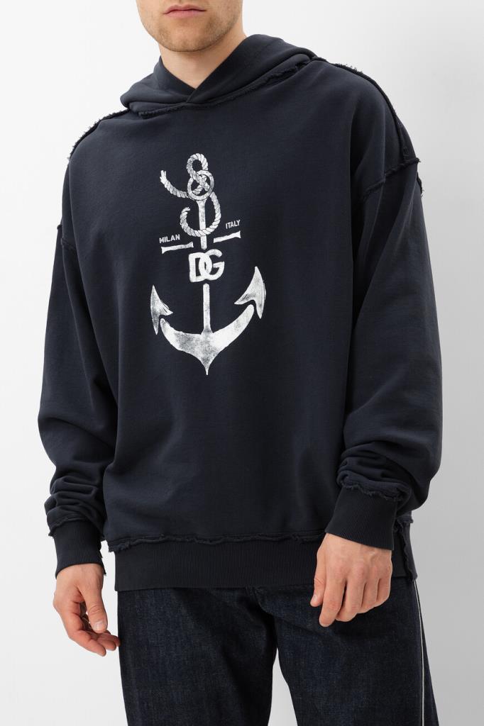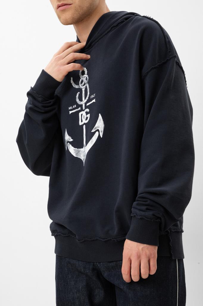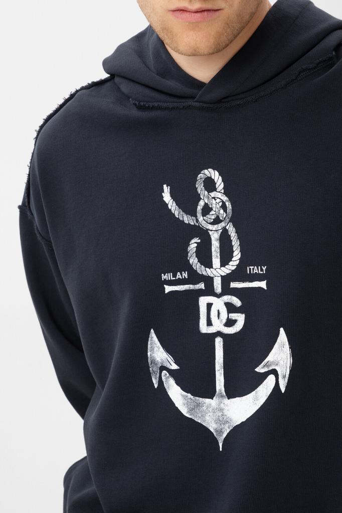 Худи с глубоким капюшоном от Dolce & Gabbana. Для создания модели свободного кроя используется тёмно-синее хлопковое джерси. Изделие входит в коллекцию Marina, навевающую мечты о Средиземном море в его многообразии оттенков синего. Спереди изображён якорь, дополненный культовой монограммой DG и надписями «Milan» и «Italy».
