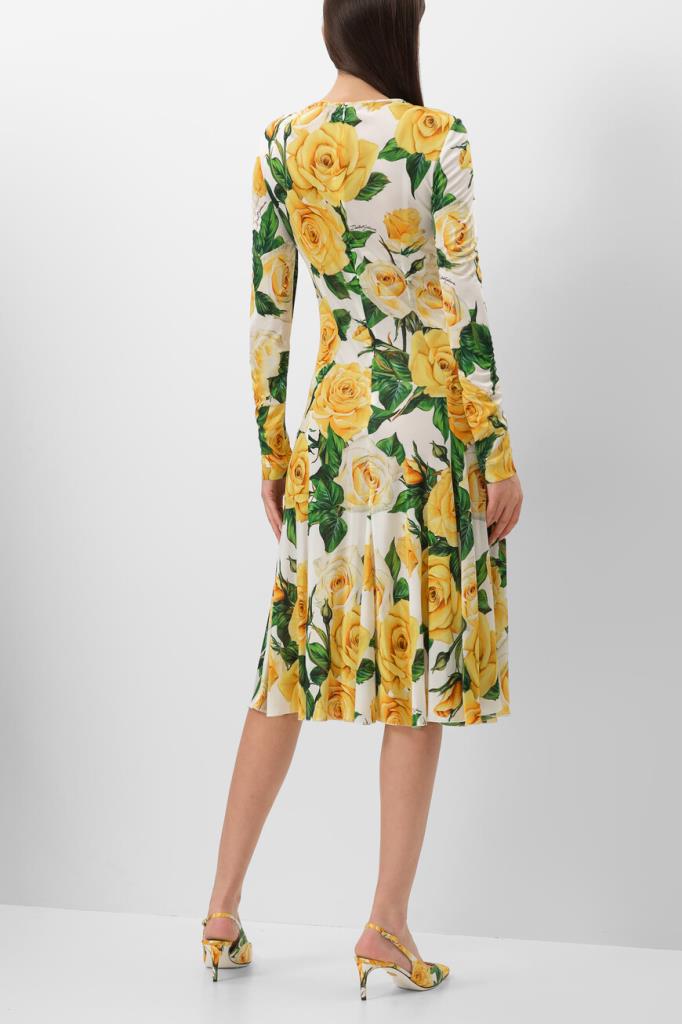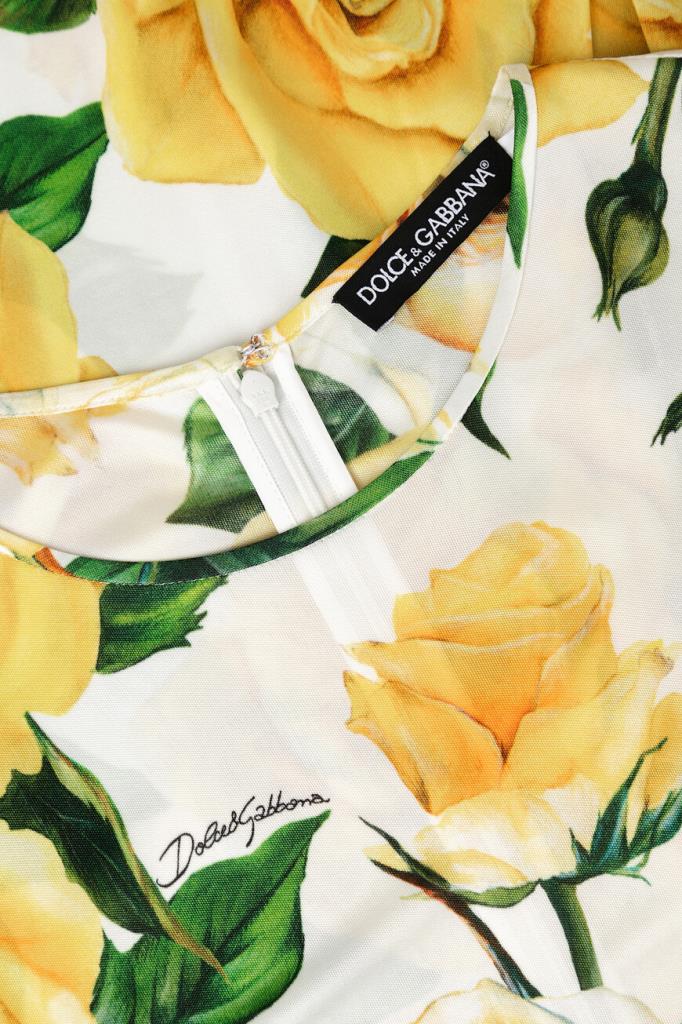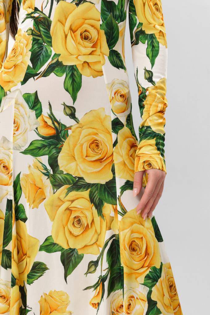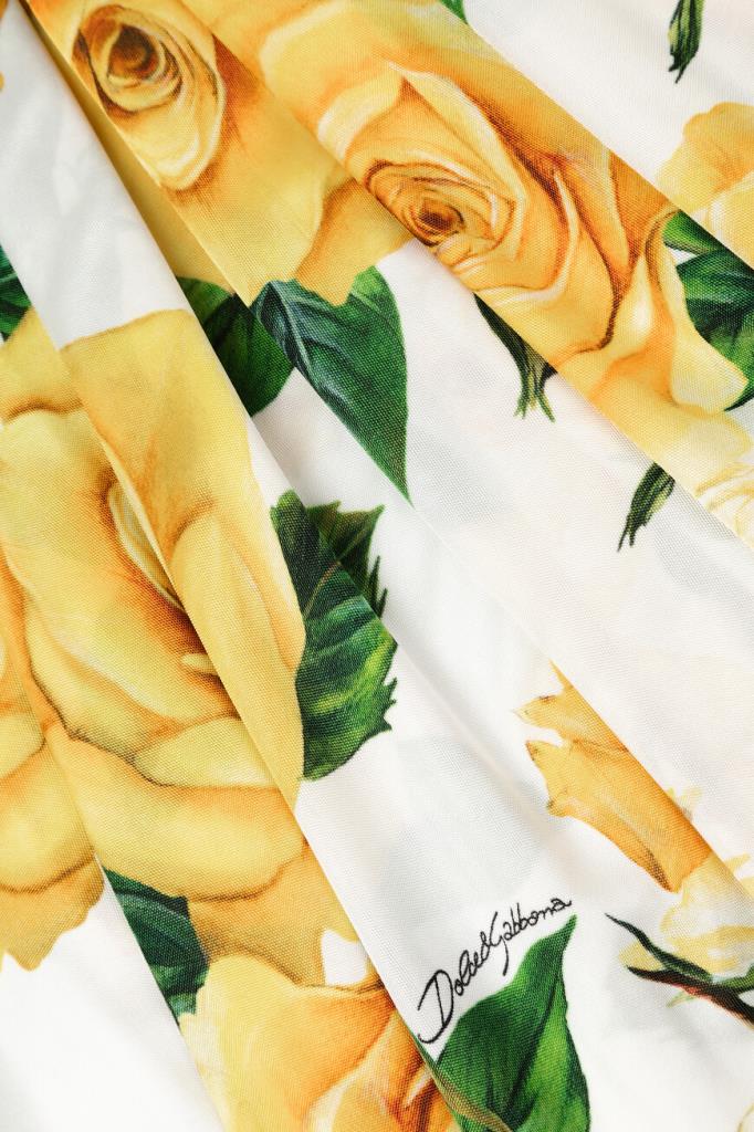 Белое платье из органзы с ярким принтом в виде жёлтых роз от Dolce&Gabbana. Коллекция Flowering заставляет нас мечтать о далёких тёплых уголках этого мира, соединяя воедино белый, лимонно-жёлтый и различные оттенки зелёного. Изделие на основе прочного вискозного волокна отличается изящным округлым вырезом горловины и подолом в широкую складку. Дизайнерская модель-миди застёгивается на потайную молнию и крючок сзади. Дополните образ культовой сумкой Sicily и туфлями Lollo на устойчивом каблуке-шпильке средней высоты того же бренда.