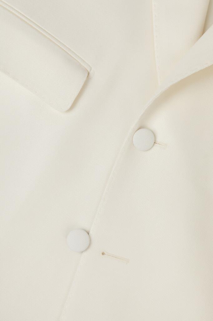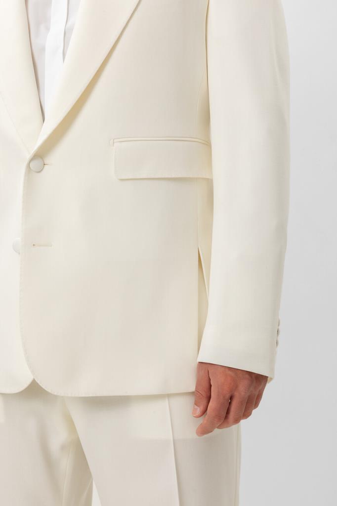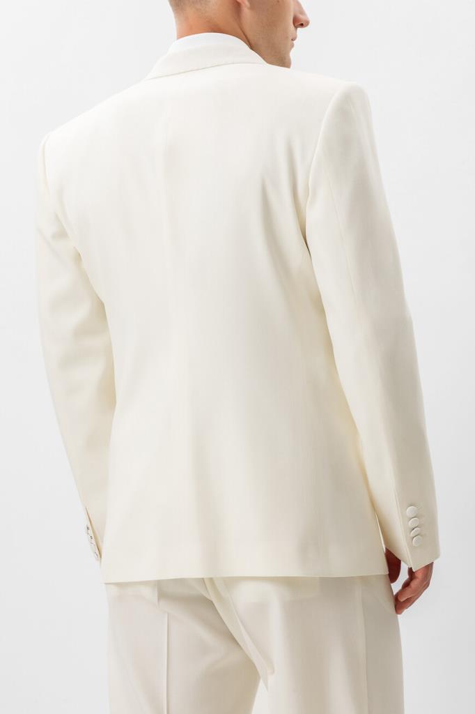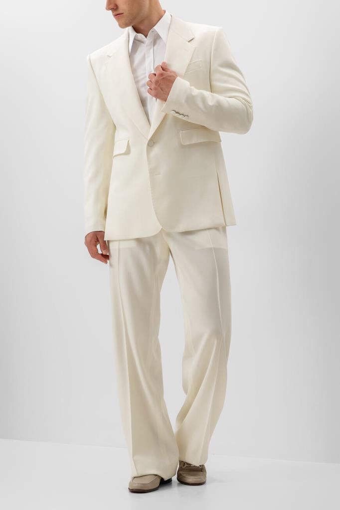 Белый пиджак из натуральной вирджинской шерсти стрейч от Dolce & Gabbana. Коллекция «Stile» сезона весна-лето 2024 отражает уникальный и неповторимый стиль Модного Дома, возвращение к своим корням и культовой ДНК бренда. Отличительной особенностью модели стали изящные боковые разрезы снизу. Изделие смотрится гармонично в сочетании с хлопковой сорочкой и брюками с классическими стрелками из той же коллекции.