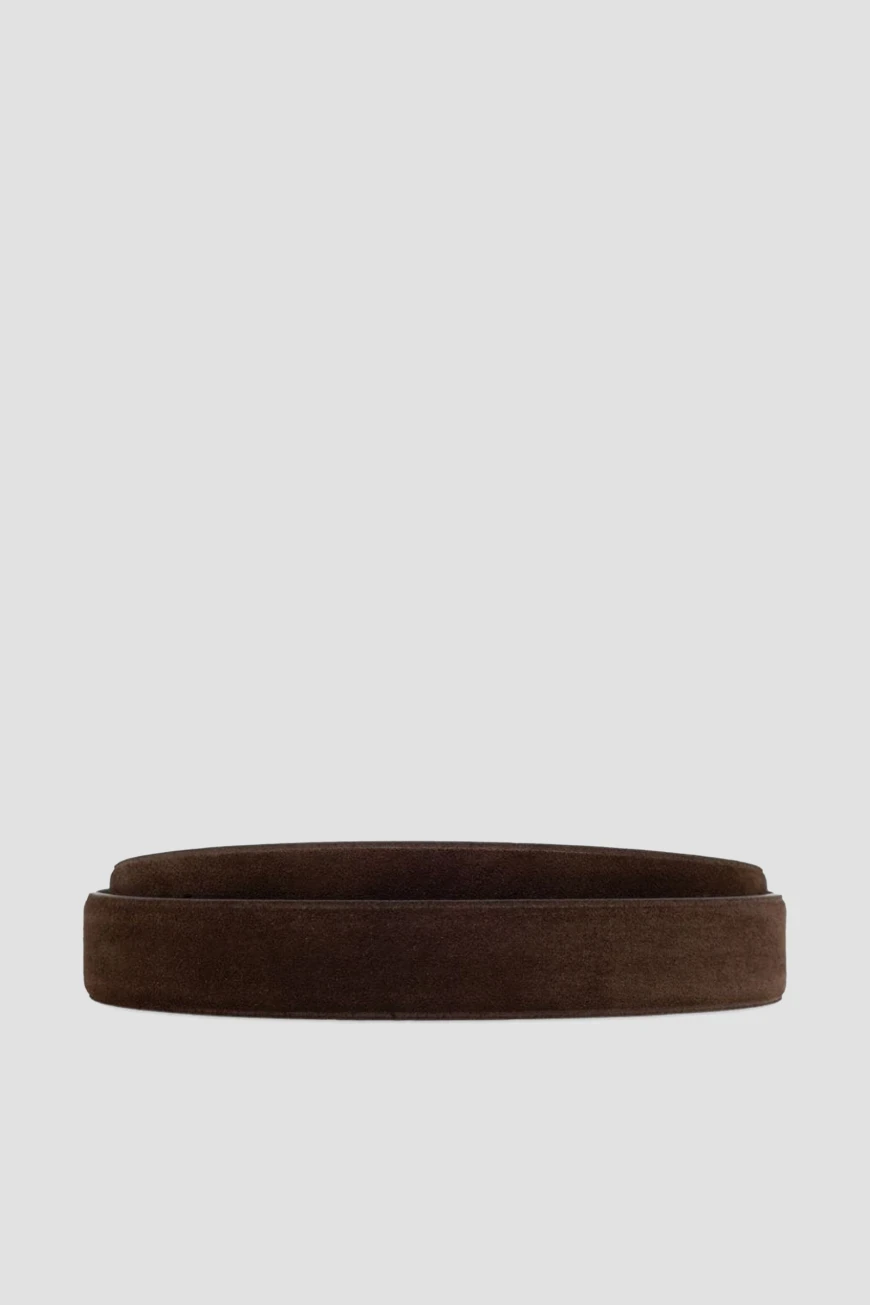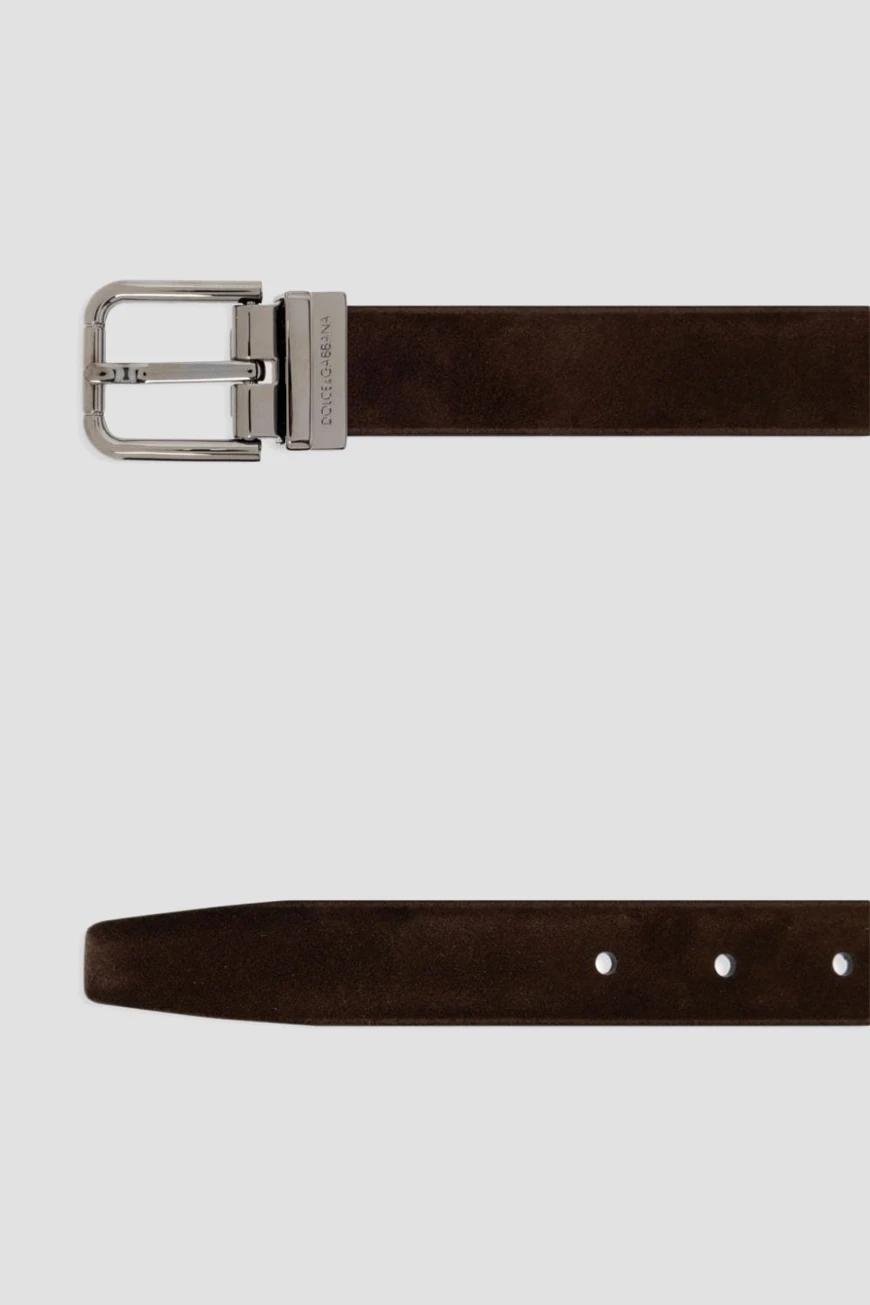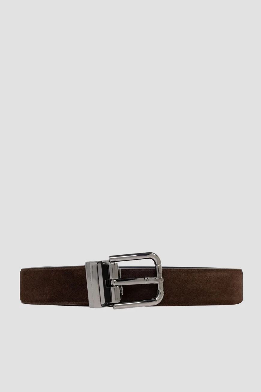 Замшевый ремень Dolce & Gabbana станет неотъемлемой частью Вашего гардероба. Изделие выполнено в тёмно-коричневом оттенке с серебристой декоративной фурнитурой. Матовая отделка придаёт модели уникальный характер и в то же время обеспечивает универсальность в сочетании с различными стилями, от формального до повседневного. Принадлежность аксессуара Дому подчёркивается выгравированным логотипом на металлическом тренчике.