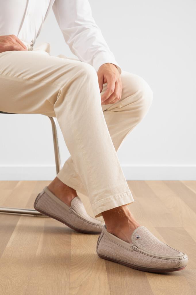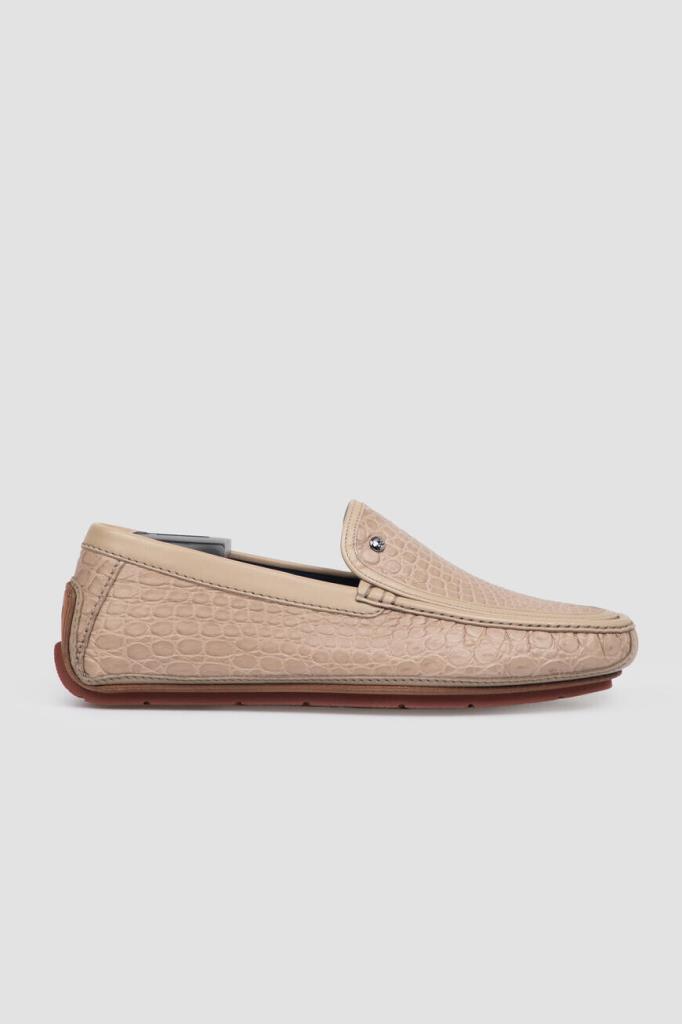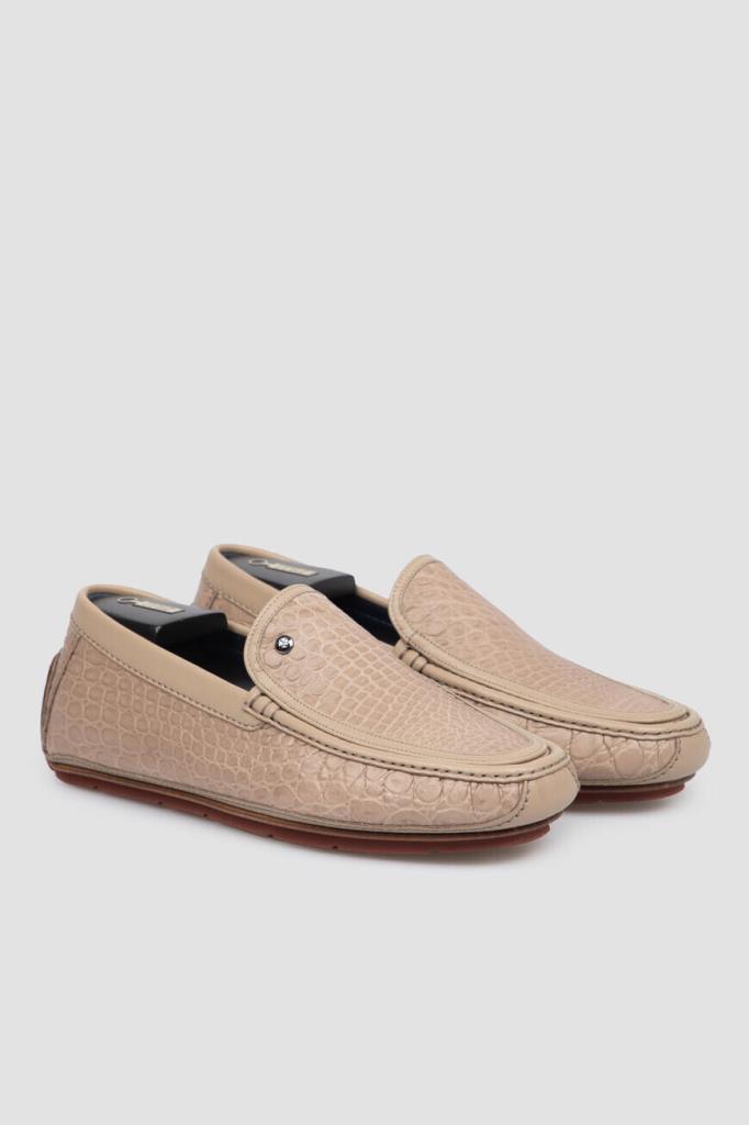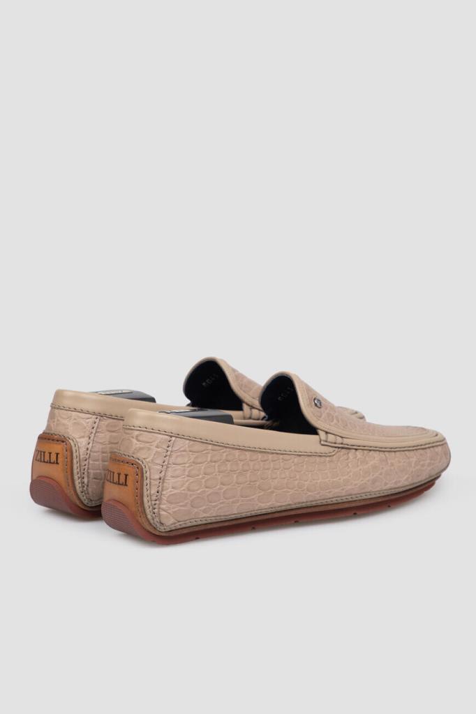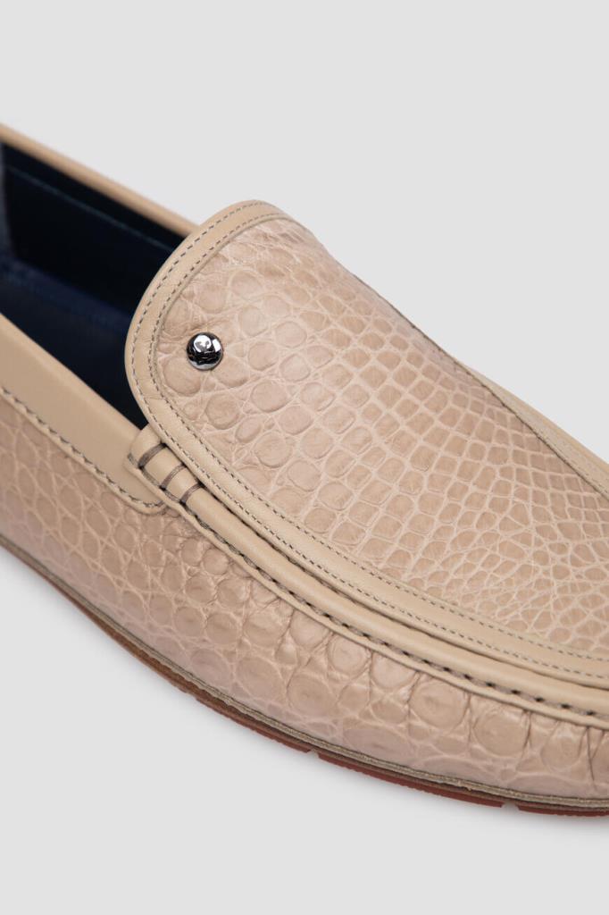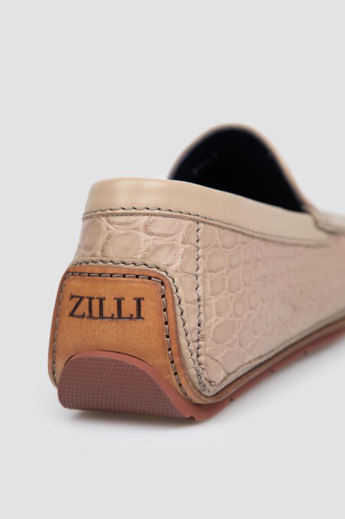 Мокасины Zilli с эмблемой бренда из латуни с палладиевым покрытием. Для создания модели выбрана фактурная кожа каймана бежевого оттенка. Отличительная особенность - окантовка из мягкой телячьей кожи сверху и на мыске в тон. Задник укреплён брендированной накладкой светло-коричневого оттенка.