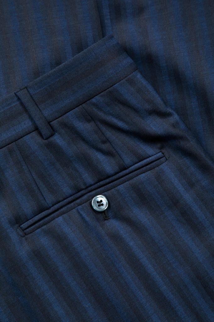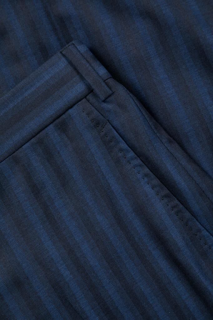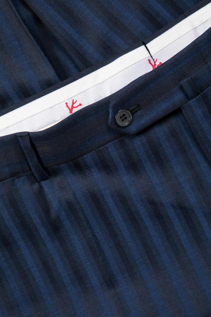 Классические мужские брюки Isaia из лёгкого мягкого льна синего цвета с оригинальным контрастным чёрно-серым узором в полоску по всей поверхности изделия. Комфортная модель прямого кроя, среднего облегания, с плотным поясом со шлевками под ремень, классическими стрелками без защипов, удобной застёжкой на молнию и пуговицы с планкой, двумя прорезными карманами с диагональным входом по бокам и прорезными карманами на пуговице сзади. Фишка изделия: внутренняя сторона пояса декорирована белой полосой с культовым повторяющимся мотивом бренда - красной коралловой ветвью. Брюки также дополнены подкладкой из мягкого трикотажа на основе хлопка и модала контрастного белого цвета.