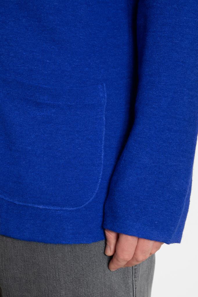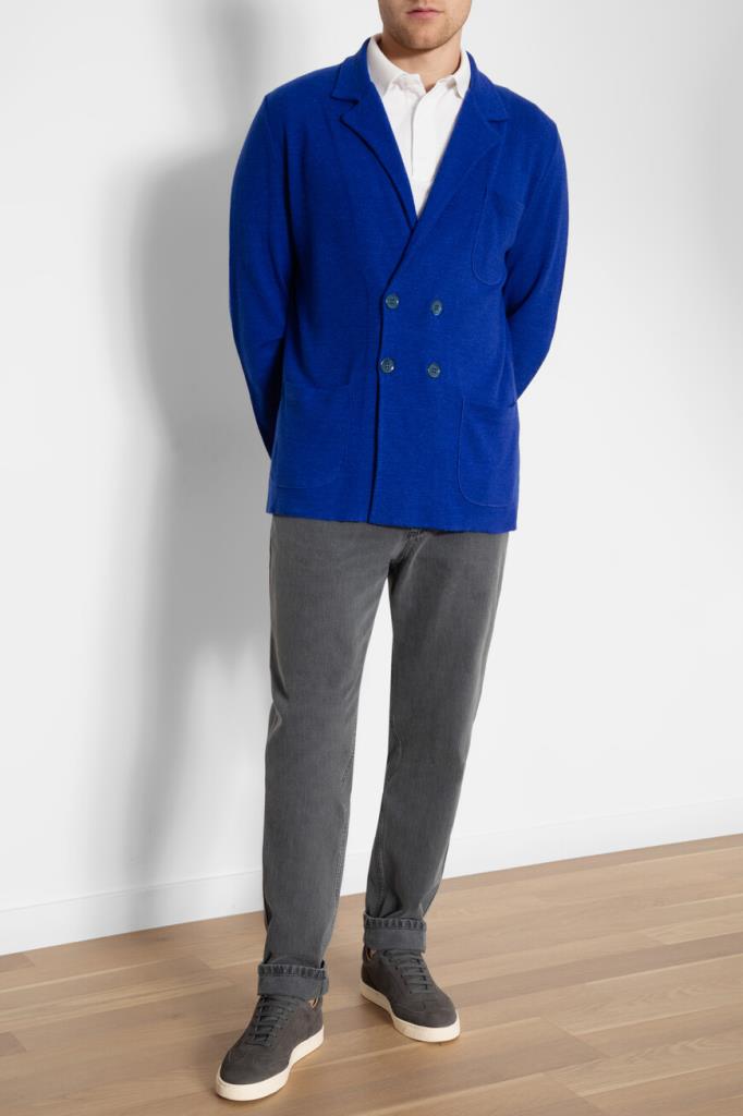 Мужской пиджак из мягкого кашемира и льна синего цвета от Isaia. Короткая двубортная модель застёгивается на крупные роговые пуговицы. Особенностью изделия стала подкладка из натуральной шерсти в тон. Образ можно дополнить тёмно-серыми джинсами с подворотами и сникерами из нубука Texture от Brunello Cucinelli.